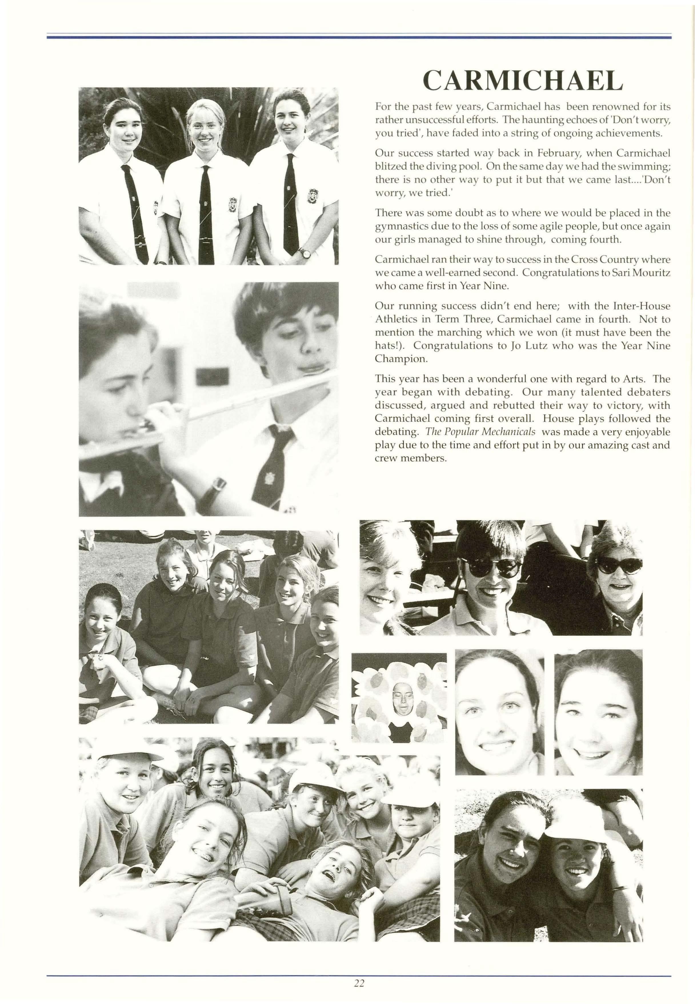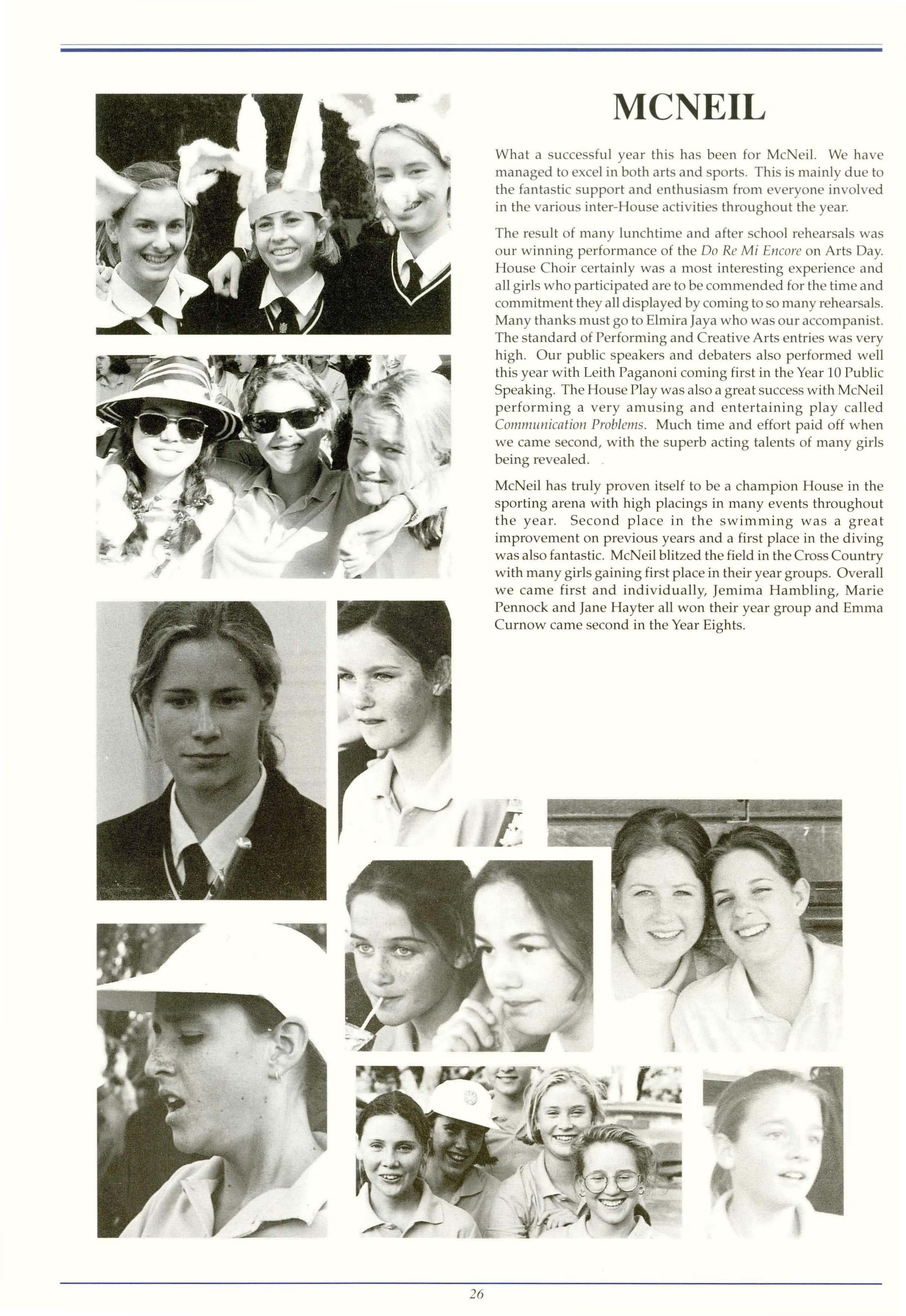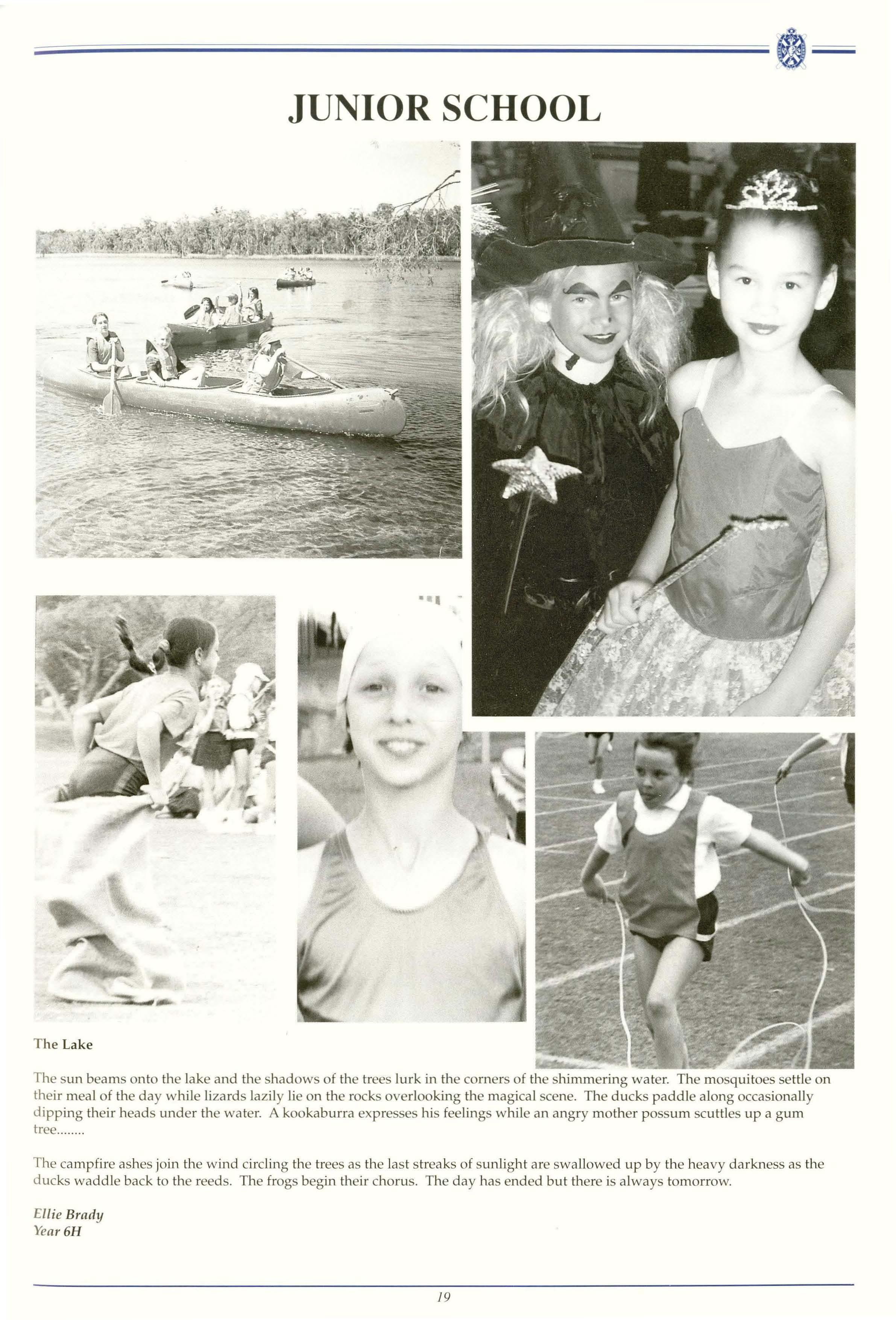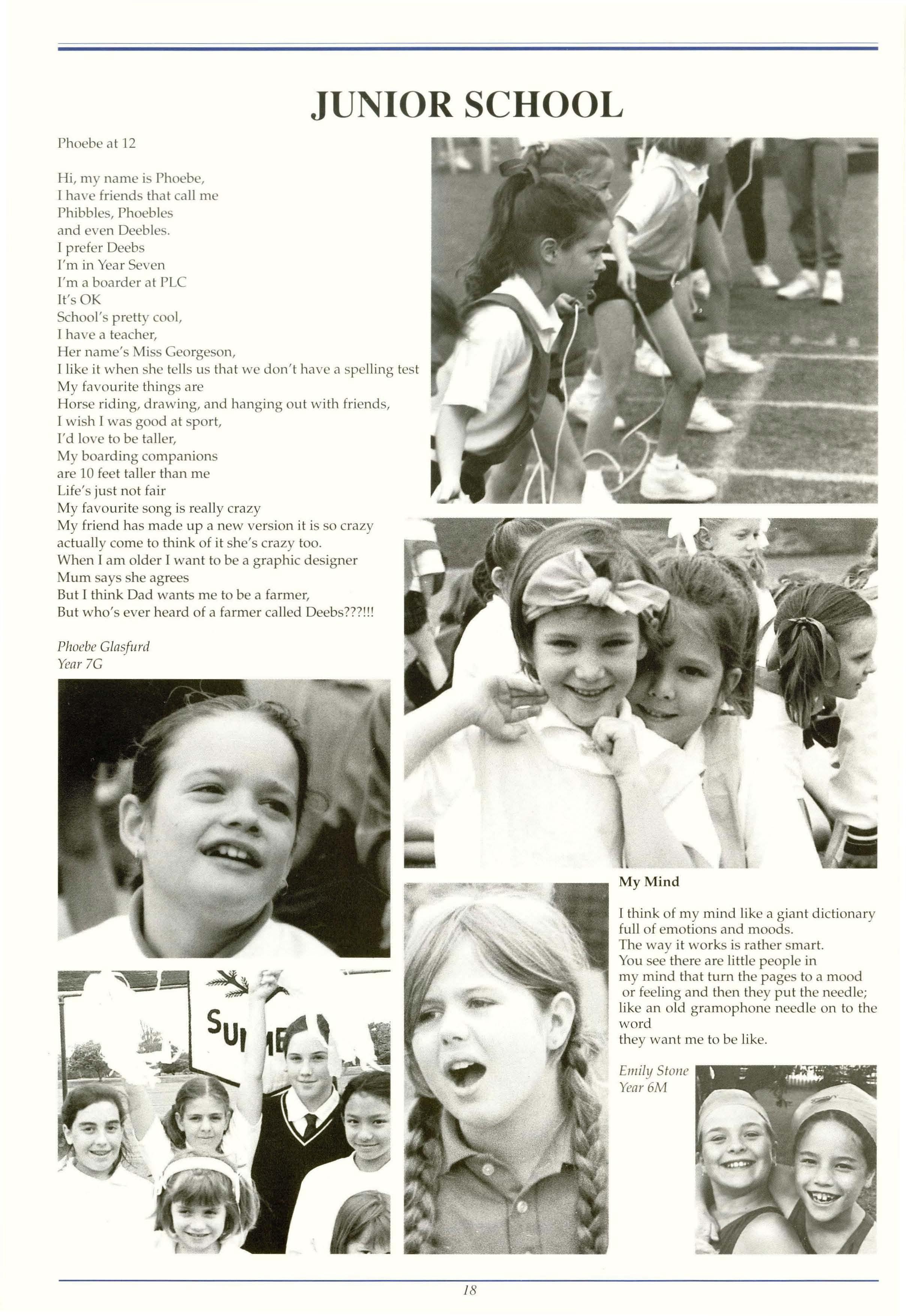 Looking back over the year, I recall one particularly amusing meeting with the printer, at whidl Georgina and I were asked 'So, what is your overall message?'. A little stunned by the prospect of trying to conjure up some mystical/ original/ analytical response, we tried to smother our laughter and attempt to say something constructive. The thought that immediately sprang to mind was that of a comment once scribbled by a fonner literature teamer in the margin of an essay of mine: 'Only postmen convey messages '. Although initially hesitant to try and associate any official meaning with this year's Kooknburm, I think that if there were anything Georgina and I tried to 'say', it is captured by the quotation by Lord Byron, whim is printed on the last page: 'To mase the glowing hours with flying feet'. Despite the fact that it was written almost two centuries ago, its sentiment remains as pertinent as ever. For although youth may bring with it seemingly insunnountable mallenges, it also presents a wealth of opportunities to the individual. Regardless of whether you are a background fir tree in a house play or an athletics star aiming for the Sydney 2000 Olympics, it is undeniably these last few years at sdl001 which offer a mance for everyone to have their' glowing hour' (or fifteen minutes?). TIle sheer range of activities now offered at PLC means everyone has the opportunity to discover and develop exactly what makes their feet fly.