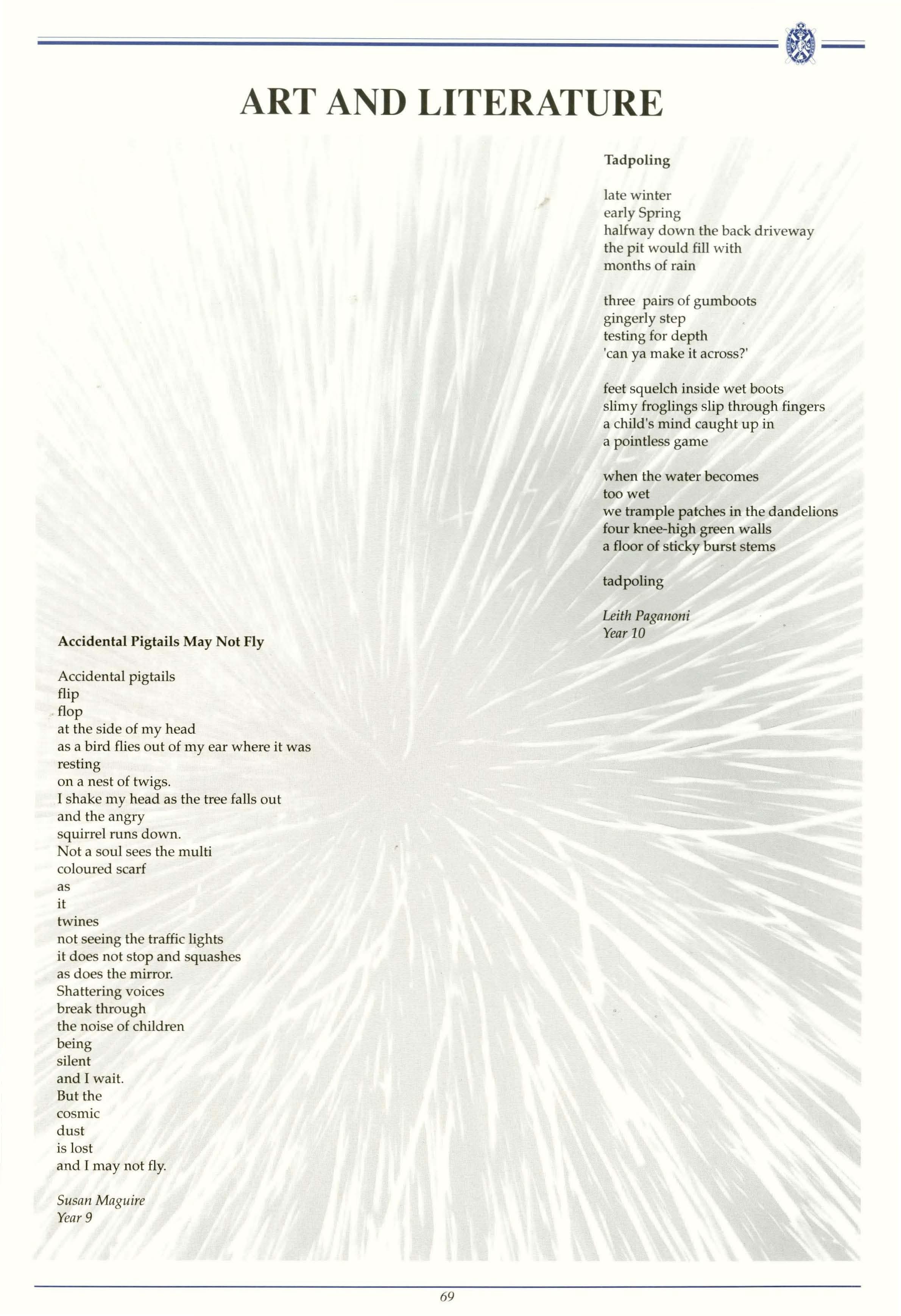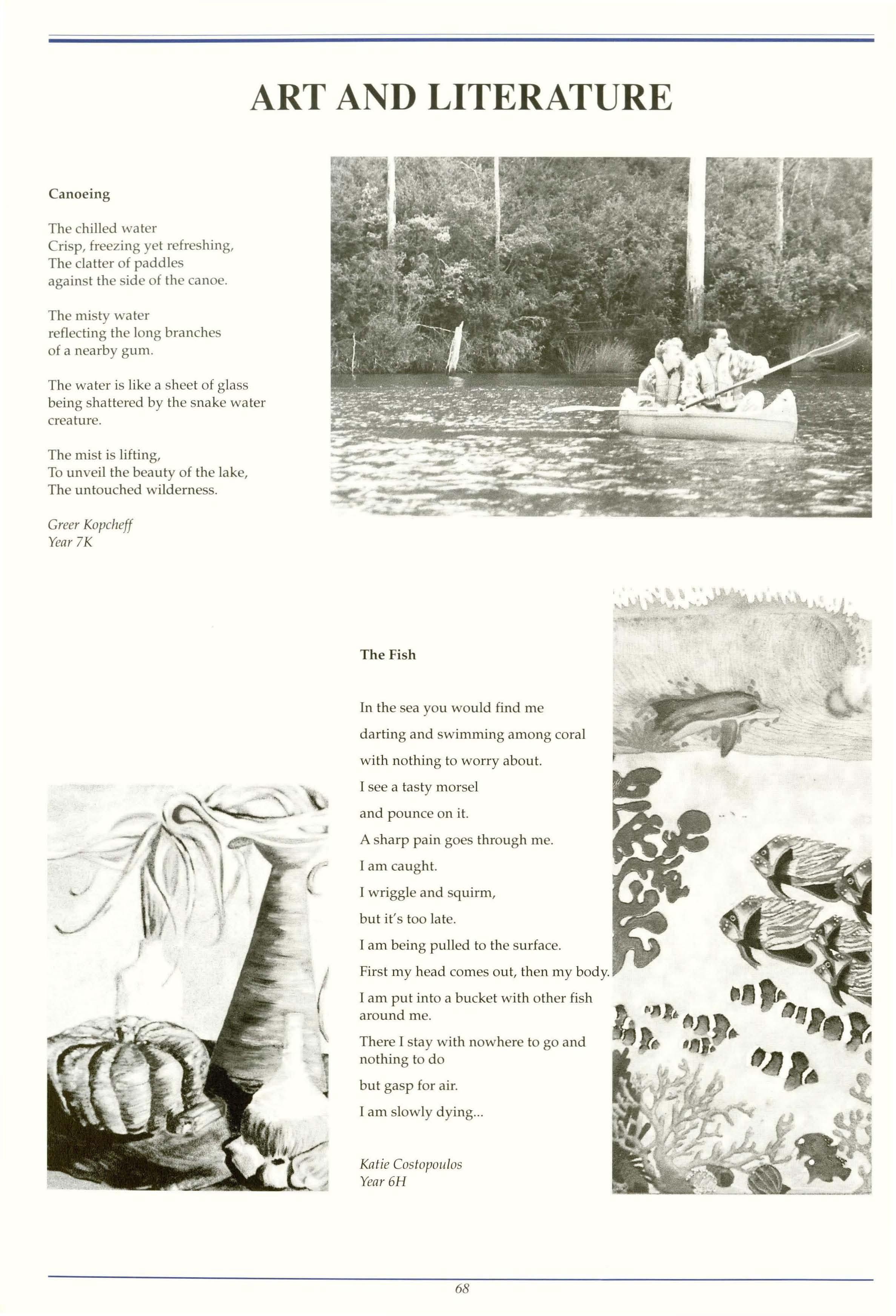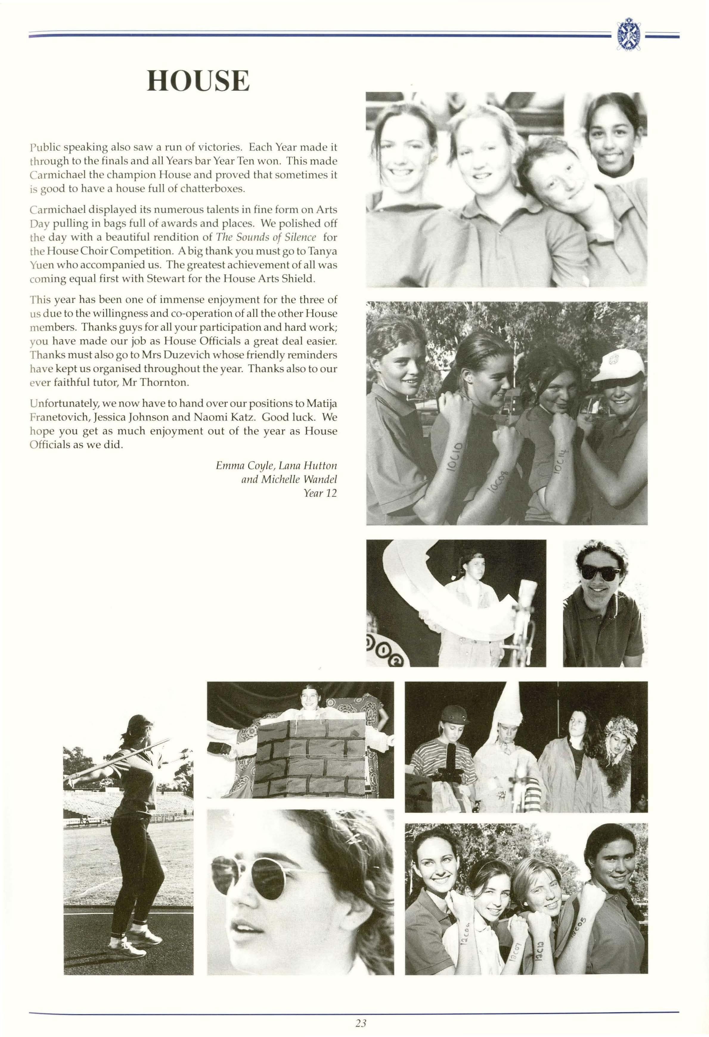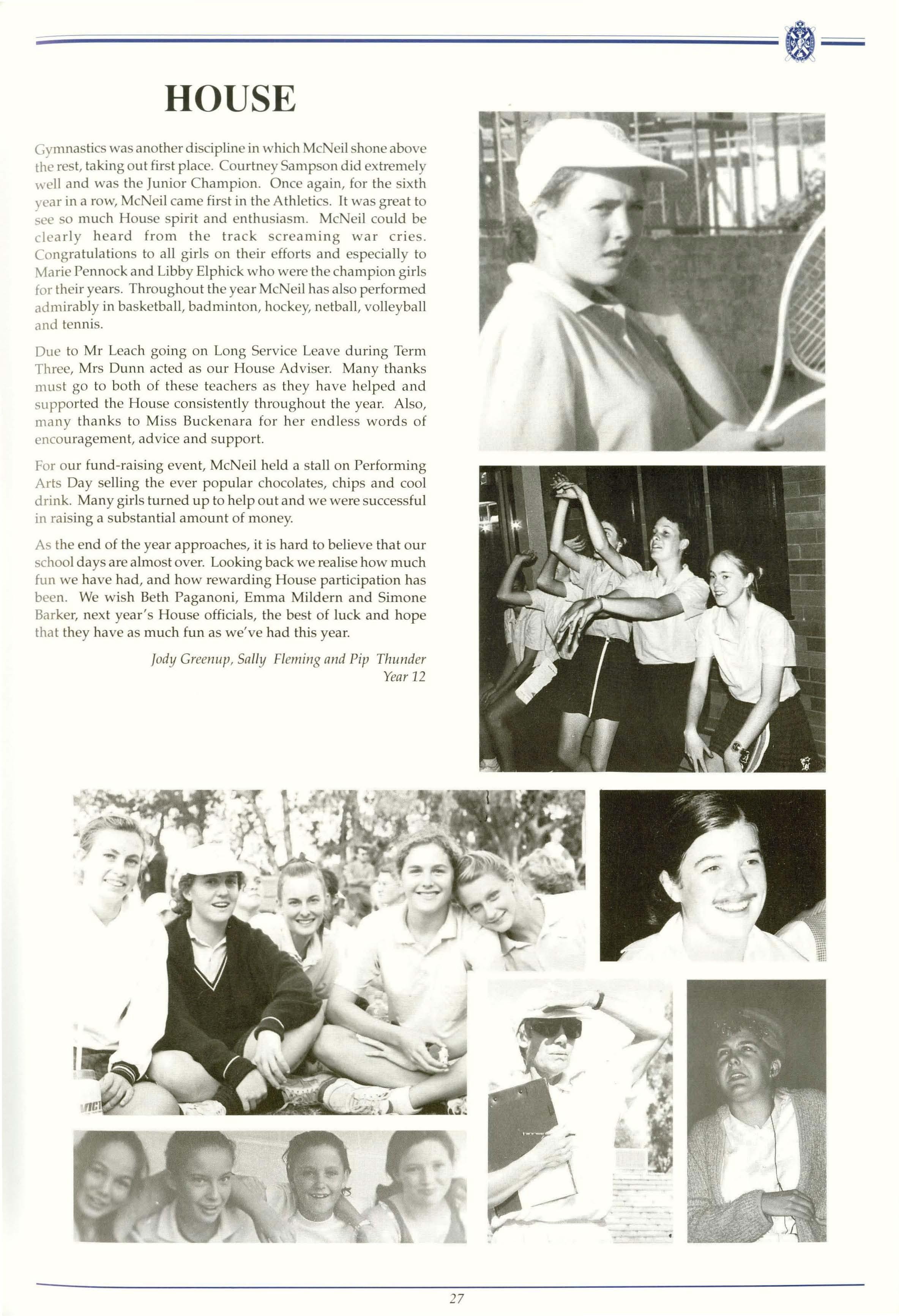 Looking back over the year, I recall one particularly amusing meeting with the printer, at whidl Georgina and I were asked 'So, what is your overall message?'. A little stunned by the prospect of trying to conjure up some mystical/ original/ analytical response, we tried to smother our laughter and attempt to say something constructive. The thought that immediately sprang to mind was that of a comment once scribbled by a fonner literature teamer in the margin of an essay of mine: 'Only postmen convey messages '. Although initially hesitant to try and associate any official meaning with this year's Kooknburm, I think that if there were anything Georgina and I tried to 'say', it is captured by the quotation by Lord Byron, whim is printed on the last page: 'To mase the glowing hours with flying feet'. Despite the fact that it was written almost two centuries ago, its sentiment remains as pertinent as ever. For although youth may bring with it seemingly insunnountable mallenges, it also presents a wealth of opportunities to the individual. Regardless of whether you are a background fir tree in a house play or an athletics star aiming for the Sydney 2000 Olympics, it is undeniably these last few years at sdl001 which offer a mance for everyone to have their' glowing hour' (or fifteen minutes?). TIle sheer range of activities now offered at PLC means everyone has the opportunity to discover and develop exactly what makes their feet fly.