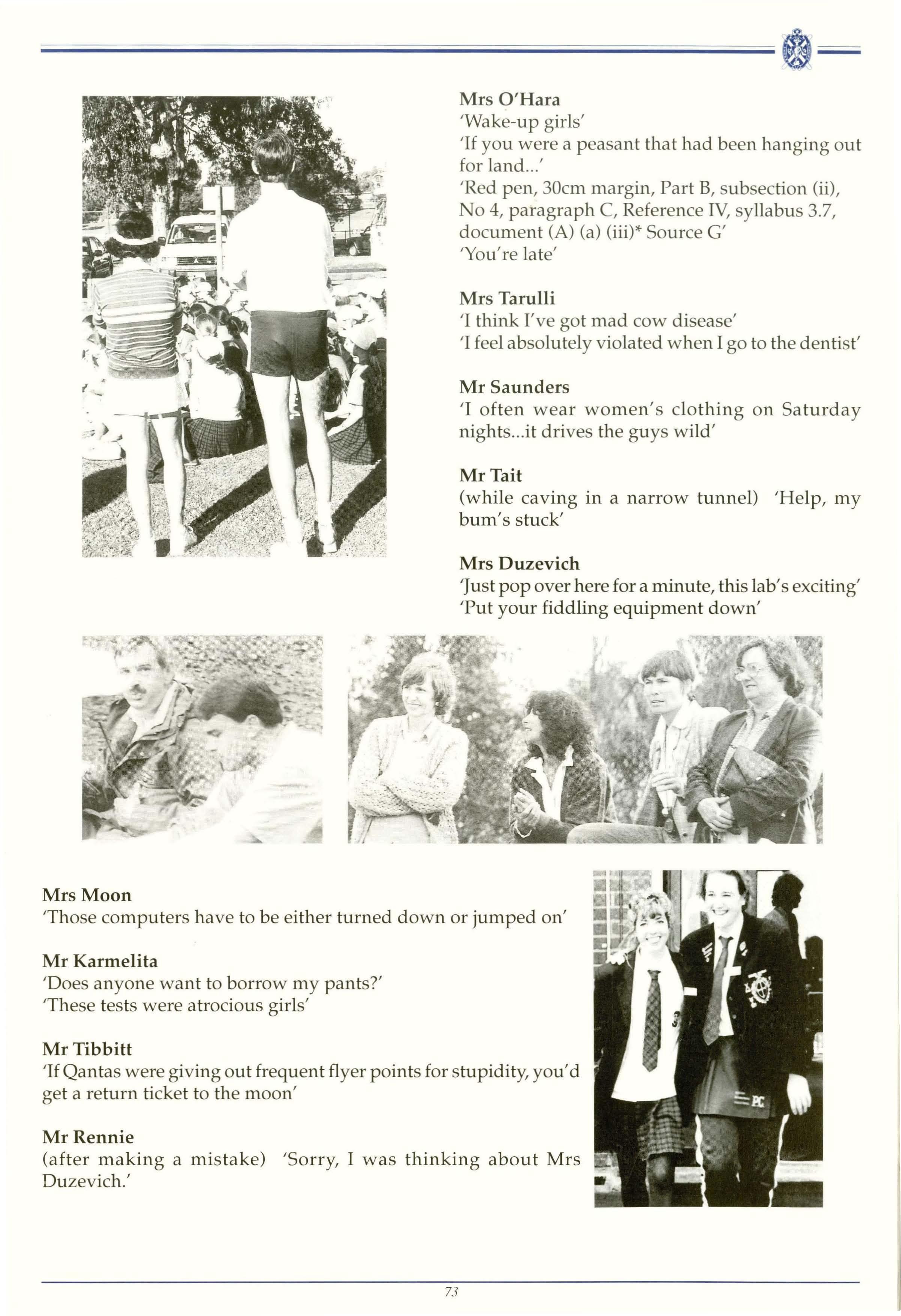 The professional development of all staff is vital in this age of change and there has been a great deal happening in this area. All staff participate for they know that there is a need to continue to learn and to develop personally. It has been especially pleasing to have Dr Julia Atkin of New South Wales with us this year as residenteducator for she has given us the opportunity to focus on learning strategies that best suit our girls.