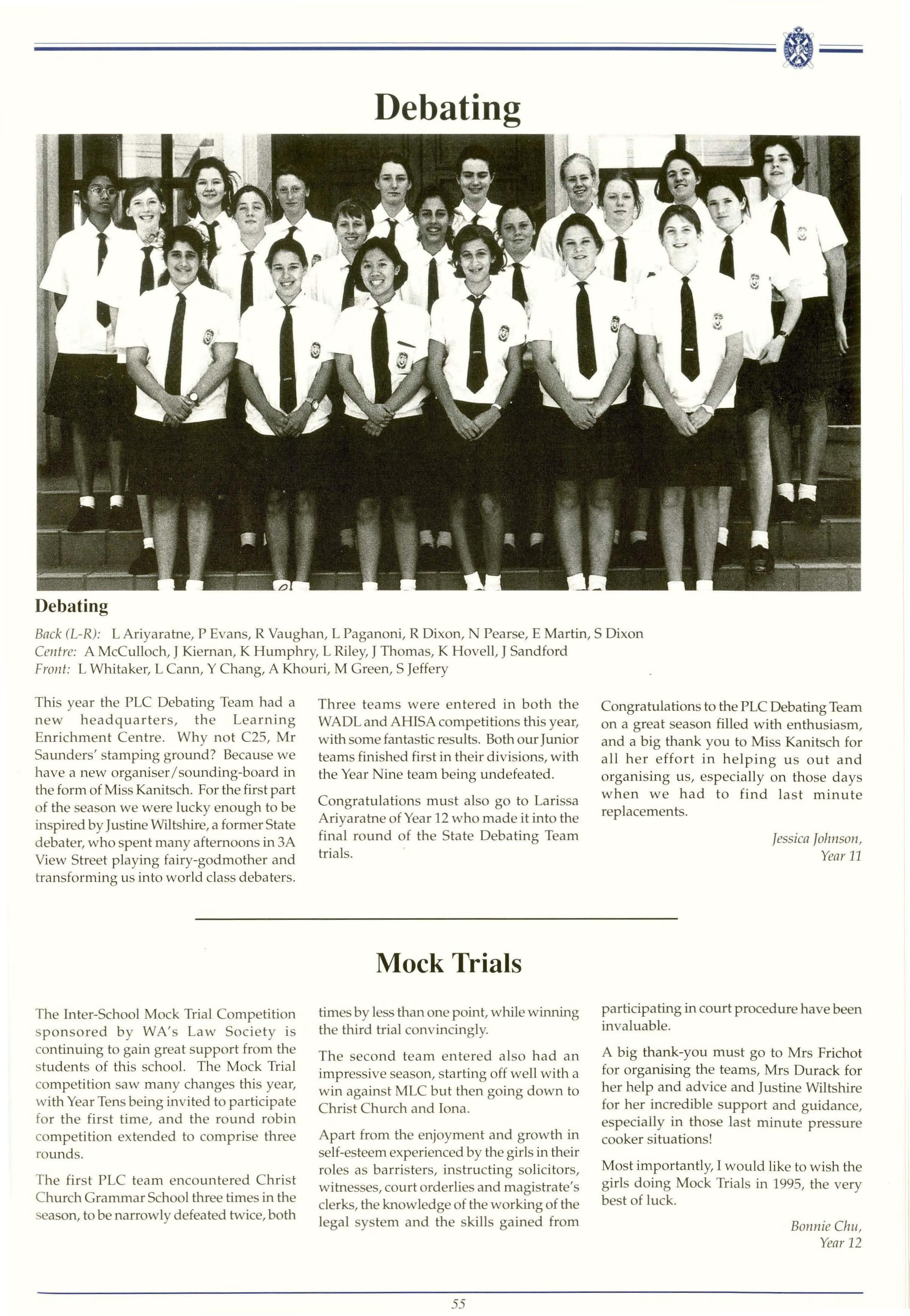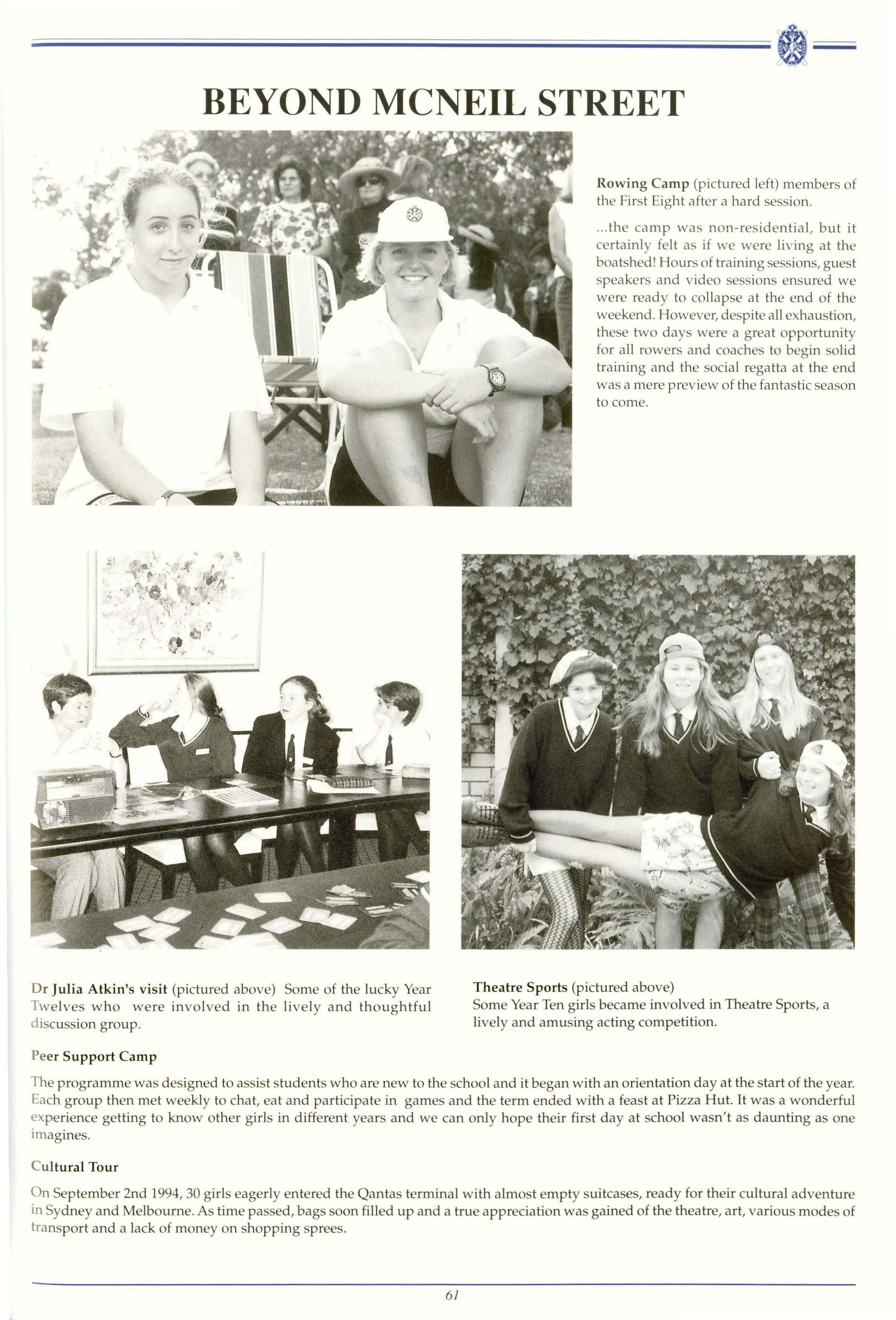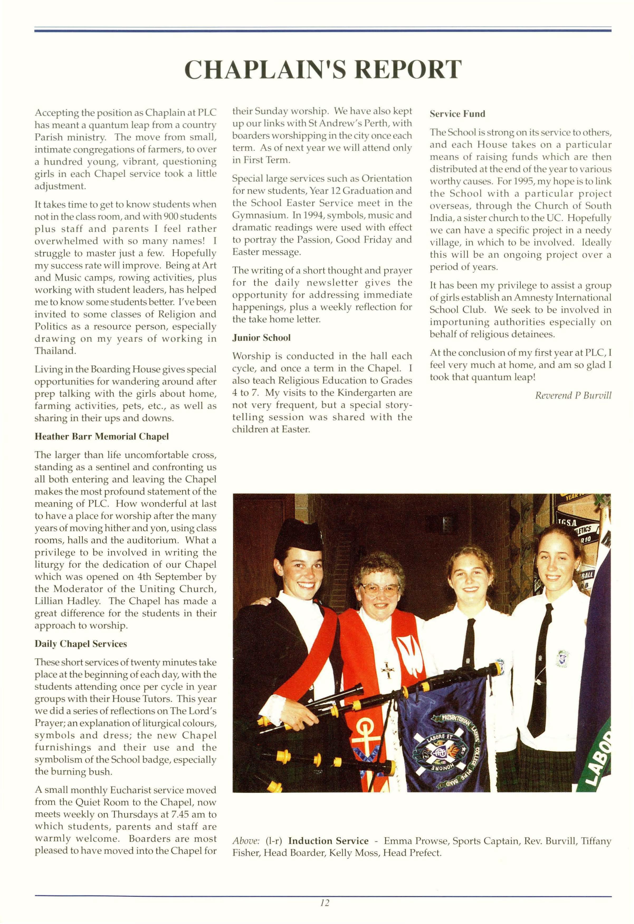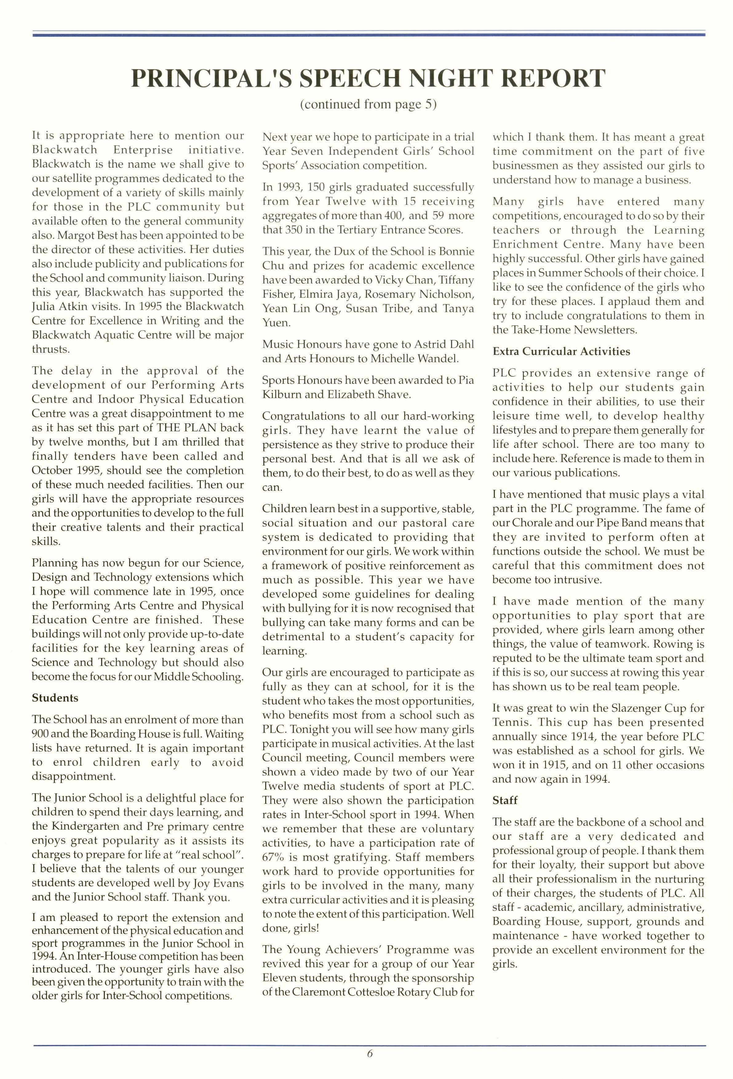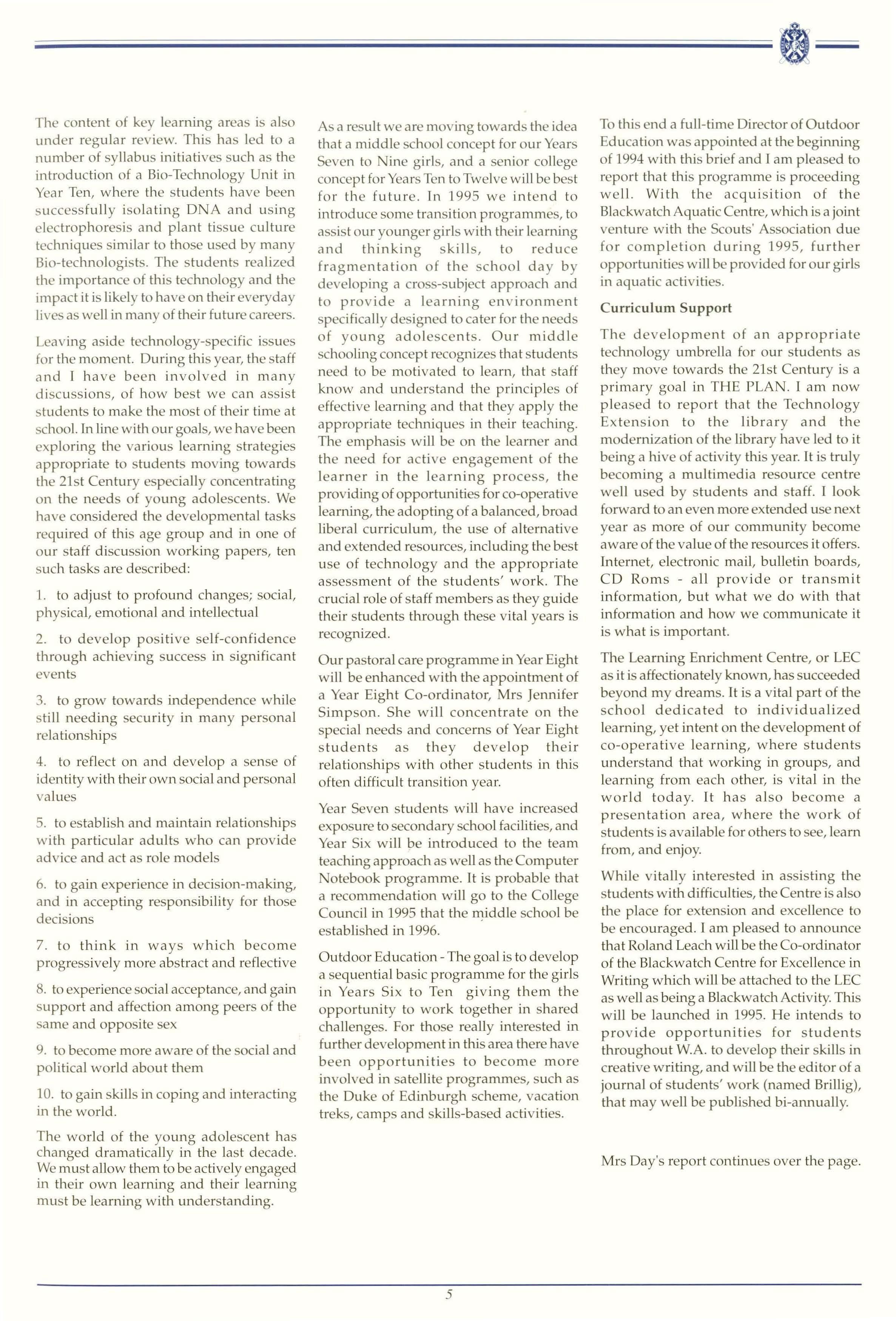 It is appropriate here to mention our Blackwatch Enterprise initiative. Blackwatch is the name we shall give to our satellite programmes dedicated to the development of a variety of skills mainly for those in the PLC community but available often to the general community also. Margot Best has been appointed to be the director of these activities. Her duties also include publicity and publications for the School and community liaison. During this year, Blackwatch has supported the Julia Atkin visits. In 1995 the Blackwatch Centre for Excellence in Writing and the Blackwatch Aquatic Centre will be major thrusts.