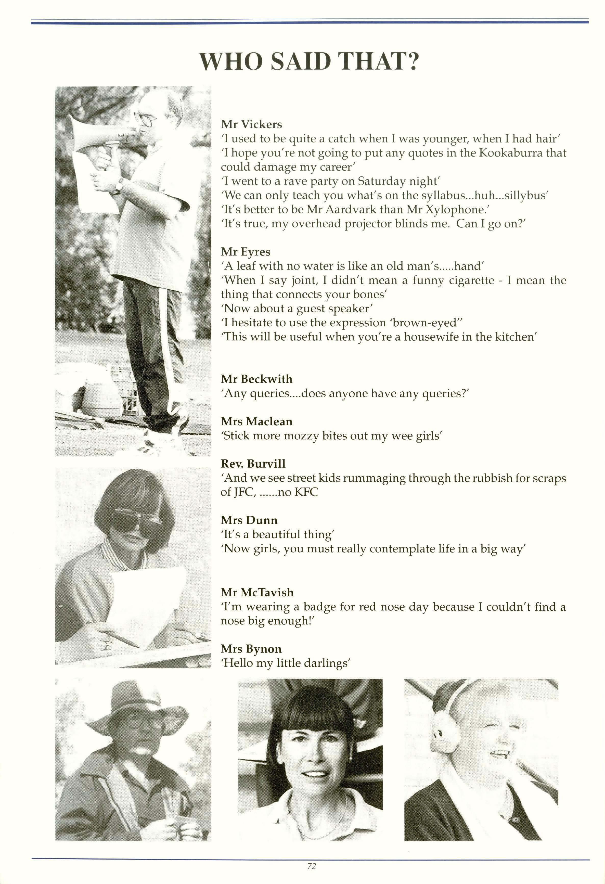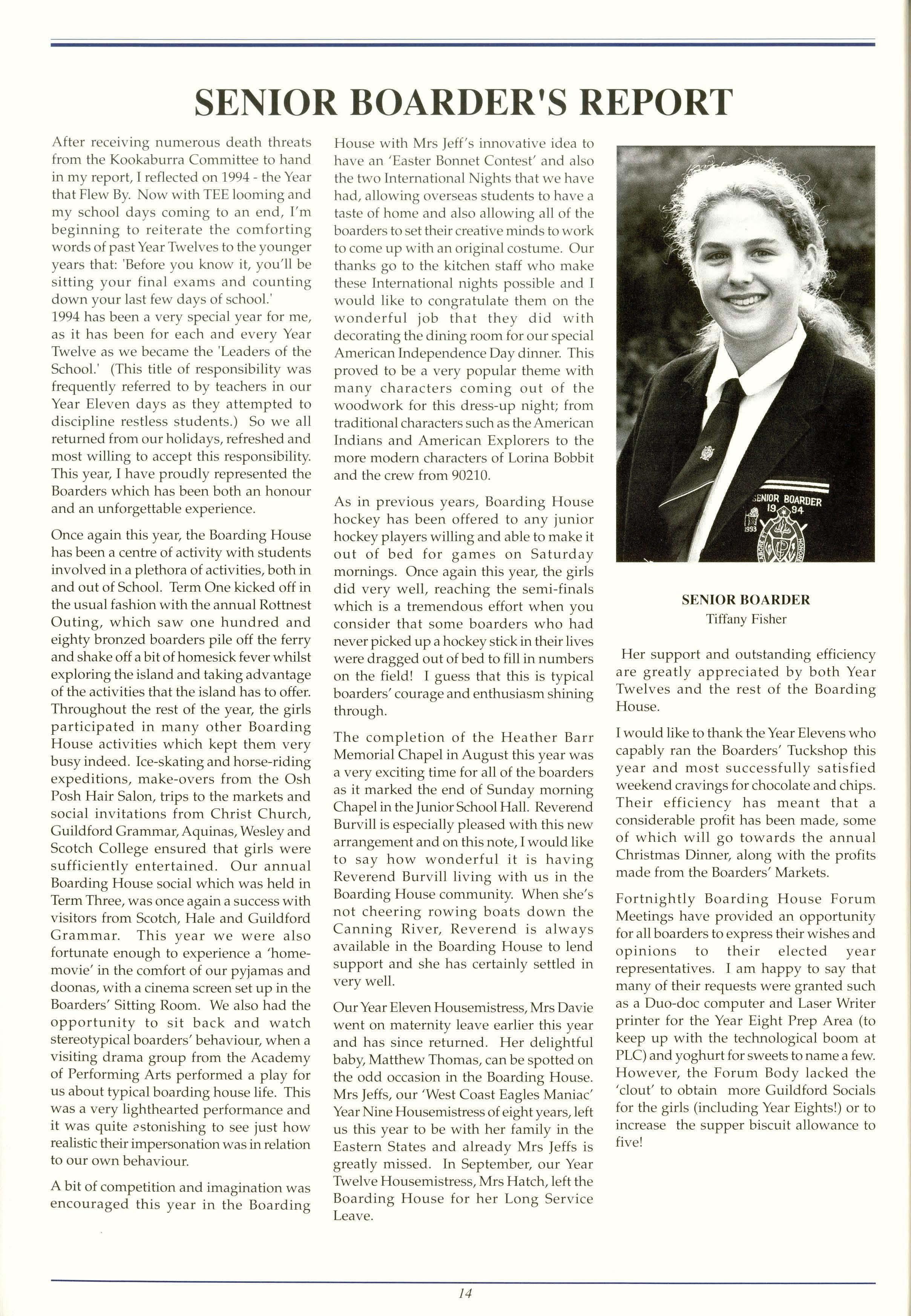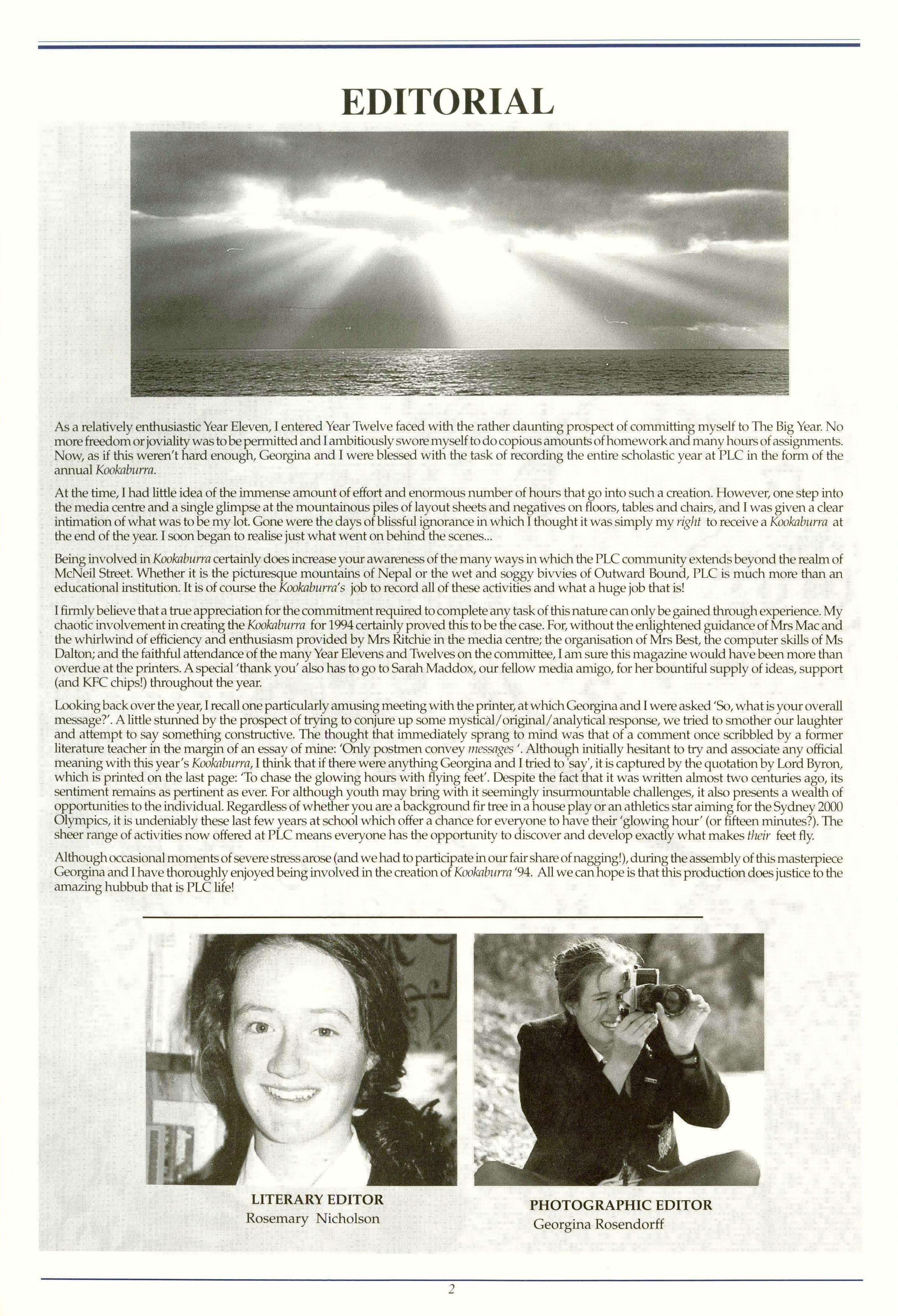 Although occasional moments of severe stress arose (and we had to participate in our fair share of nagging'), during the assembly of tllis masterpiece Georgina and I have thoroughly enjoyed being involved in tile creation of Kooknburm '94. All we can hope is that tllis production does justice to the amazing hubbub tllat is PLC life!