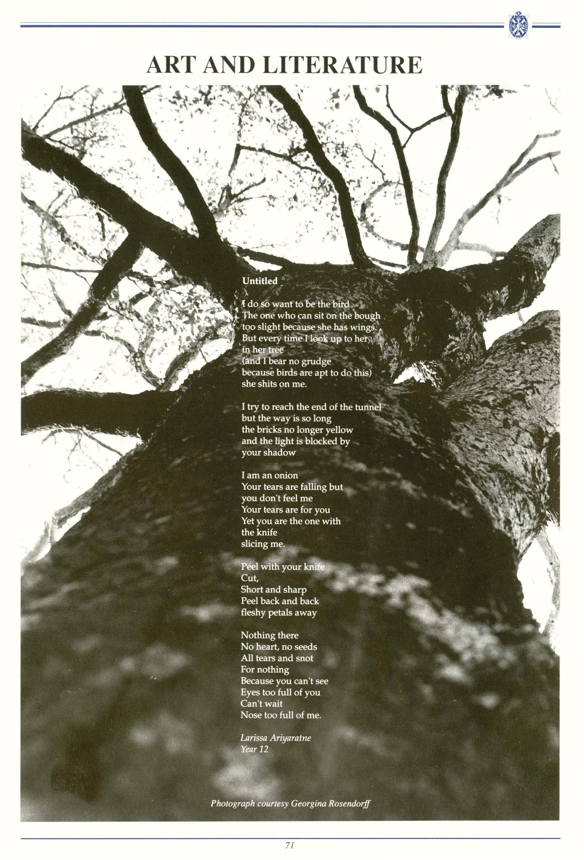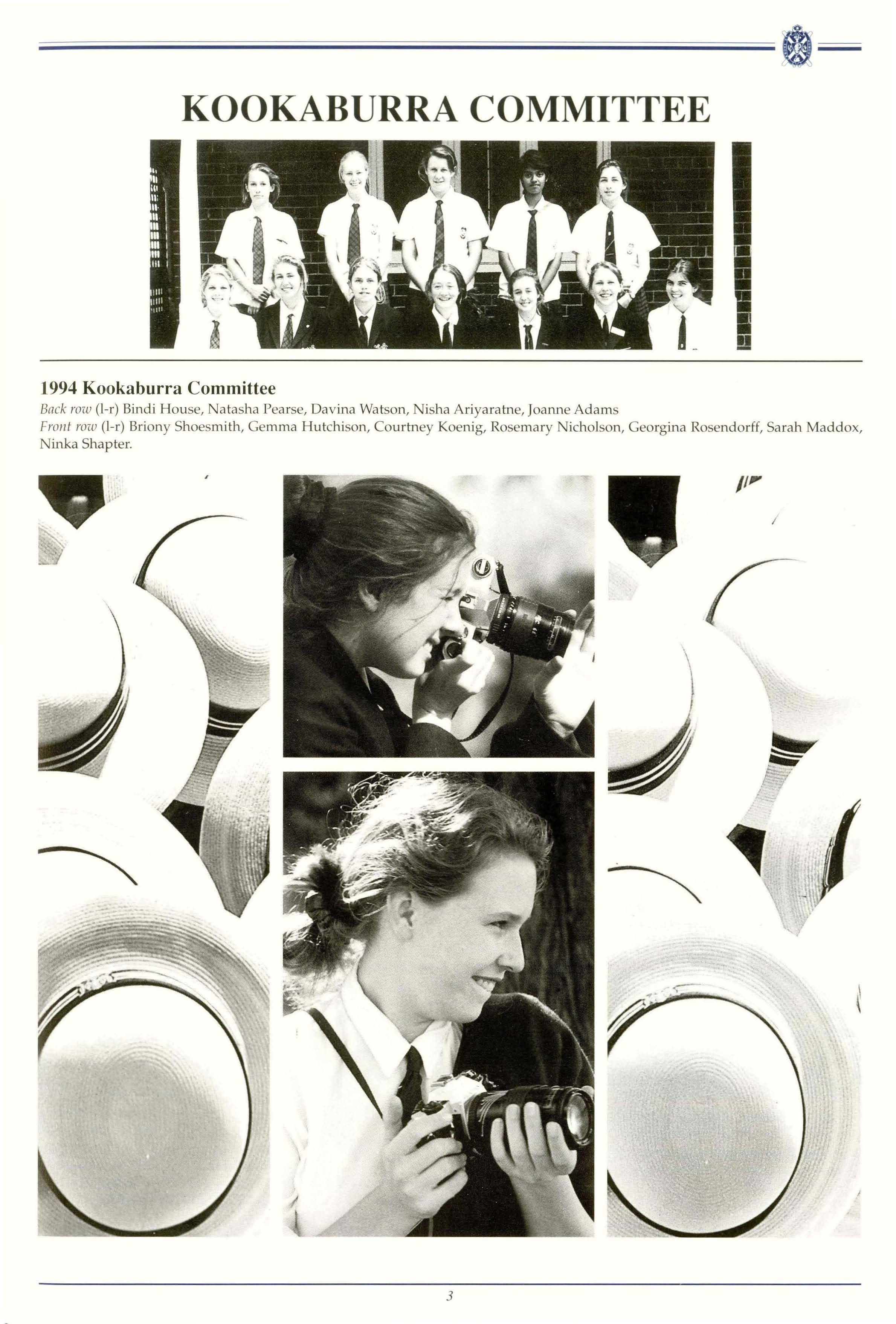 I firmly believe that a true appreciation for the commitment required to complete any task of this nature can only be gained through experience. My maotic involvement in creating the Kookaburra for 1994 certainly proved this to be the case. For, without the enlightened guidance of Mrs Mac and the whirlwind of efficiency and enthusiasm provided by Mrs Ritdue in the media centre; the organisation of Mrs Best, the computer skills of Ms Dalton; and the faithful attendance of the many Year Elevens and Twelves on the committee, I am sure this magazine would have been more than overdue at the printers. A special 'thank you' also has to go to Sarah Maddox, our fellow media anugo, for her bOWltiful supply of ideas, support (and KFC cI1ips!) throughout the year.