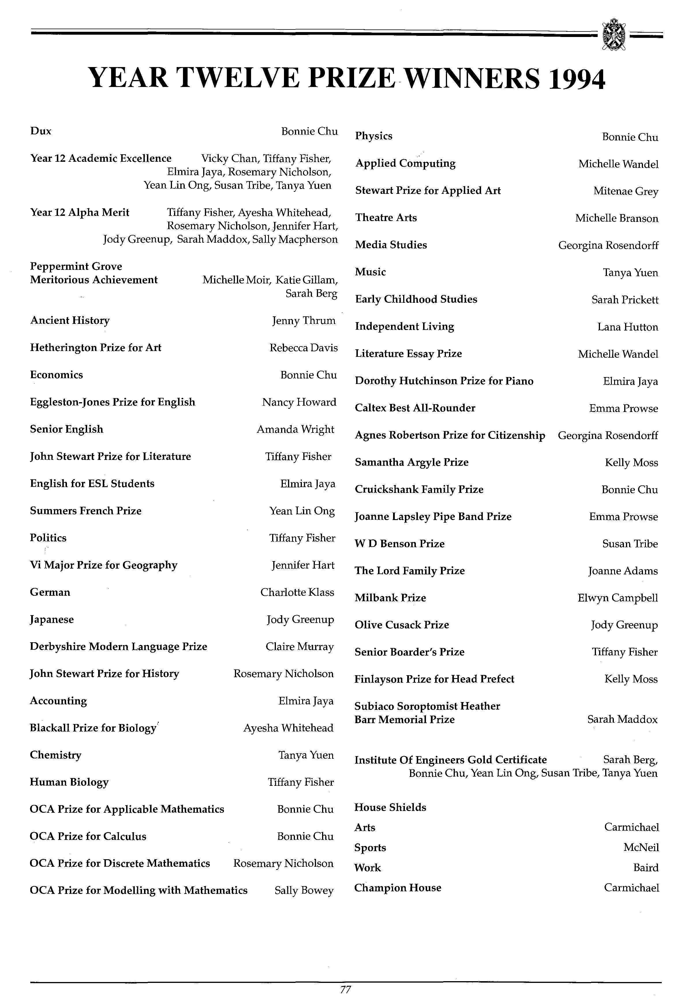 This year, the Dux of the School is Bonnie Chu and prizes for academic excellence have been awarded to Vicky Chan, Tiffany Fisher, Elmira Jaya, Rosemary Nicholson, Yean Lin Ong, Susan Tribe, and Tanya Yuen.