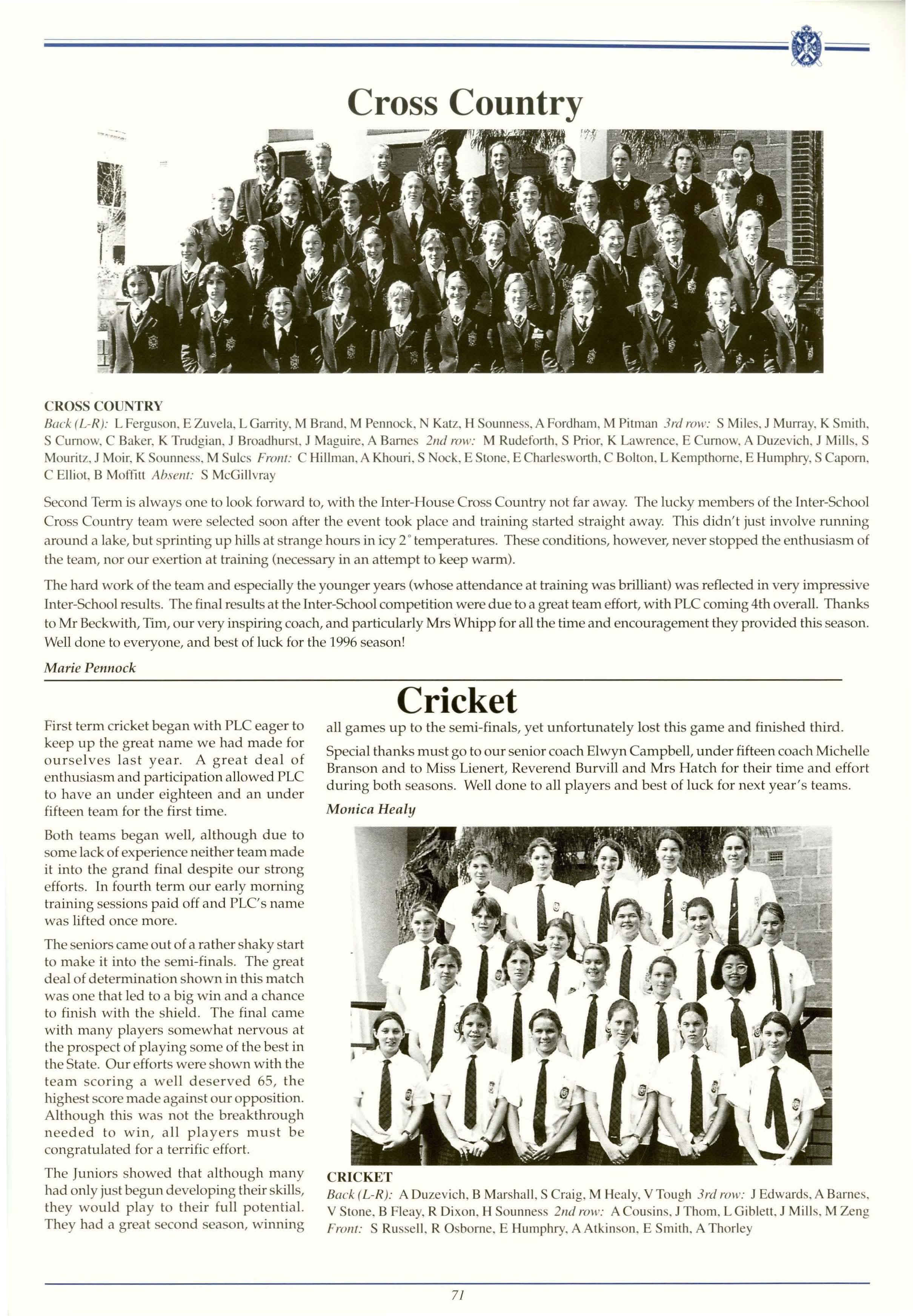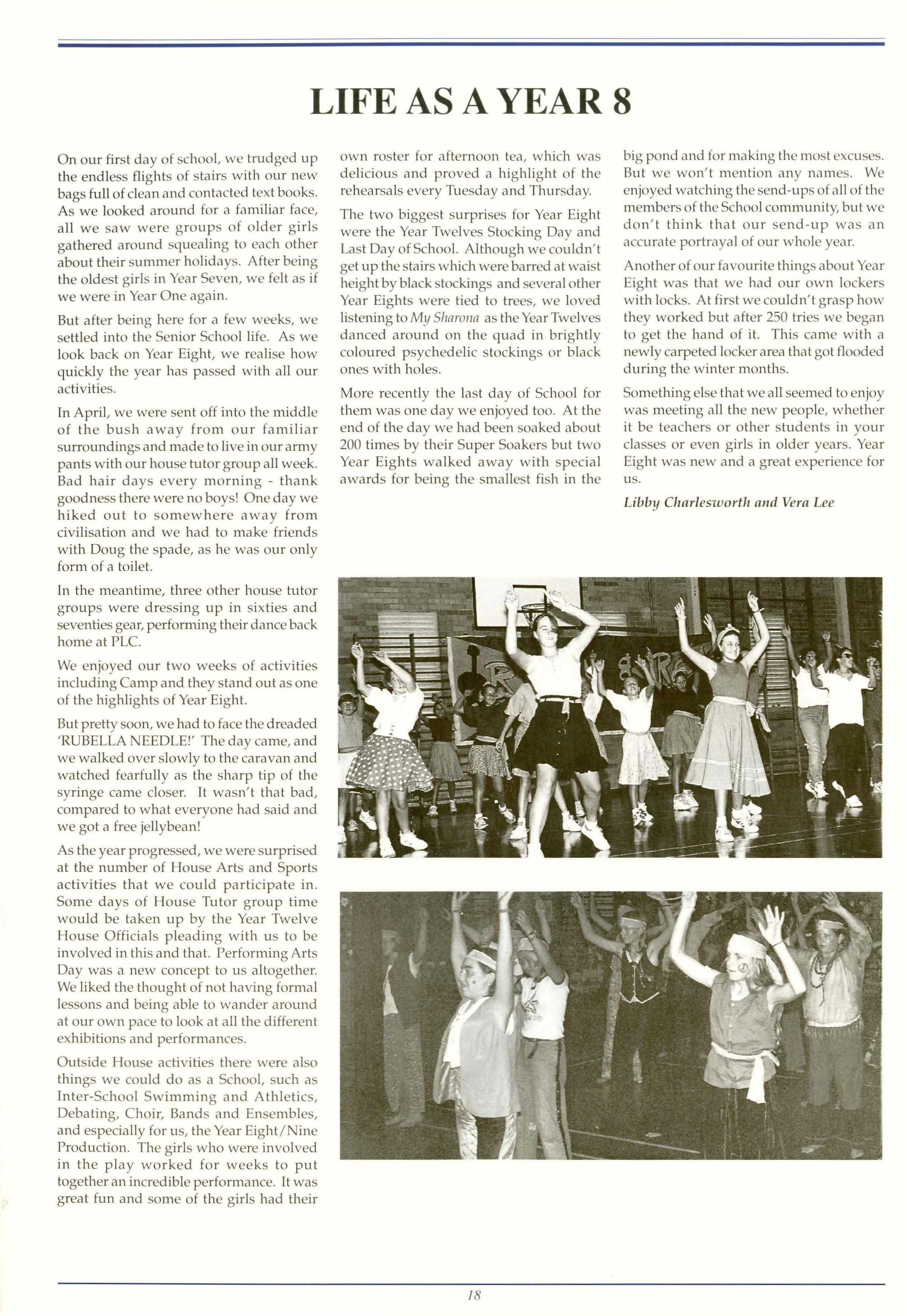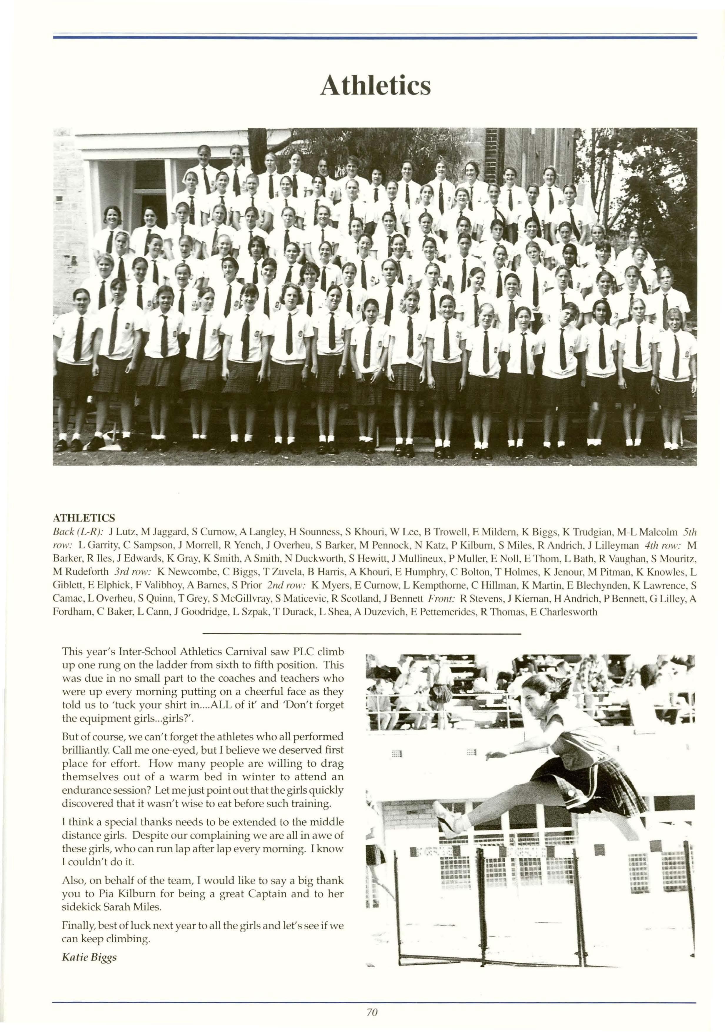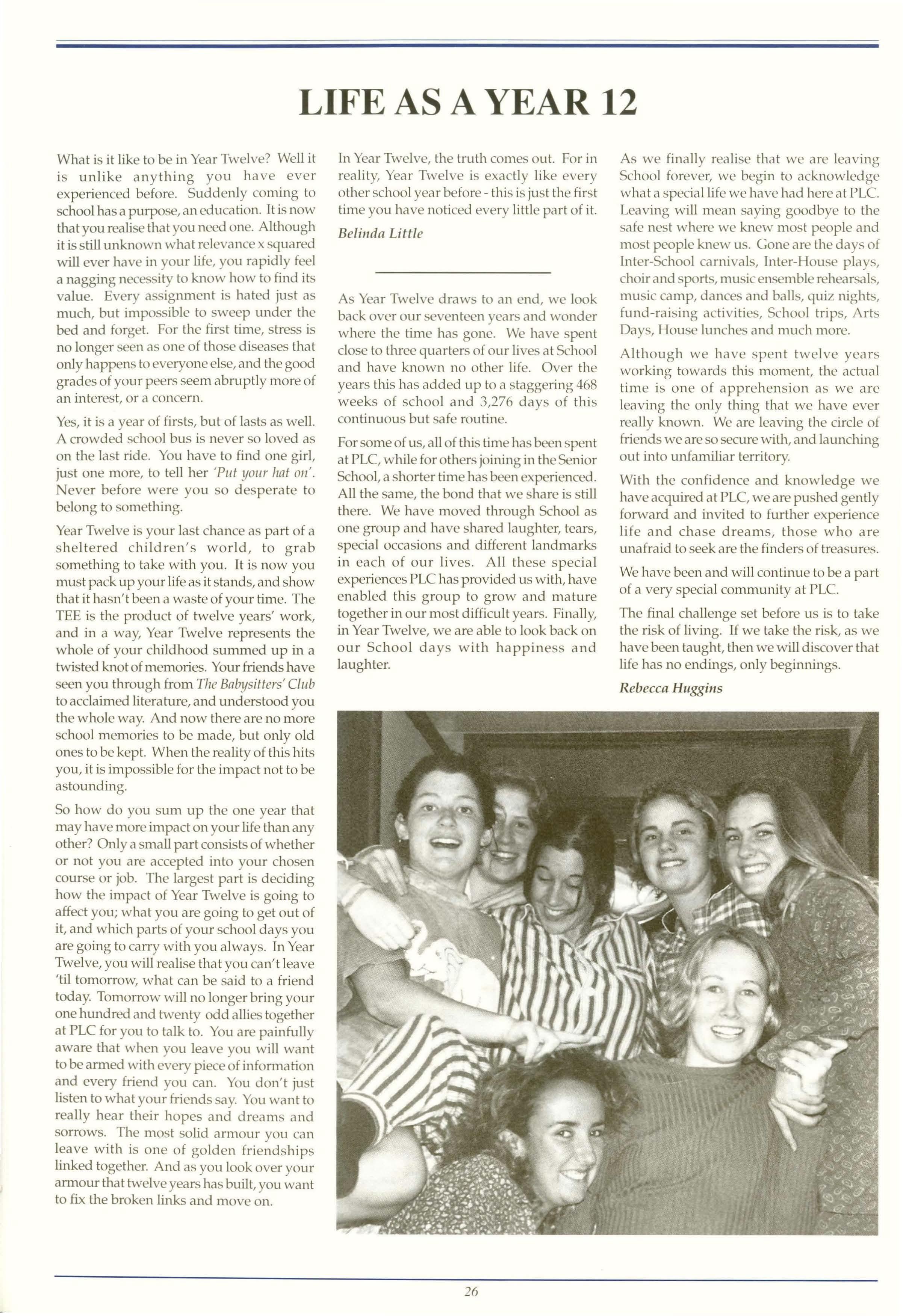 We have tried to capture every facet of experience within the PLC existence - academic, sporting, arts and community involvement. Year reports have been included this year, so that everyone may feel that there is something special for them in Kookaburra. We have also continued on from the initiative of last year's editors and created a "Beyond McNeil Street" section, a collection of accounts and photographs of students' experiences beyond the grounds of PLC.