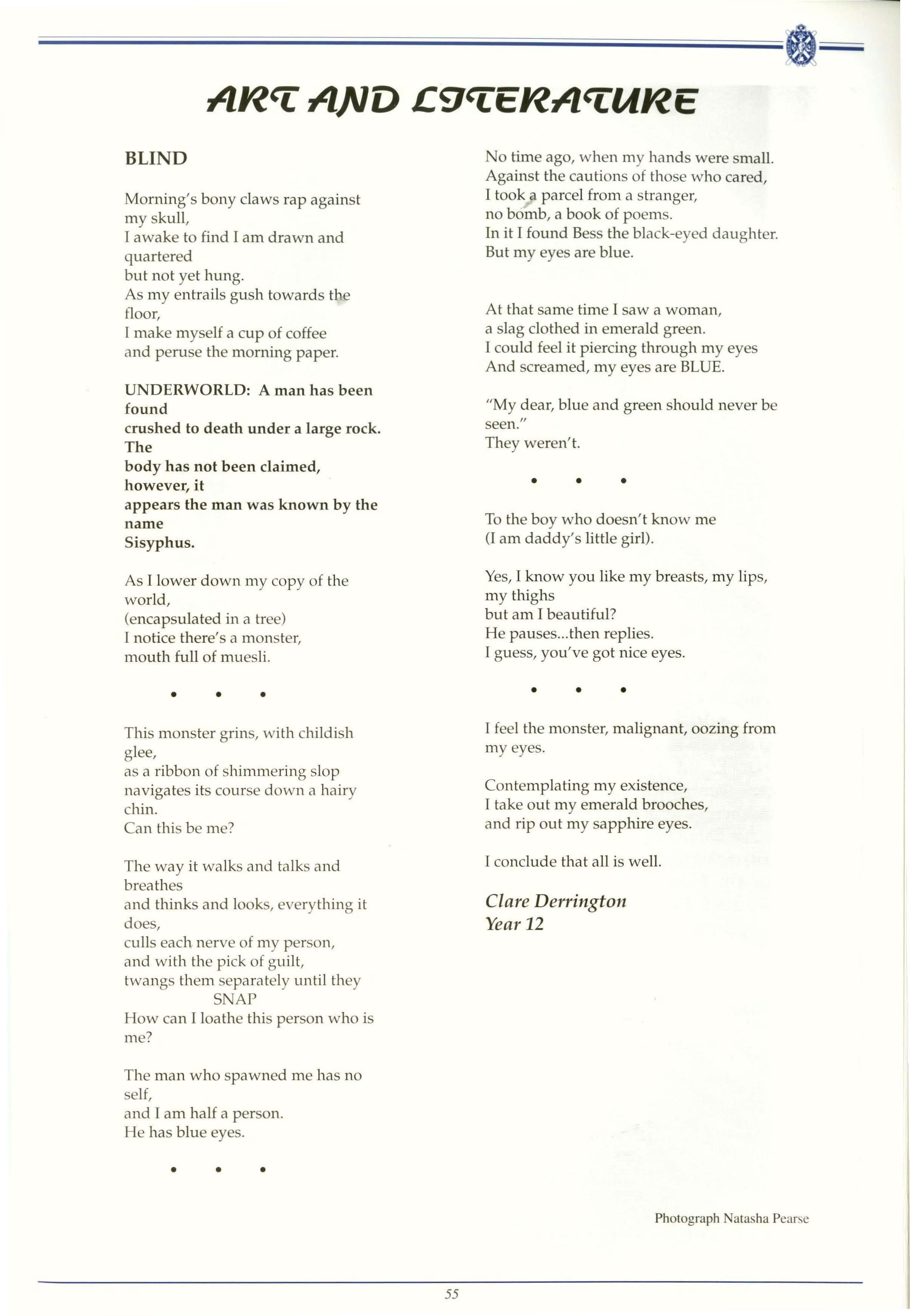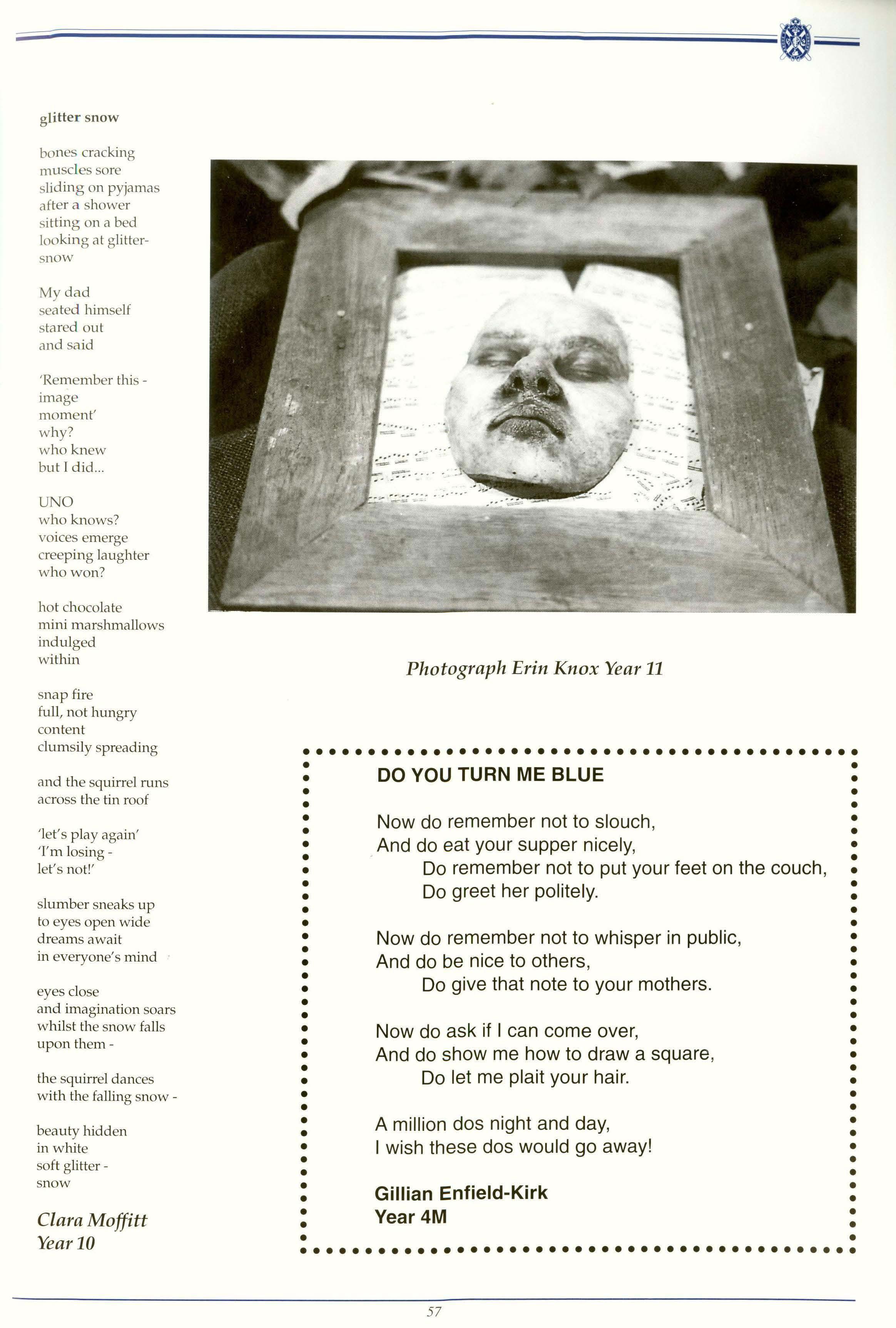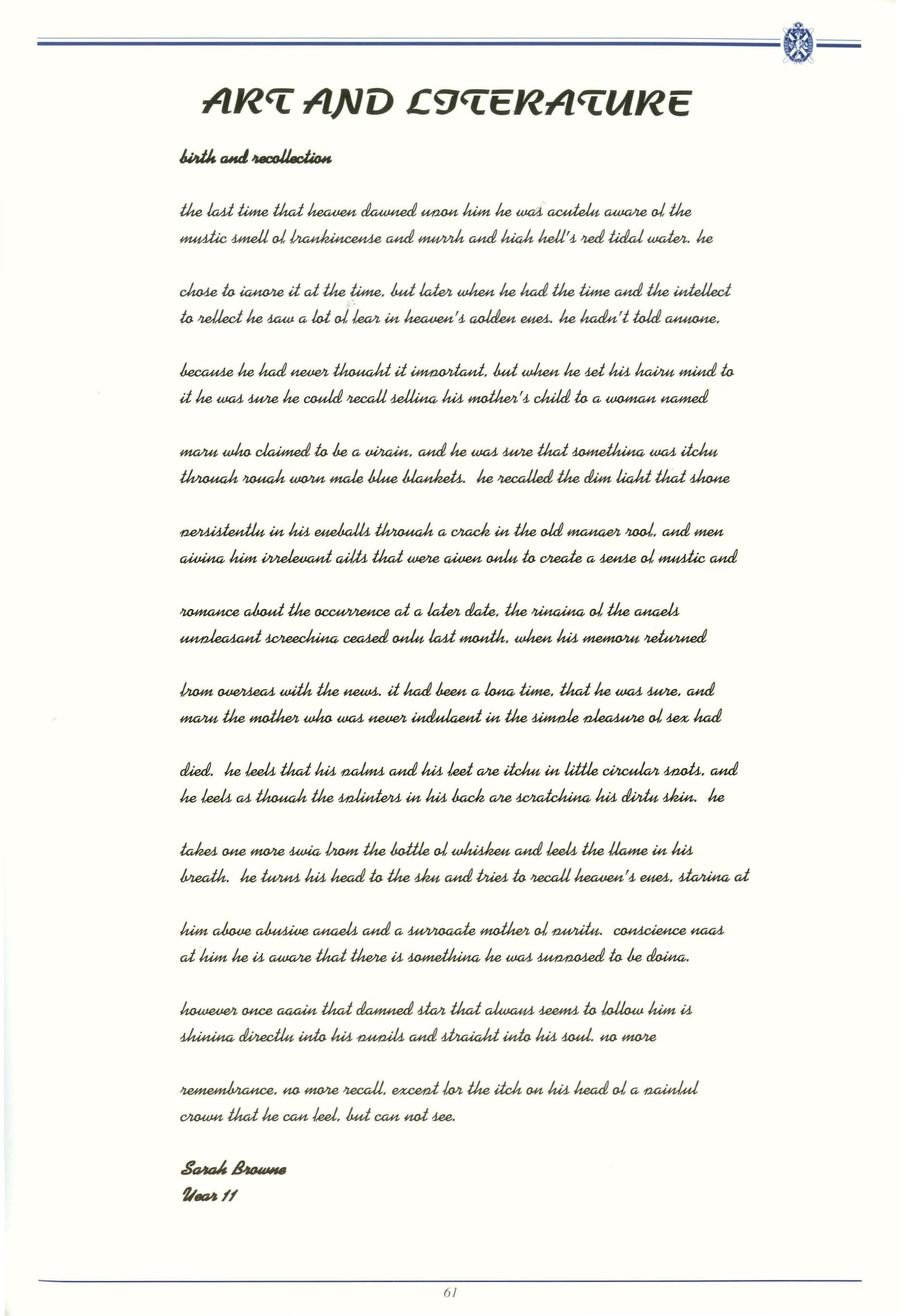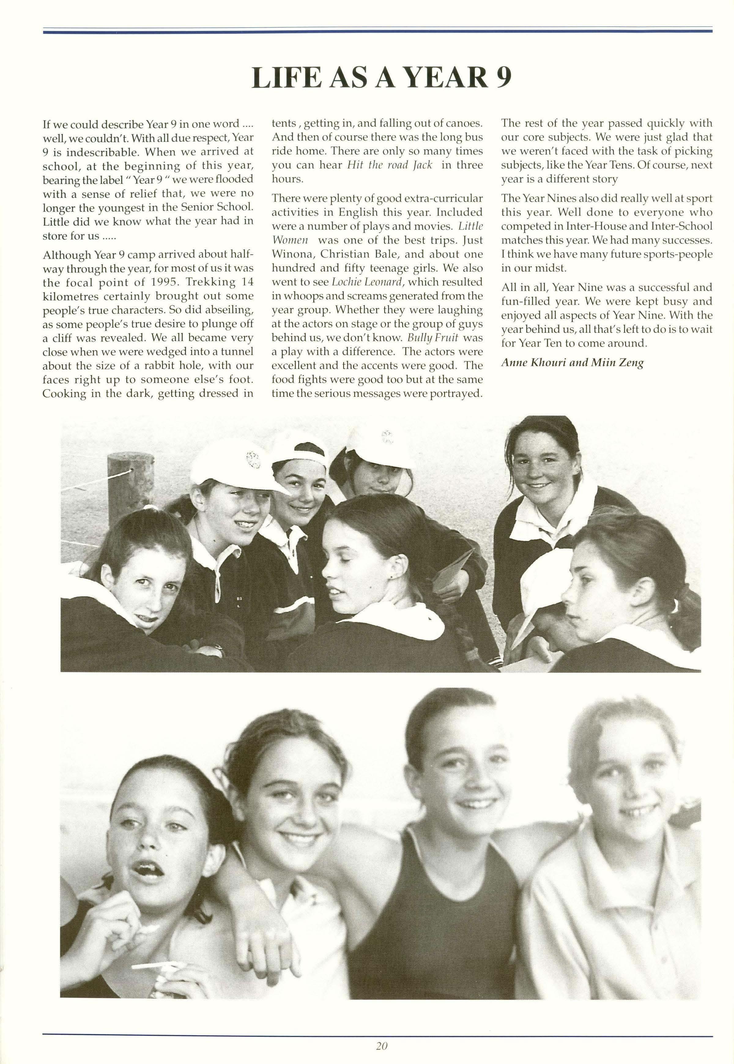 We have tried to capture every facet of experience within the PLC existence - academic, sporting, arts and community involvement. Year reports have been included this year, so that everyone may feel that there is something special for them in Kookaburra. We have also continued on from the initiative of last year's editors and created a "Beyond McNeil Street" section, a collection of accounts and photographs of students' experiences beyond the grounds of PLC.