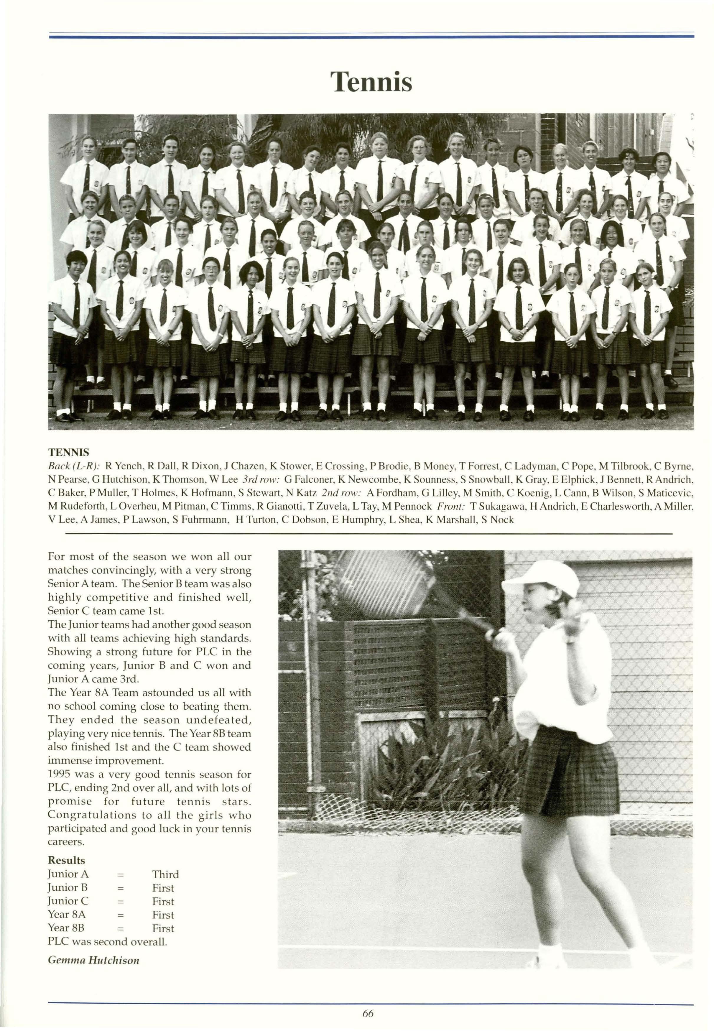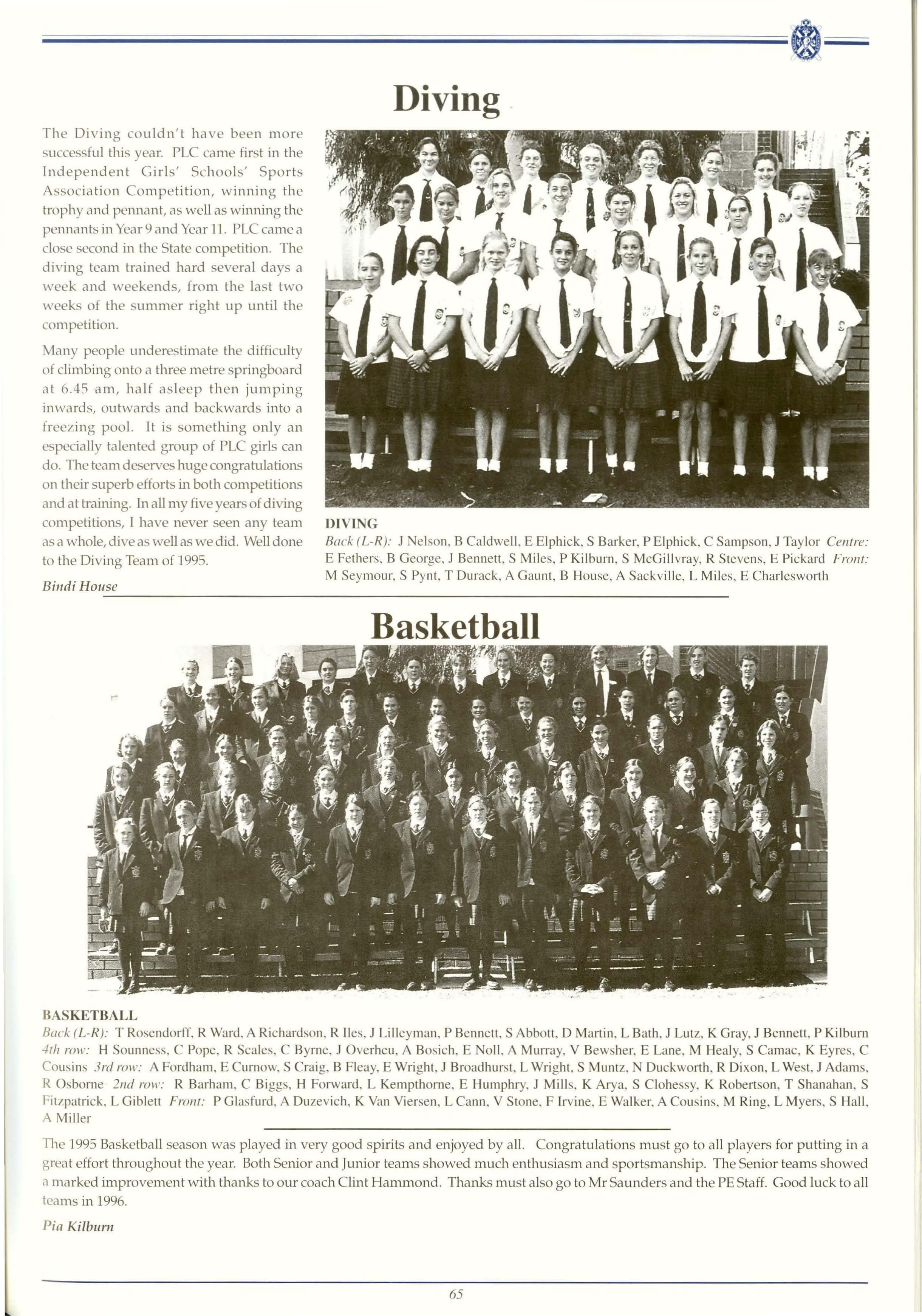 The 1995 Gym season began early in May with McNeil sweeping the Junior, Senior and overall trophies at the Inter-House Gymnastics Competition. Soon after, the Inter-School Gym team began intensive training. After rising before the sun three mornings a week for nearly three months, the gruelling effort payed off. The IGSSA Inter-School Gym competition approached. Everyone performed to their greatest potential and thoroughly enjoyed the atmosphere of competing. After a commendable third place in the IGSSA Competition, our team worked even harder at the State Schoolgirls' Competition, with most girls improving on their individual scores. Yet MLC and St Mary's proved too strong as competitors and PLC gained overall third place. Congratulations must go to Senior Division 2 team who gained first place.