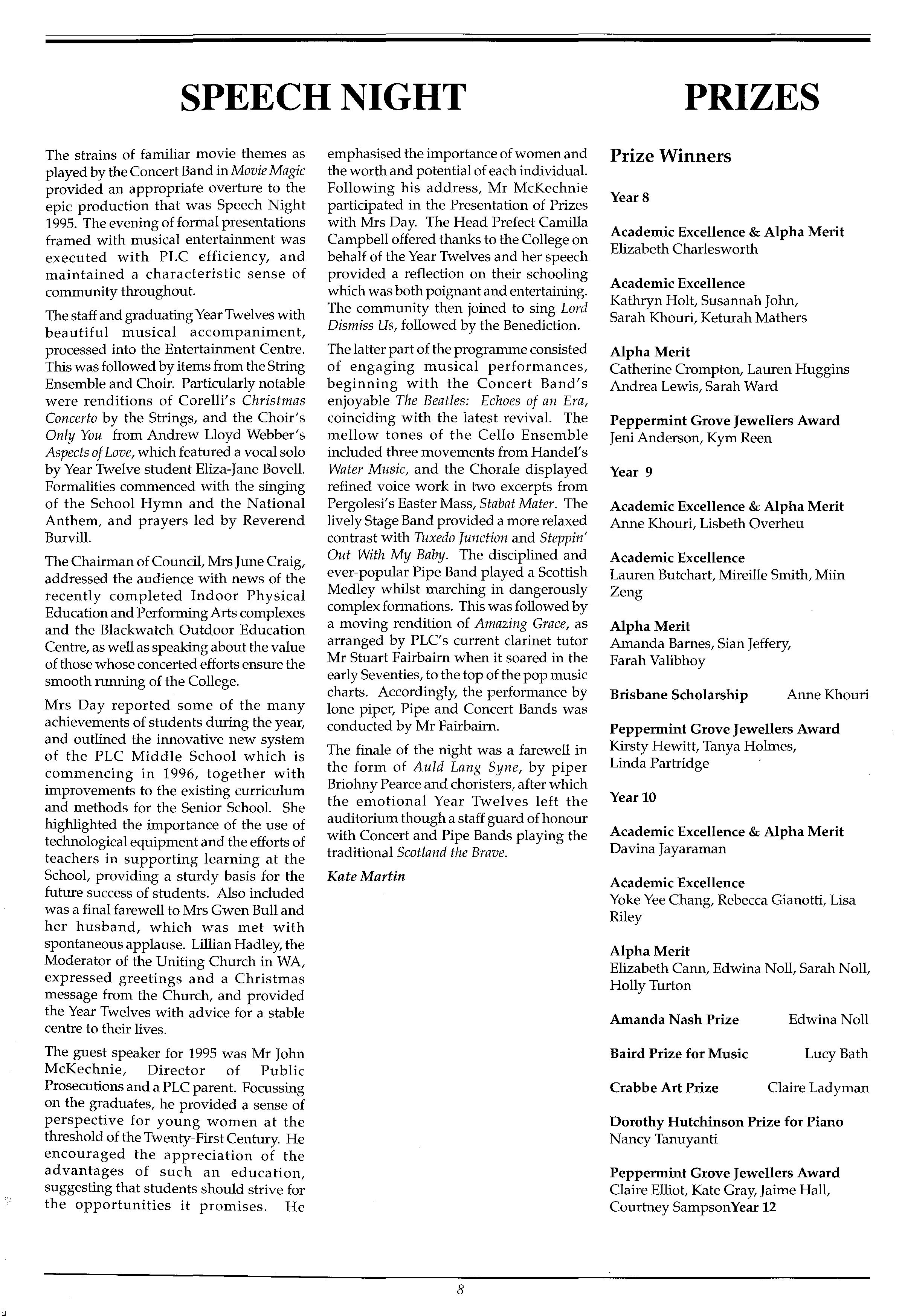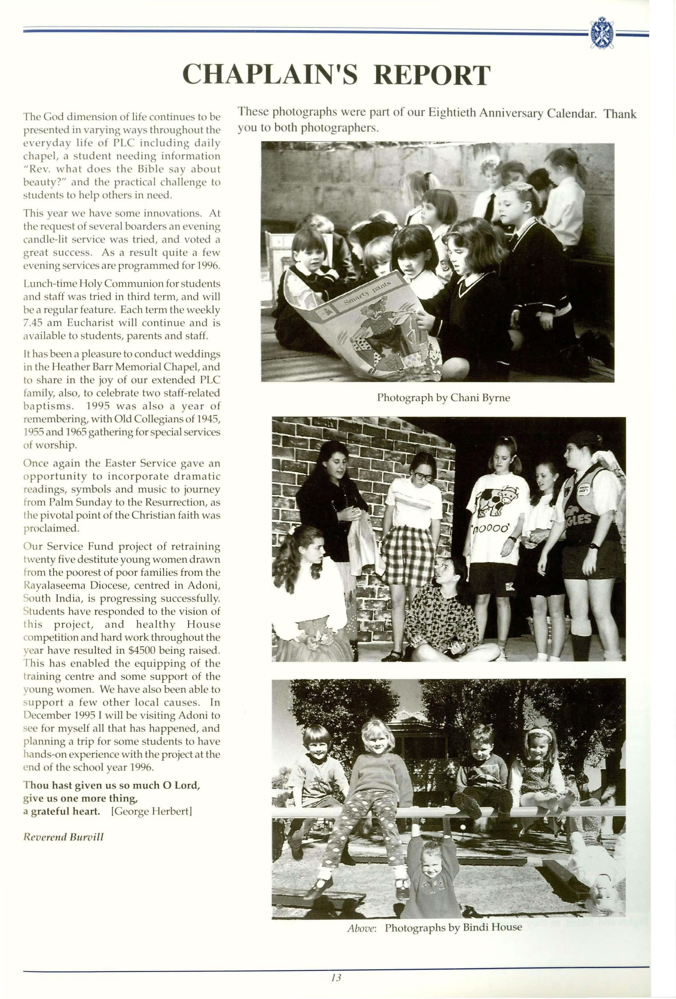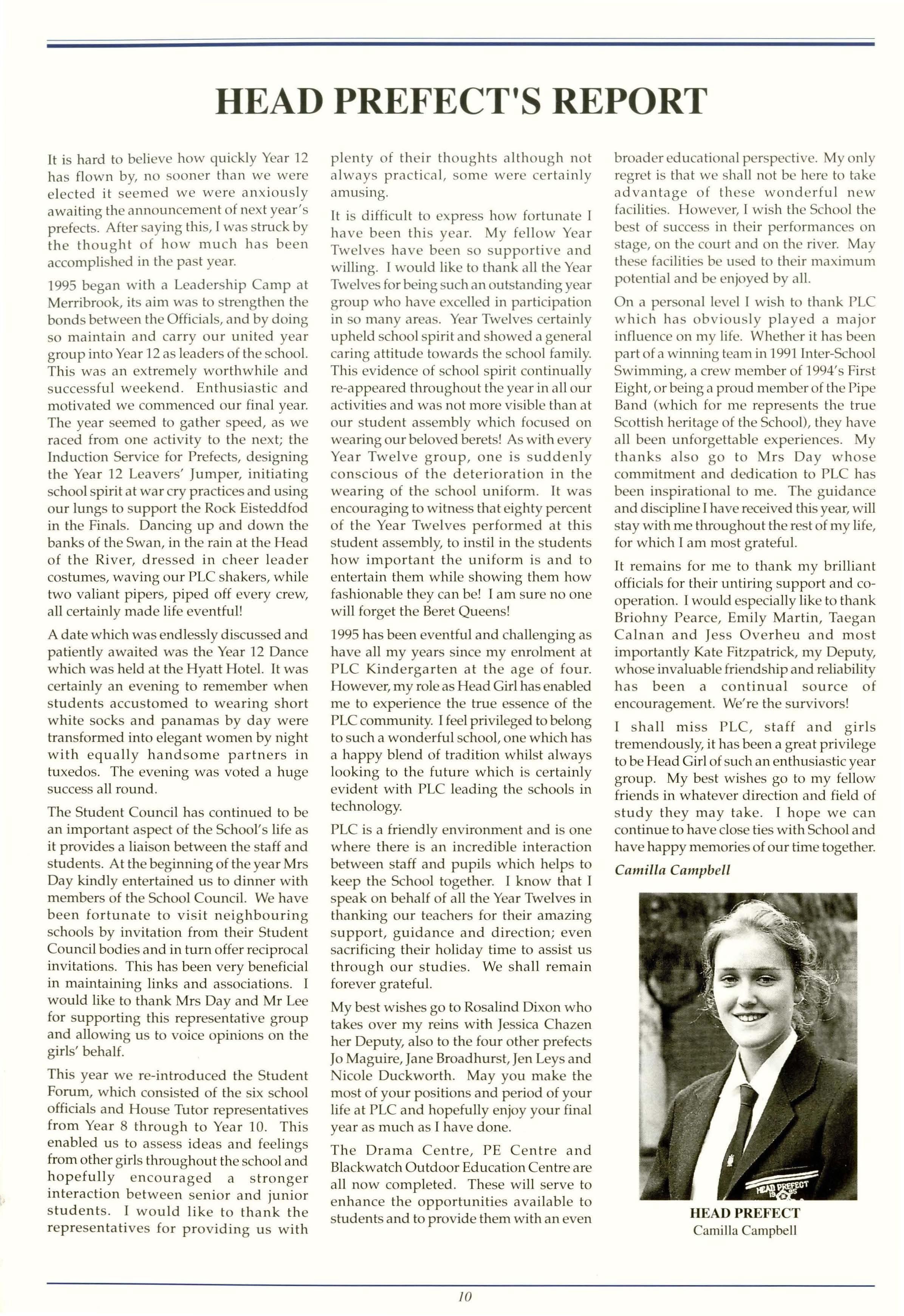 I have found the experience of being an editor unforgettable, and I hope that the piece we have presented is an adequate reflection of the enthusiasm and involvement of life here. The immense PLC spirit is difficult to portray, but I hope that all those who have ever had the opportunity of being a part of it may rediscover our school life of 1995 through this magazine. However, this production would never have been possibly without the help of so many people. The Kookaburra Committee has done a lovely job, taking photographs at every school occasion. Special thanks must also be extended to the incredibly supportive staff involved. To Mrs Mac, Mrs Ritchie, Mrs Best, Miss Dalton, and the English Department staff - our appreciation is endless. Our best wishes go to Kate and Sara as next year's editors. Thank you for your help at the end of this year, and we hope that 1996 will be as stimulating for you as this year has been for us.
