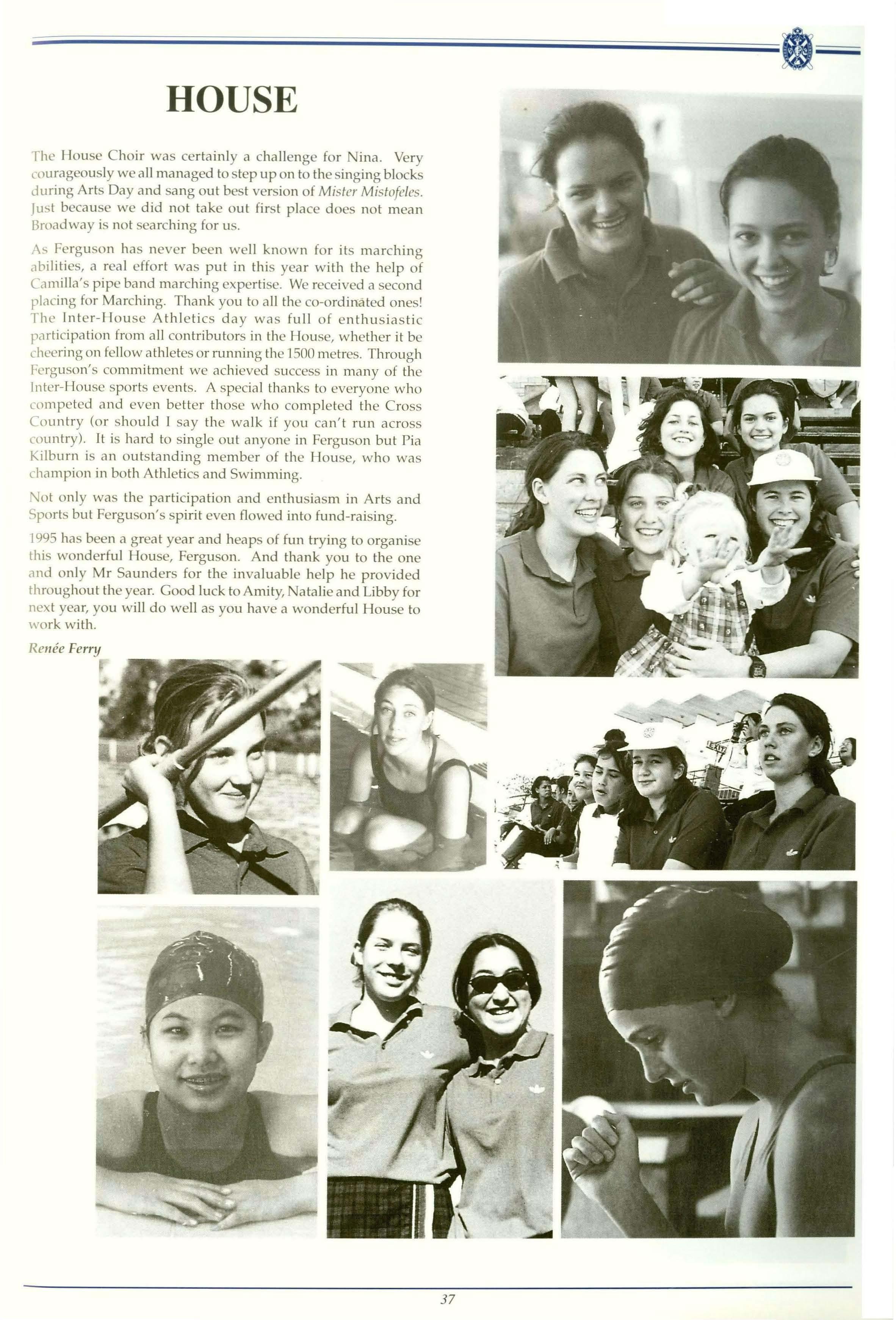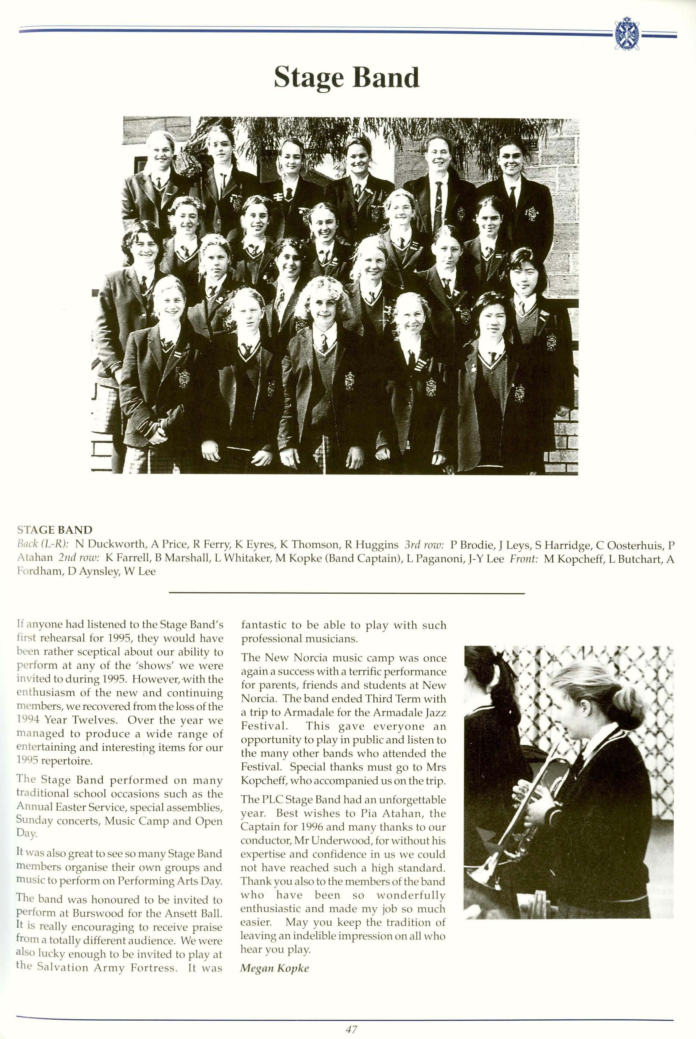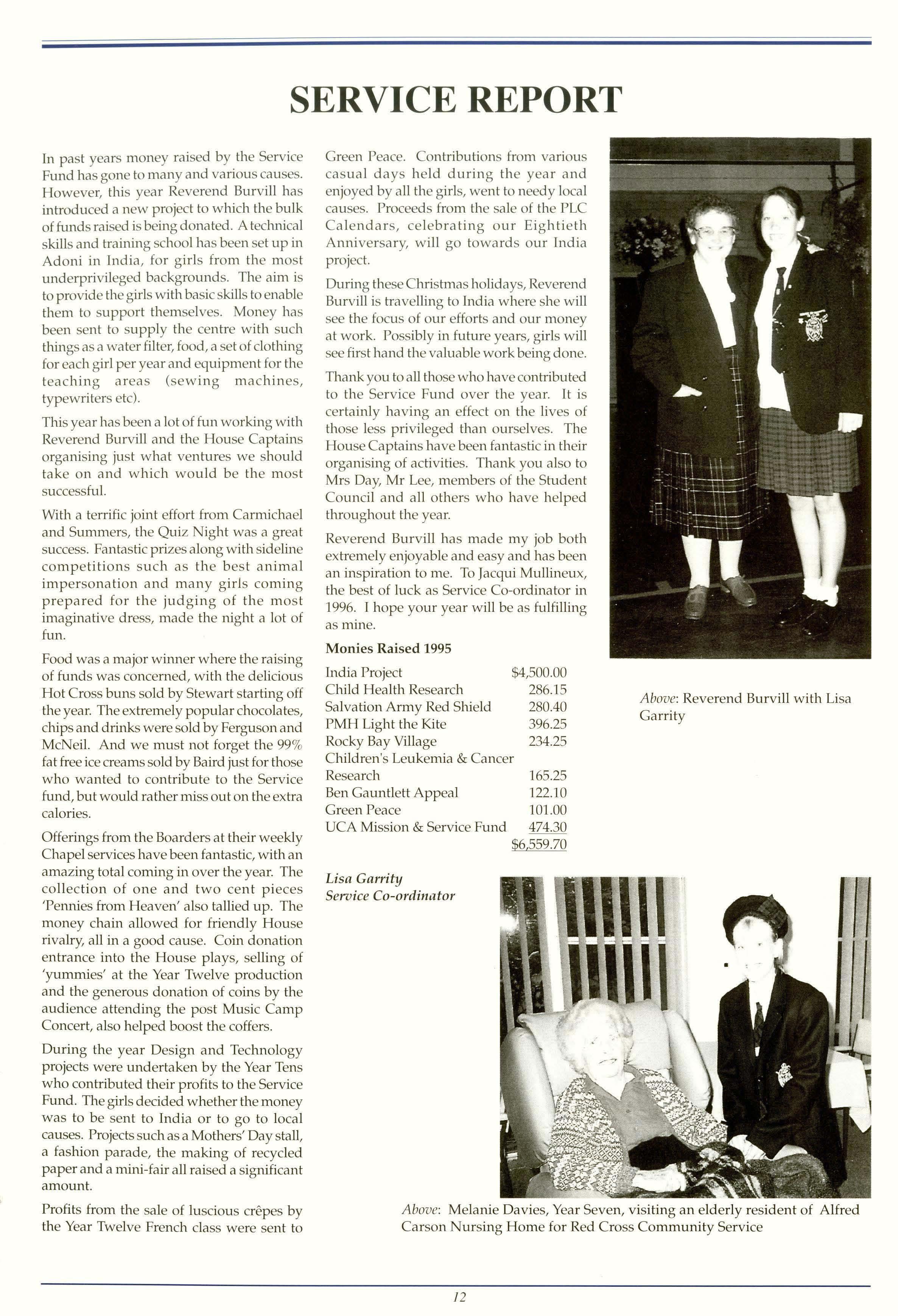 I have found the experience of being an editor unforgettable, and I hope that the piece we have presented is an adequate reflection of the enthusiasm and involvement of life here. The immense PLC spirit is difficult to portray, but I hope that all those who have ever had the opportunity of being a part of it may rediscover our school life of 1995 through this magazine. However, this production would never have been possibly without the help of so many people. The Kookaburra Committee has done a lovely job, taking photographs at every school occasion. Special thanks must also be extended to the incredibly supportive staff involved. To Mrs Mac, Mrs Ritchie, Mrs Best, Miss Dalton, and the English Department staff - our appreciation is endless. Our best wishes go to Kate and Sara as next year's editors. Thank you for your help at the end of this year, and we hope that 1996 will be as stimulating for you as this year has been for us.