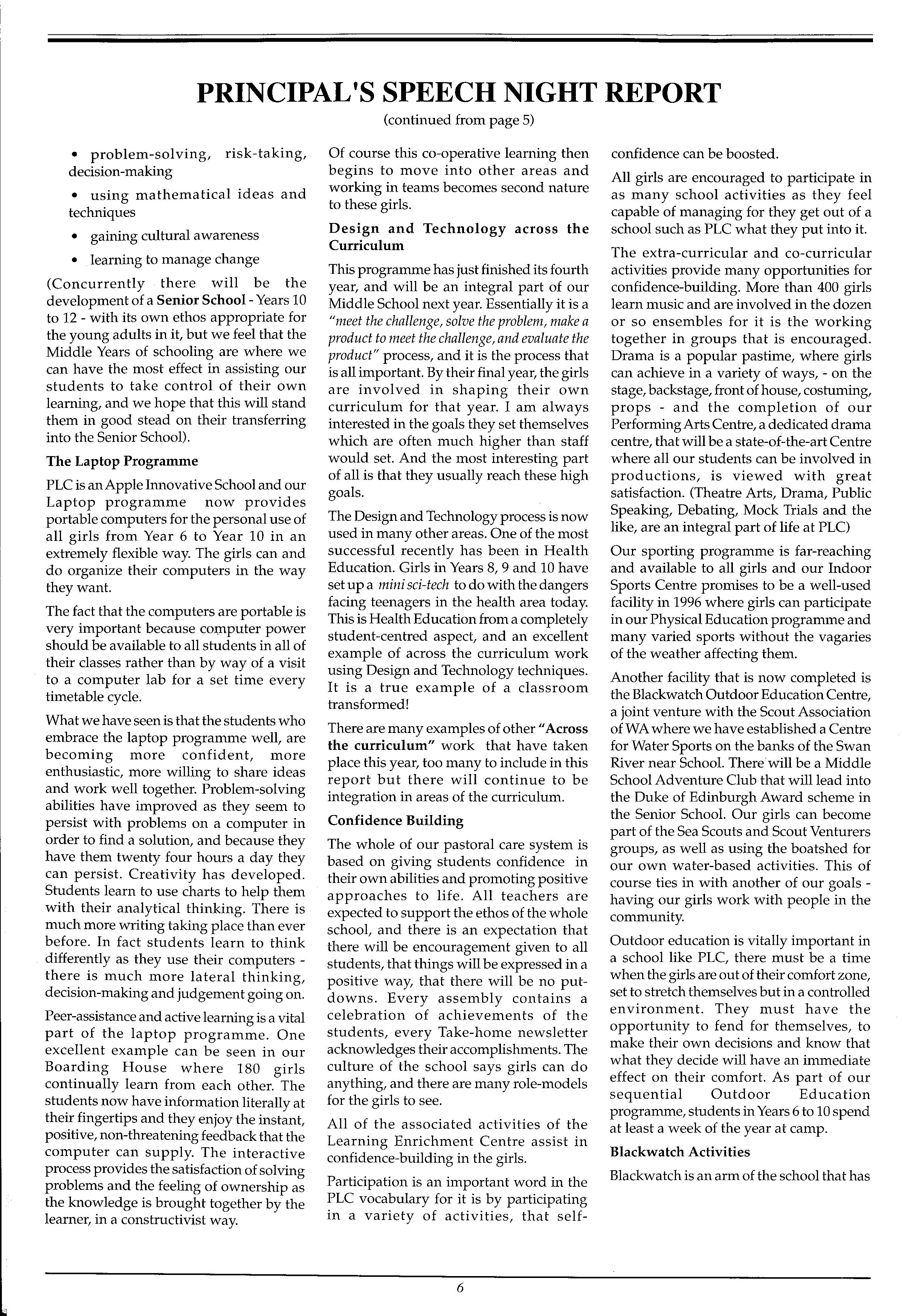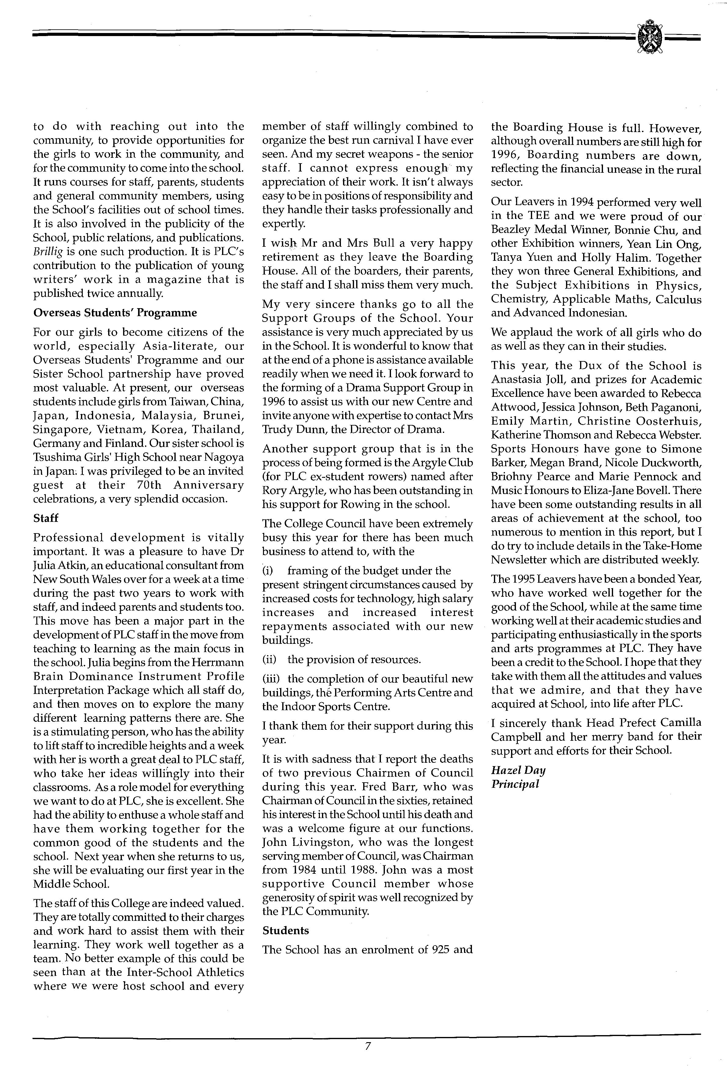 It was essential that we provide our girls with opportunities to take control of their own learning which would be independent, self-motivated learning, to give them the skills to learn in a variety of ways, to enable them to participate in lifelong learning, and to motivate them to do so. This could be done by student-centred techniques. Girls needed to become risktakers if they were to compete on an equal footing with men in life after PLC. They would have to become excellent team workers, with the ability to work cooperatively with others; they would have to know how to access knowledge, and use it well. They would have to recognize their own talents and use them well. Beliefs and values would continue to be important.