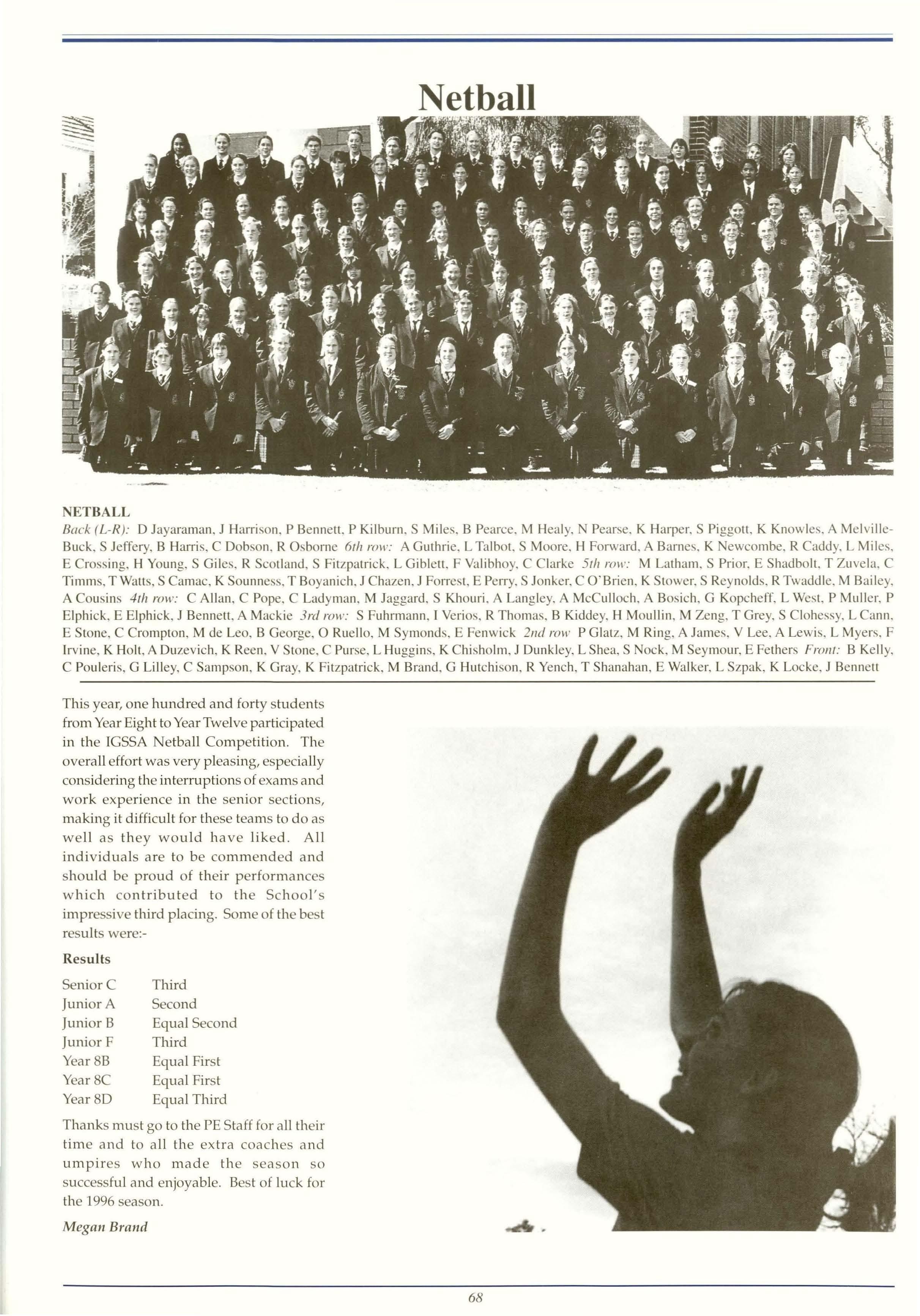 all games up to the semi-finals, yet unfortunately lost this game and finished third. Special thanks must go to our senior coach Elwyn Campbell, under fifteen coach Michelle Branson and to Miss Lienert, Reverend Burvill and Mrs Hatch for their time and effort during both seasons. Well done to all players and best of luck for next year's teams.
