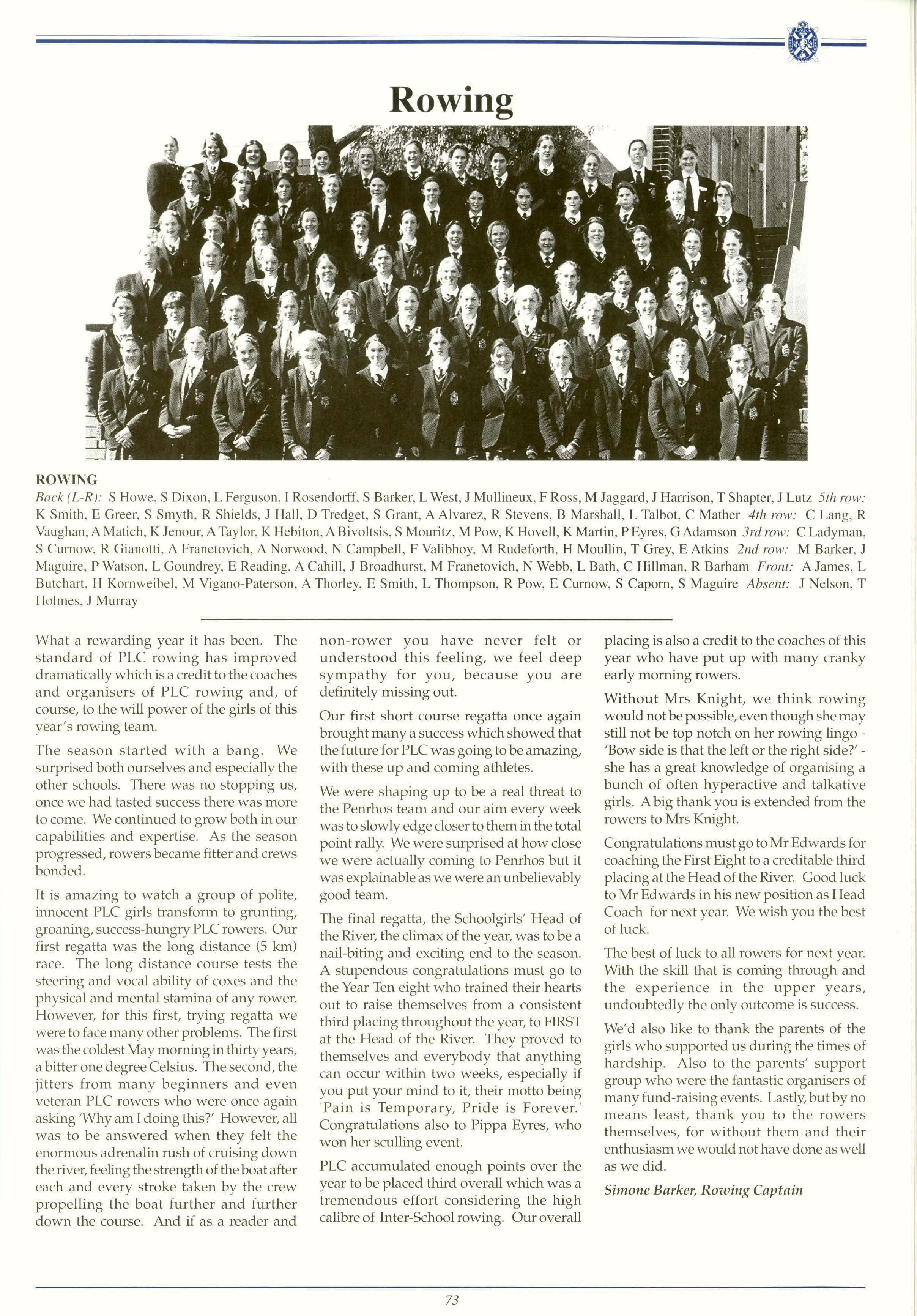 What a rewarding year it has been. The standard of PLC rowing has improved dramatically which is a credit to the coaches and organisers of PLC rowing and, of course, to the will power of the girls of this year's rowing team.