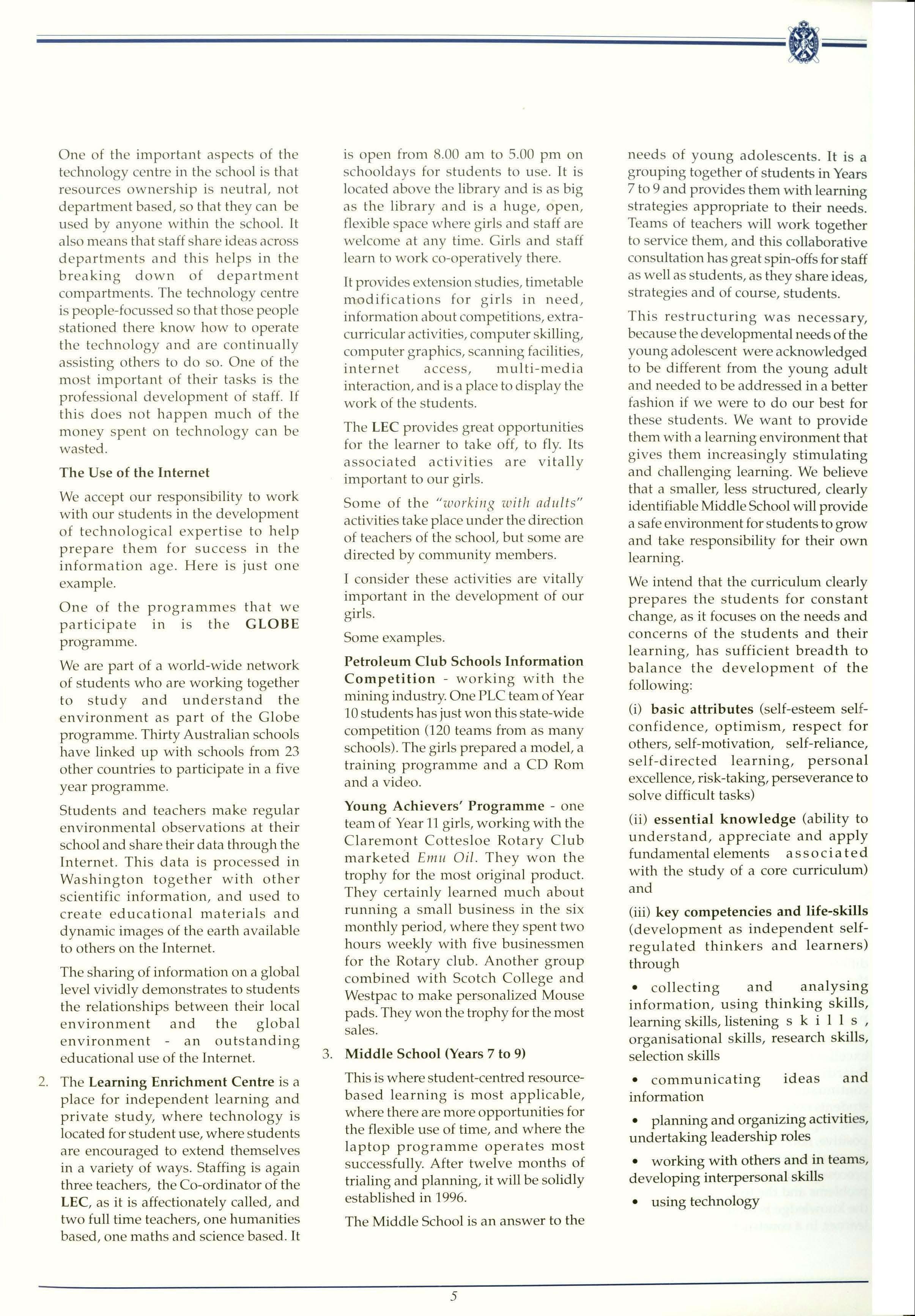 This is where student-centred resourcebased learning is most applicable, where there are more opportunities for the flexible use of time, and where the laptop programme operates most successfully. After twelve months of trialing and planning, it will be solidly established in 1996.