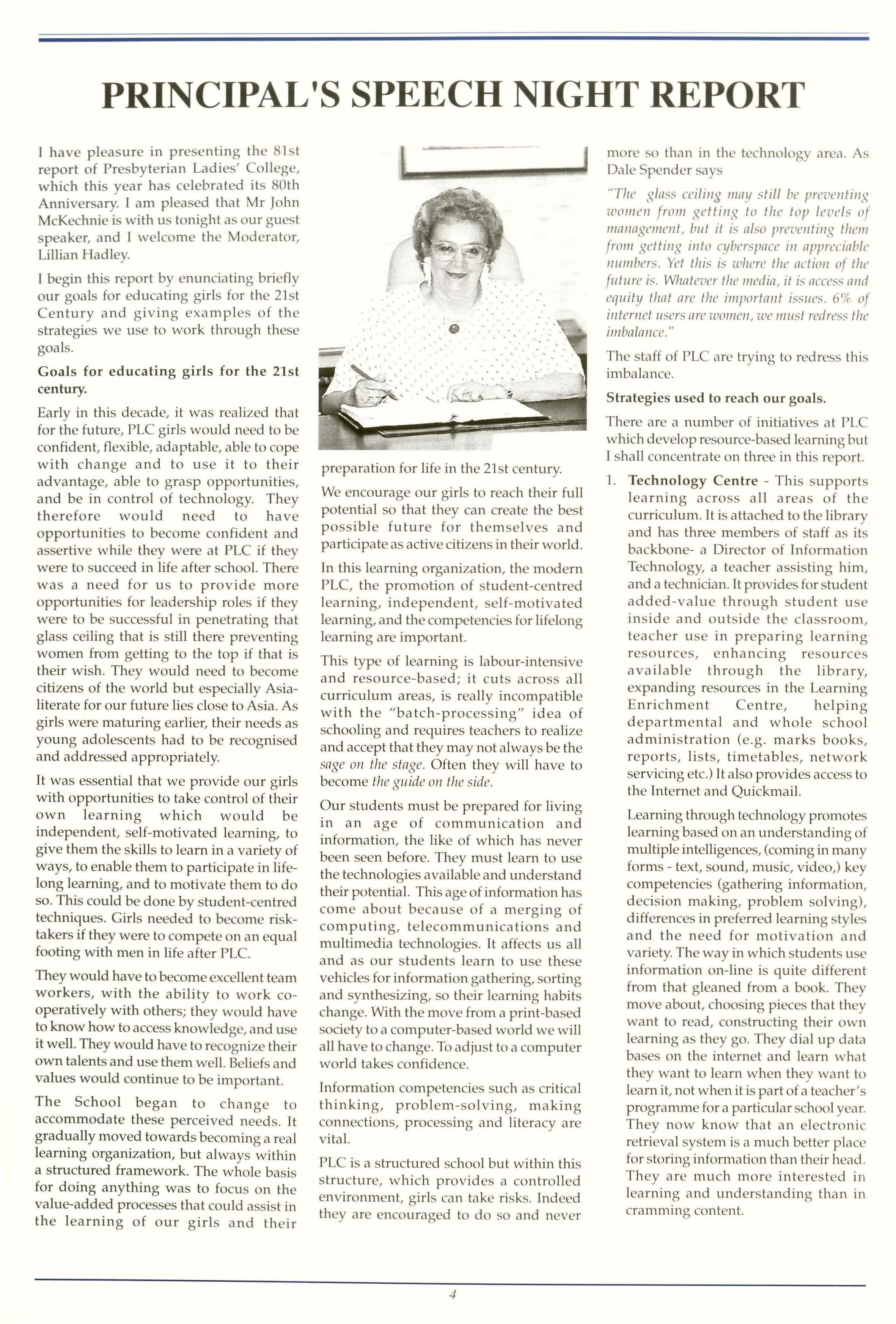 I have pleasure in presenting the 81st report of Presbyterian Ladies' College, which this year has celebrated its 80th Anniversary. I am pleased that Mr John McKechnie is with us tonight as our guest speaker, and I welcome the Moderator, Lillian Hadley.