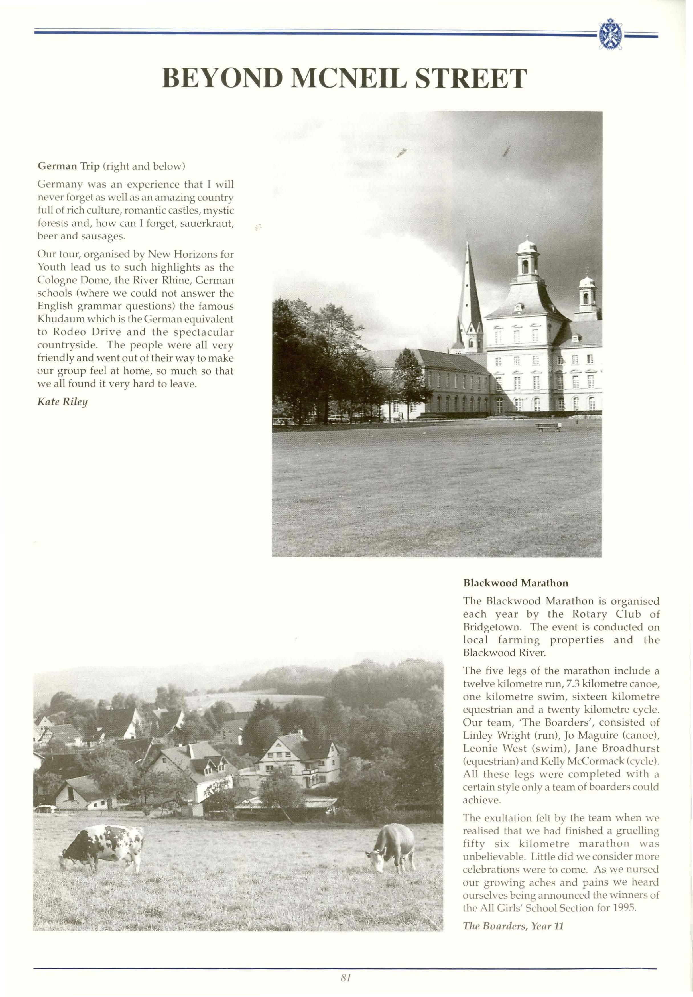 The exultation felt by the team when we realised that we had finished a gruelling fifty six kilometre marathon was unbelievable. Little did we consider more celebrations were to come. As we nursed our growing aches and pains we heard ourselves being announced the winners of the All Girls' School Section for 1995. The Boarders, Year 11