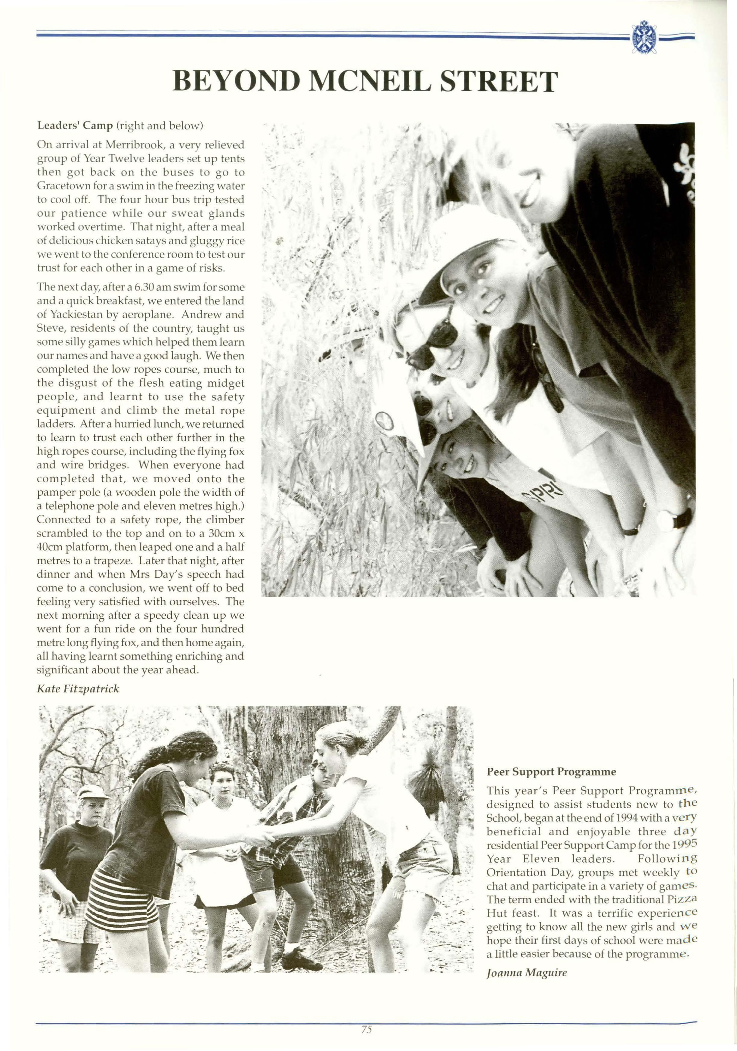 This year's Peer Support Programme, designed to assist students new to the School, began at the end of 1994 with a very beneficial and enjoyable three day residential Peer Support Camp for the 1995 Year Eleven leaders. Following Orientation Day, groups met weekly to chat and participate in a variety of games. The term ended with the traditional pizza Hut feast. It was a terrific experience getting to know all the new girls and we hope their first days of school were made a little easier because of the programme . Joanna Maguire