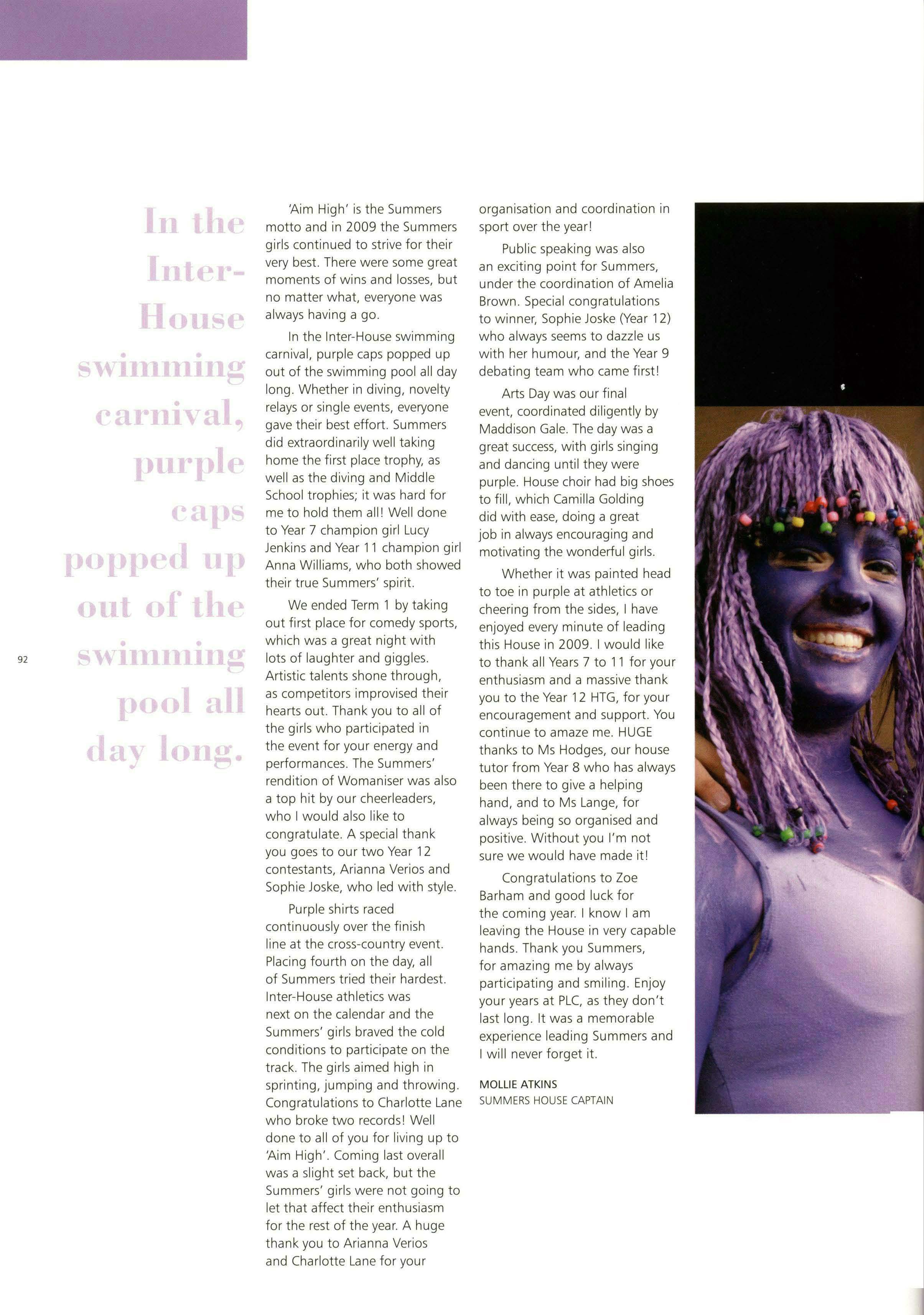 Whether it was painted head to toe in purple at athletics or cheering from the sides, I have enjoyed every minute of leading this House in 2009. I would like to thank all Years 7 to 11 for your enthusiasm and a massive thank you to the Year 12 HTG, for your encouragement and support. You continue to amaze me. HUGE thanks to Ms Hodges, our house tutor from Year 8 who has always been there to give a helping hand, and to Ms Lange, for always being so organised and positive. Without you I'm not sure we would have made it!