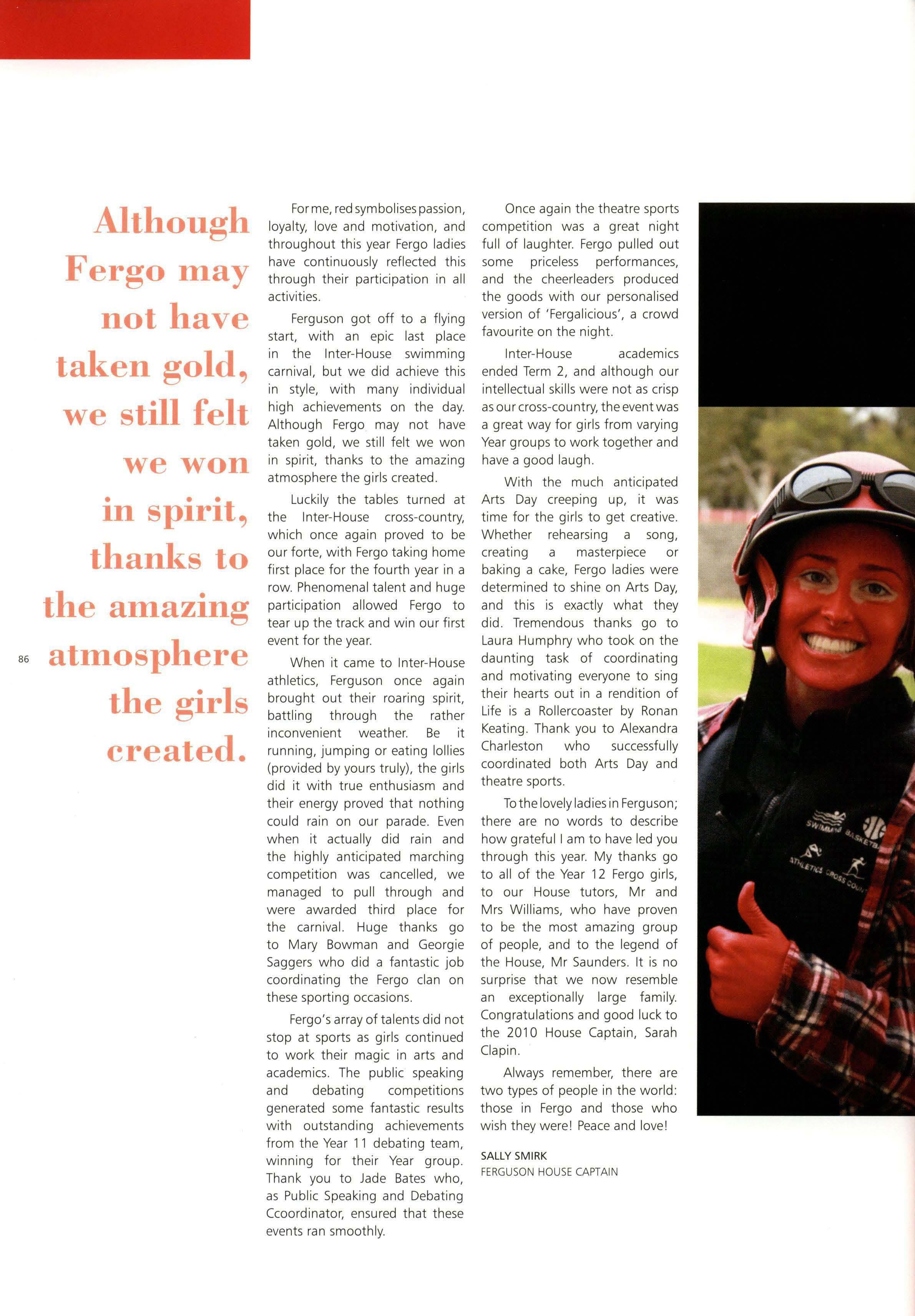 Tothe lovely ladies in Ferguson; there are no words to describe how grateful I am to have led you through this year. My thanks go to all of the Year 12 Fergo girls, to our House tutors, Mr and Mrs Williams, who have proven to be the most amazing group of people, and to the legend of the House, Mr Saunders. It is no surprise that we now resemble an exceptionally large family. Congratulations and good luck to the 2010 House Captain, Sarah Clapin.