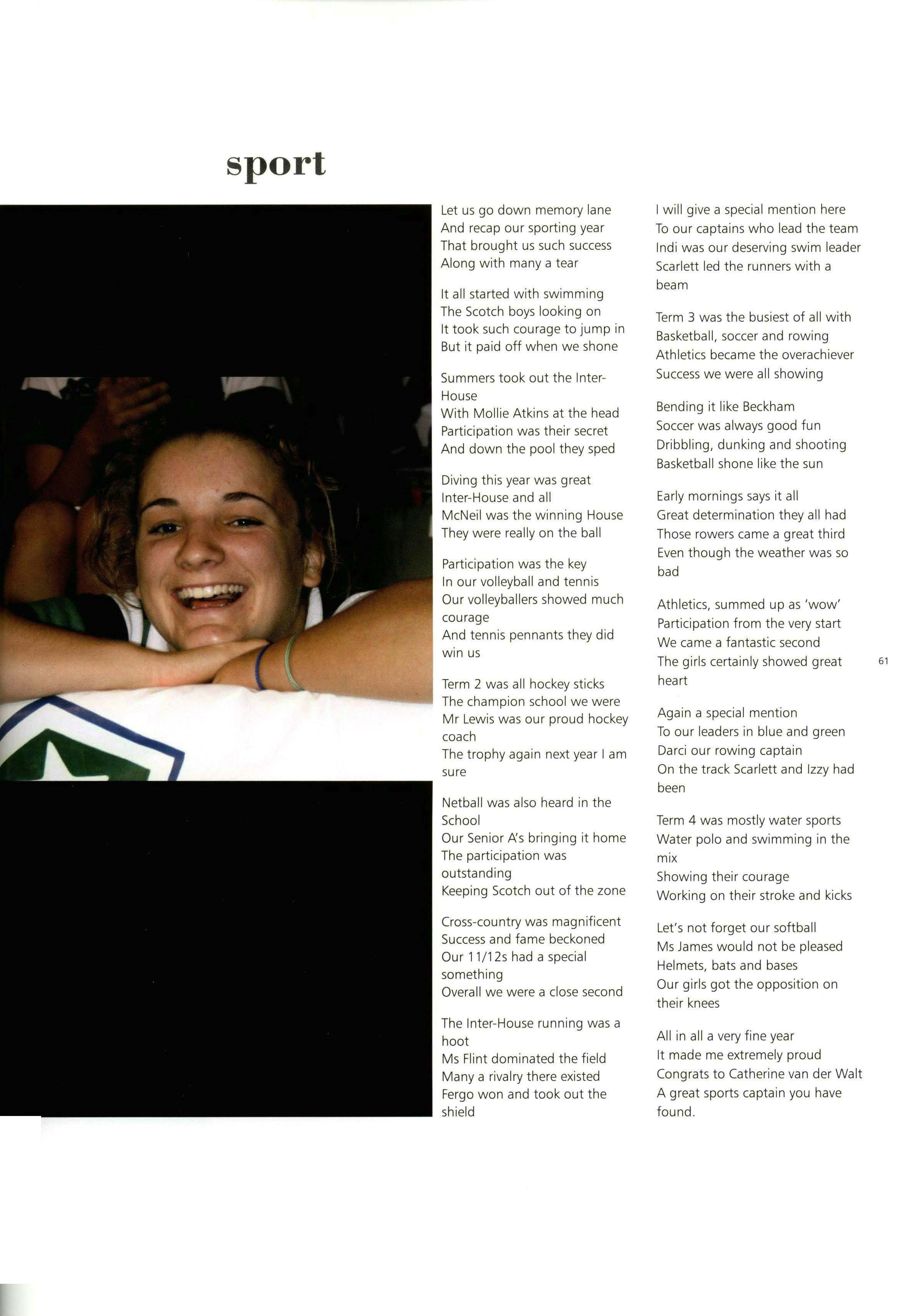 Well done again to Catherine van der Walt, Sports Captain for 2010. I am sure that she will be a great leader for you all and I wish her well in all her endeavours.