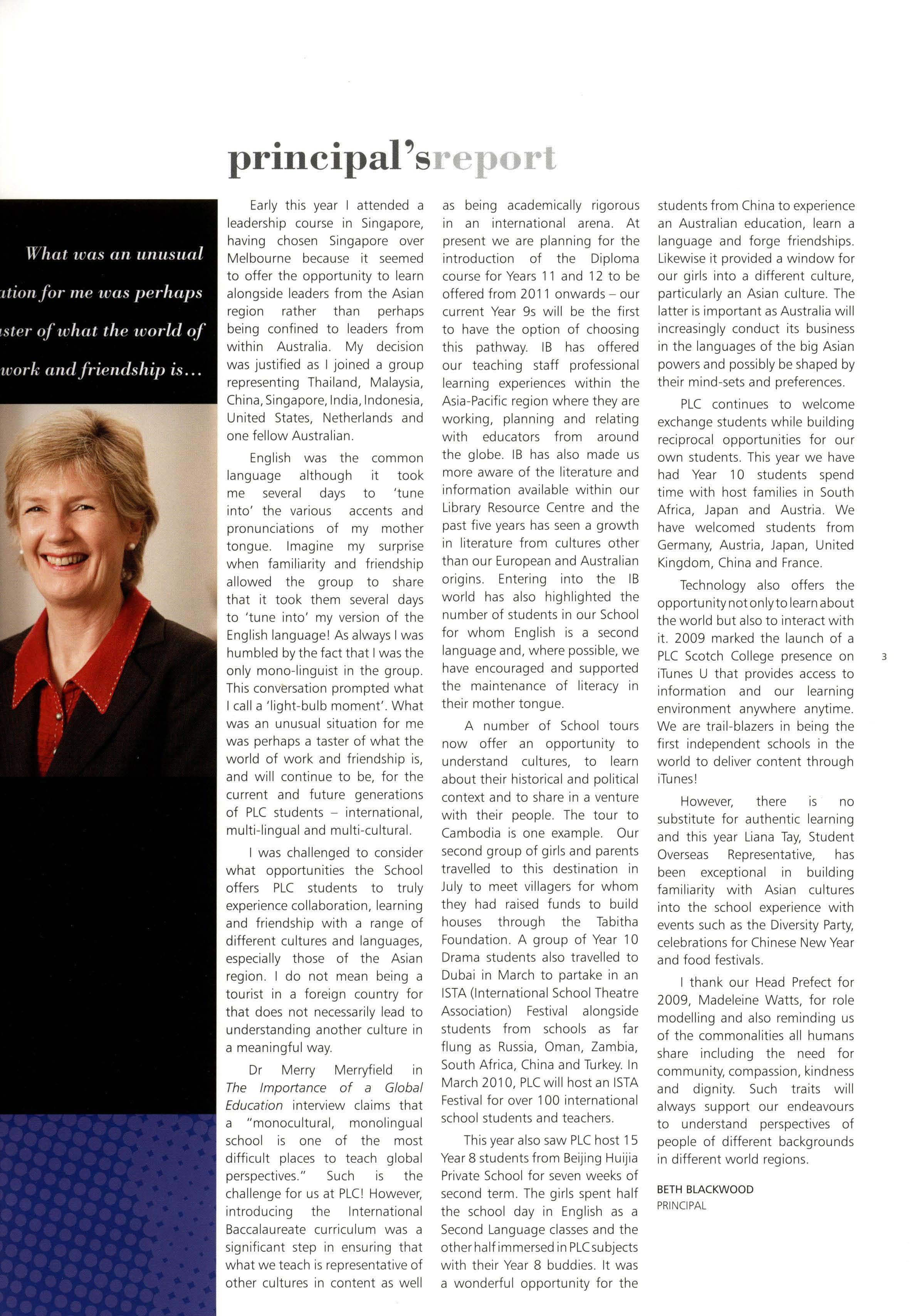 I would like to thank Ms Lukin, the staff and students for all their support and friendliness, which truly contributed to my enjoyment of my role as overseas representative. Next year, our Overseas Student Representative will be a School official position and will be working as part of the Service Team to enrich the PLC community. I wish our next overseas representative Amelia Spackman the best for 2010 and say for now; sayonara, au revoir, zai jian, selamat tinggal, arrivederci, farewell.
