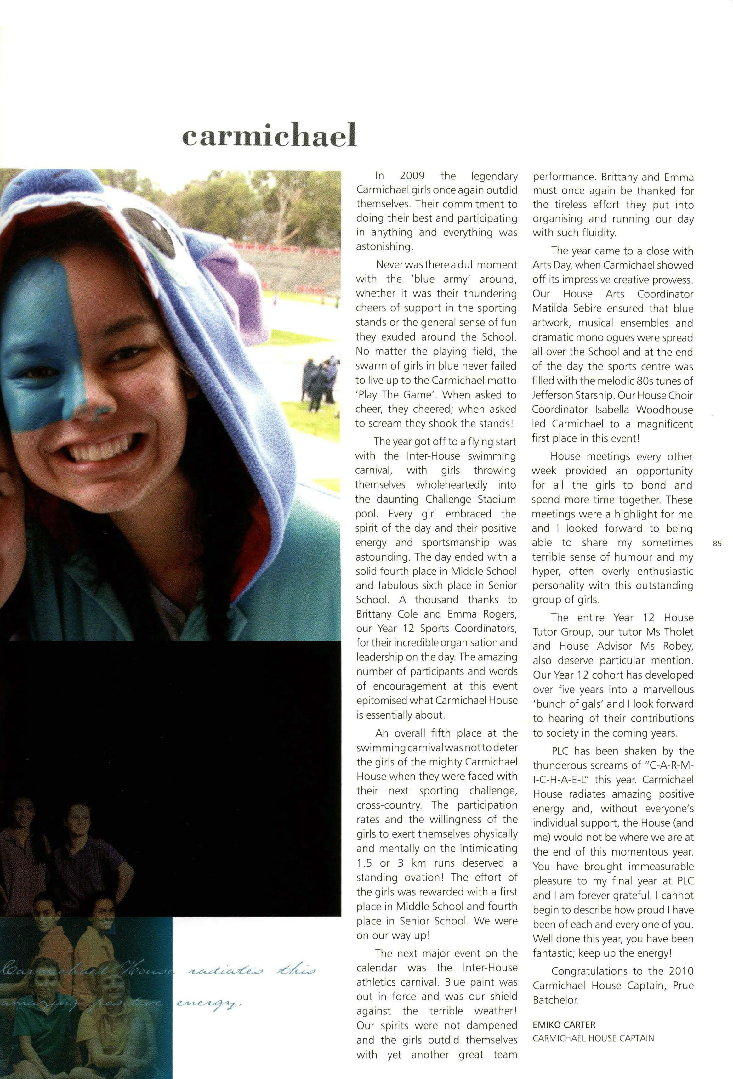 PLC has been shaken by the thunderous screams of "C-A-R-MI-C-H-A-E-l:' this year. Carmichael House radiates amazing positive energy and, without everyone's individual support, the House (and me) would not be where we are at the end of this momentous year. You have brought immeasurable pleasure to my final year at PLC and I am forever grateful. I cannot begin to describe how proud I have been of each and every one of you. Well done this year, you have been fantastic; keep up the energy!