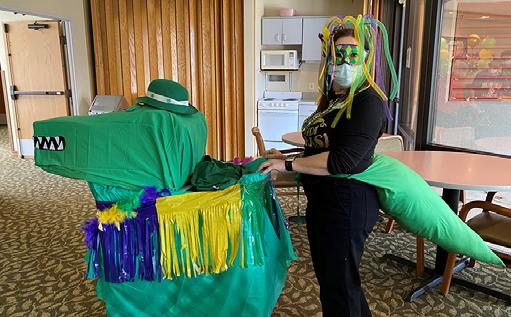 To celebrate the beginning of Lent, Executive Director Tammy Thompson encouraged each department in the community to decorate a cart and participate in the community’s firstever Manor of the Plains Mardi Gras parade. The event was a lot of fun with residents enjoying food, beads and entertainment. u