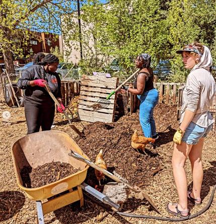 sunflowers, compost critter identification, and a "chicken play-pen" outside in the adjacent garden. The afternoon of activities culminated in a community meal: a "three sisters" chili with cornbread, kale slaw, seed cookies, tea, and coffee