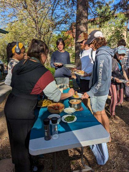 As the golden Harvest sun set over the Crossroads bridge, Angel Martinez of the Yavapai-Apache Nation gave an invocation. Angel talked about the importance of reciprocity and healing in our food systems and relationship with the Earth. We share the knowledge, skills, and support found within our community and previous generations to allow us to cultivate healthy gardens and food, and we must also remember to give back to the Earth and take care of her as we close the cycle of the Harvest season After the talk, an autumn meal was served. The meal included a squash soup, spaghetti squash pasta with pesto sauce, quinoa and beans, sourdough rolls, and a roasted veggie medley All produce was sourced locally from the Prescott Farmers Market including Whipstone, Aguiar, and Hernandez Farms, and even some from our campus gardens!