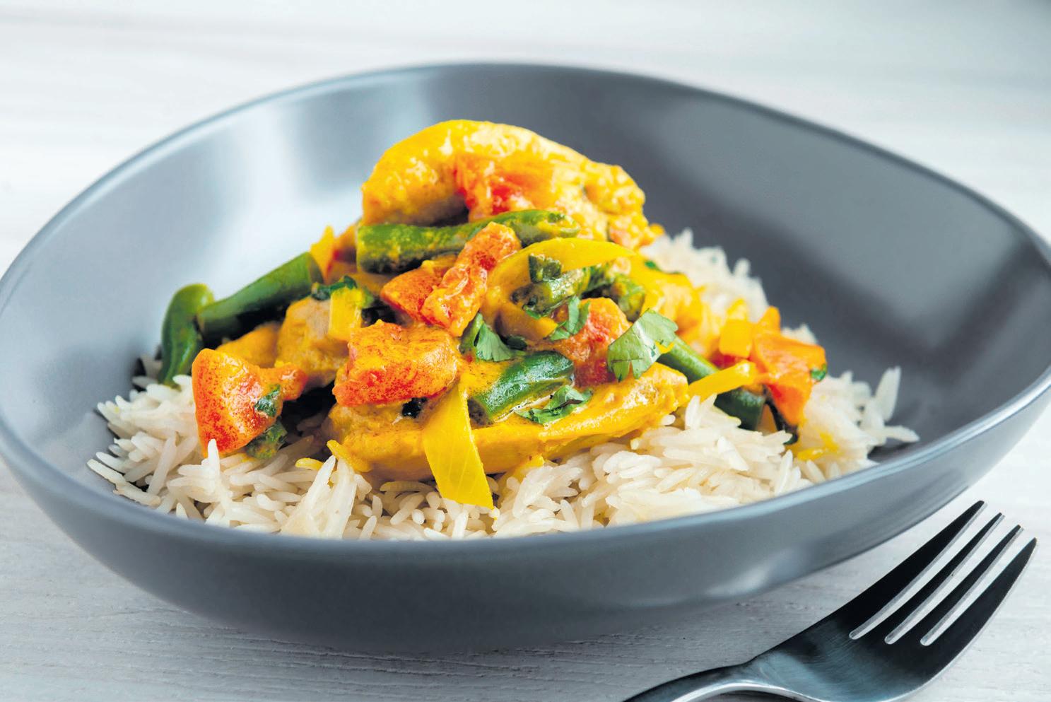 1. Cocine el arroz basmati según las instrucciones del empaque. Mientras el arroz se cocina, en un recipiente coloque el pollo y añada 2 cucharadas de la leche, 1½ cucharadita de curry, sal y pimienta al gusto. Mezcle bien y coloquelo aparte.