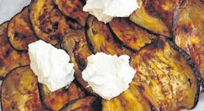 berenjena, extendemos la crema de queso, añadimos las lascas de jamón y repartimos los trocitos de tortilla.
