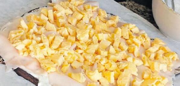 Batimos los tres huevos, hacemos una tortilla o tipo revoltillo y, una vez lista, la cortamos en cuadraditos y reservamos.