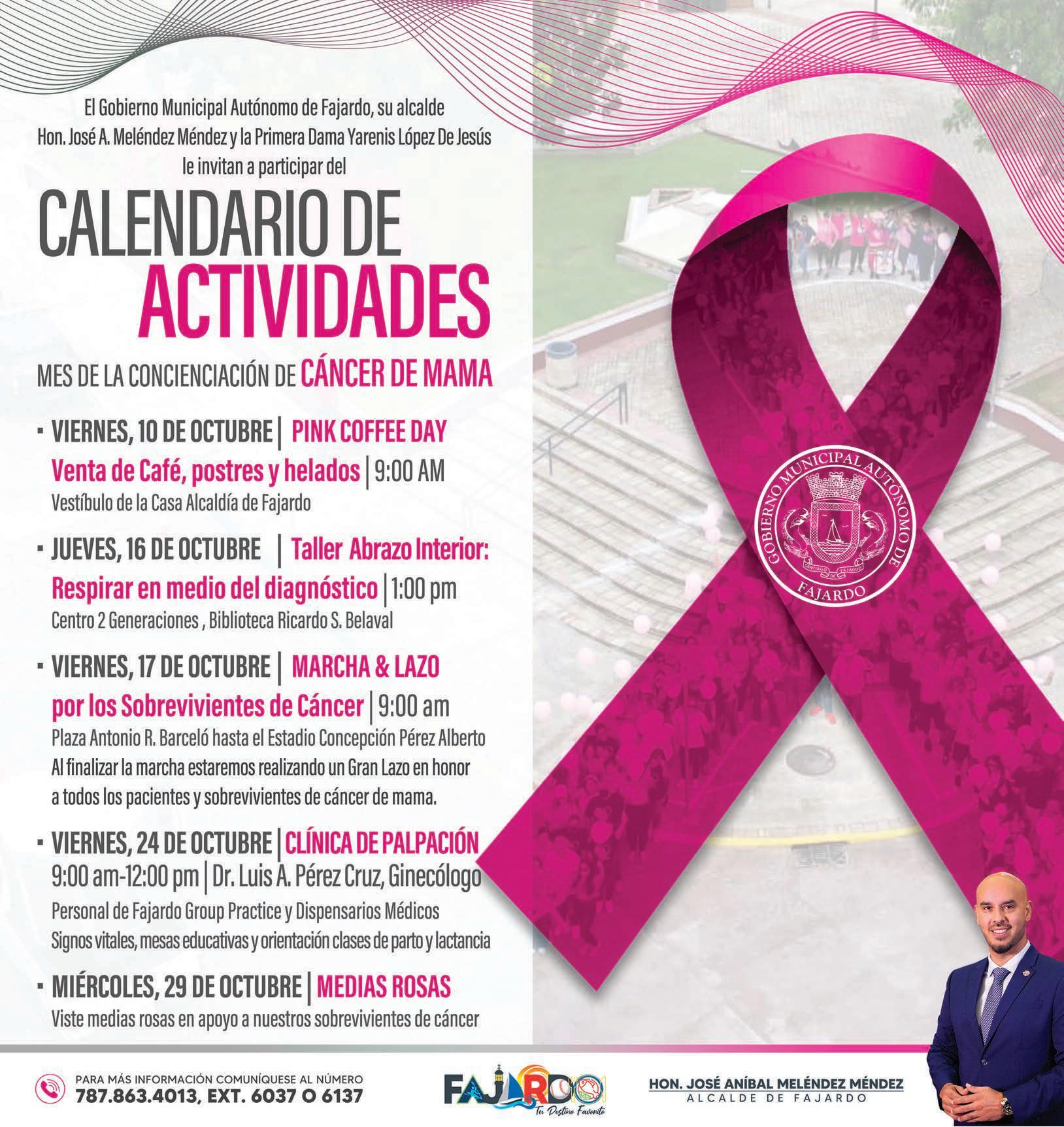 El calendario de actividades incluye un evento para recaudar fondos para la Sociedad Americana contra el Cáncer, denominado “Pink Co ee Day”, el viernes, 10 de octubre, y el taller “Abrazo Interior: Respirar en medio del diagnóstico”, que se llevará a cabo el jueves, 16 de octubre, a la 1:00 p.m. en el Centro 2 Generaciones en la biblioteca del pueblo. Entre los eventos también se realizará una marcha y lazo en solidaridad con los pacientes, que será el viernes, 17 de octubre a las 9:00 a.m., partiendo de la plaza pública hasta el Estadio Concepción Pérez Alberto, así como una clínica de palpación que se realizará el jueves, 24 de octubre en la Casa Alcaldía. El cáncer de mama es el tipo de cáncer más común en mujeres alrededor del mundo y una de las principales causas de muerte. Sin embargo, la detección temprana a través de autoexámenes, mamografías y chequeos médicos aumenta signi cativamente las posibilidades de tratamiento efectivo y recuperación.