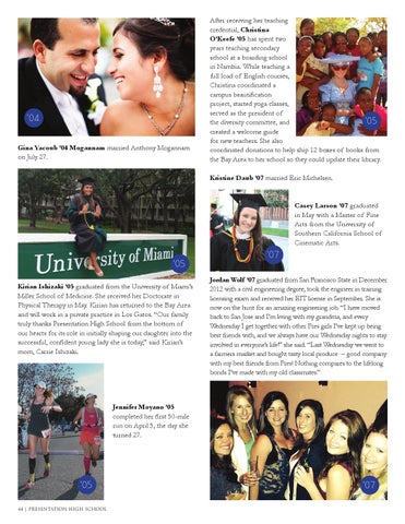 ’05 Kirian Ishizaki ’05 graduated from the University of Miami’s Miller School of Medicine. She received her Doctorate in Physical Therapy in May. Kirian has returned to the Bay Area and will work in a private practice in Los Gatos. “Our family truly thanks Presentation High School from the bottom of our hearts for its role in initially shaping our daughter into the successful, confident young lady she is today,” said Kirian’s mom, Carrie Ishizaki.