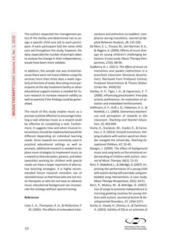 The result of this study implies music as a prompt could be effective to encourage initiating a task whereas music as a reward could be effective to completing a task. Furthermore, it suggests how and when musical interventions should be implemented would be different depending on individual learning needs. Since rewards are commonly used in practical educational settings as well as prompts, additional research is needed to explore more strategies to implement music as a reward so that educators, parents, and other specialists working for children with special needs can have a larger repertoire of alternative teaching strategies. It is highly recommended future research considers use of recorded music so that those who are not music therapists or who do not have an advance music educational background can incorporate the strategy without special training. References