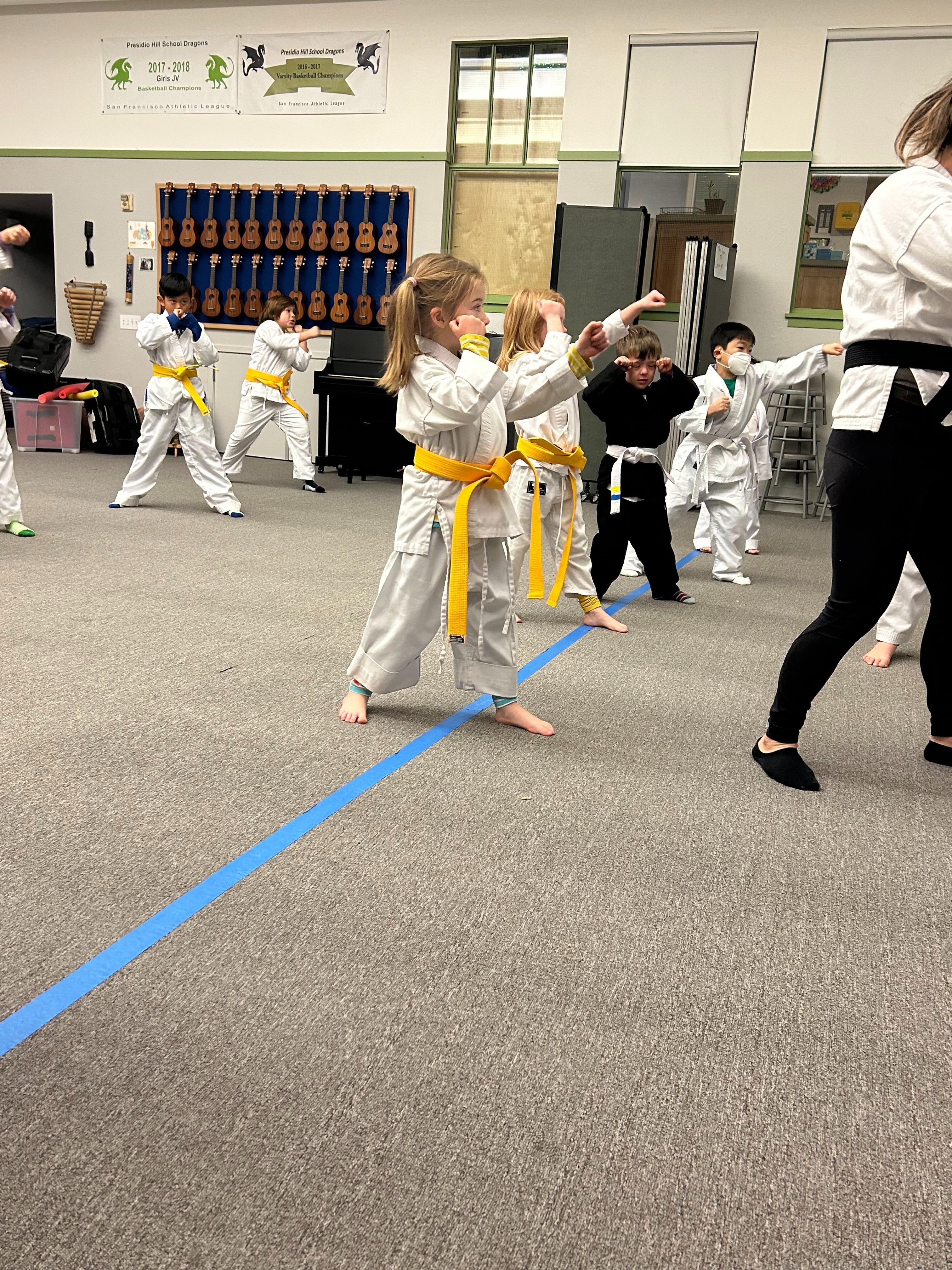 In this class, students will learn striking, and self -defense techniques in a safe and controlled environment . The class aims to empower students to develop confidence, body awareness , and coordination that can translate into areas of academics and sports. In the beginning of the class, Coach Maggie will take the class through warm ups and she will explain the technique or concept of the day. Students practice and drill these techniques and concepts with Coach Maggie’s guidance. Students will have the opportunity to go up in ranks ( belts) based on the knowledge of techniques. Due to the nature of the class, Students are encouraged to wear comfortable (athletic) clothing and bring water to class. Uniforms are optional and can be purchased through Coach Maggie or online. If purchasing a uniform online, please be all white, black or blue blank uniforms