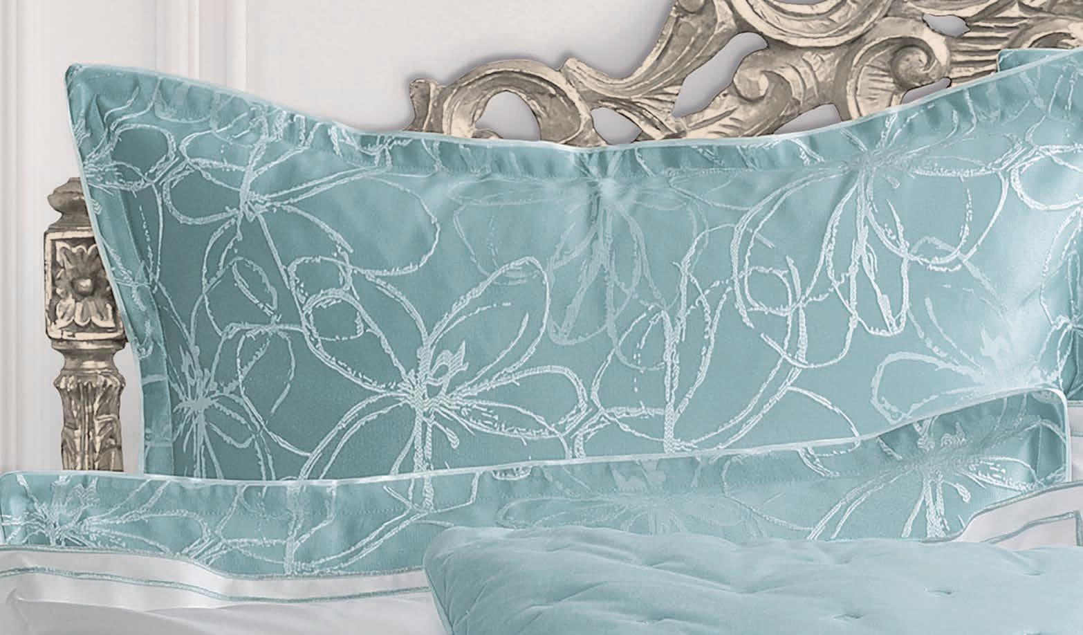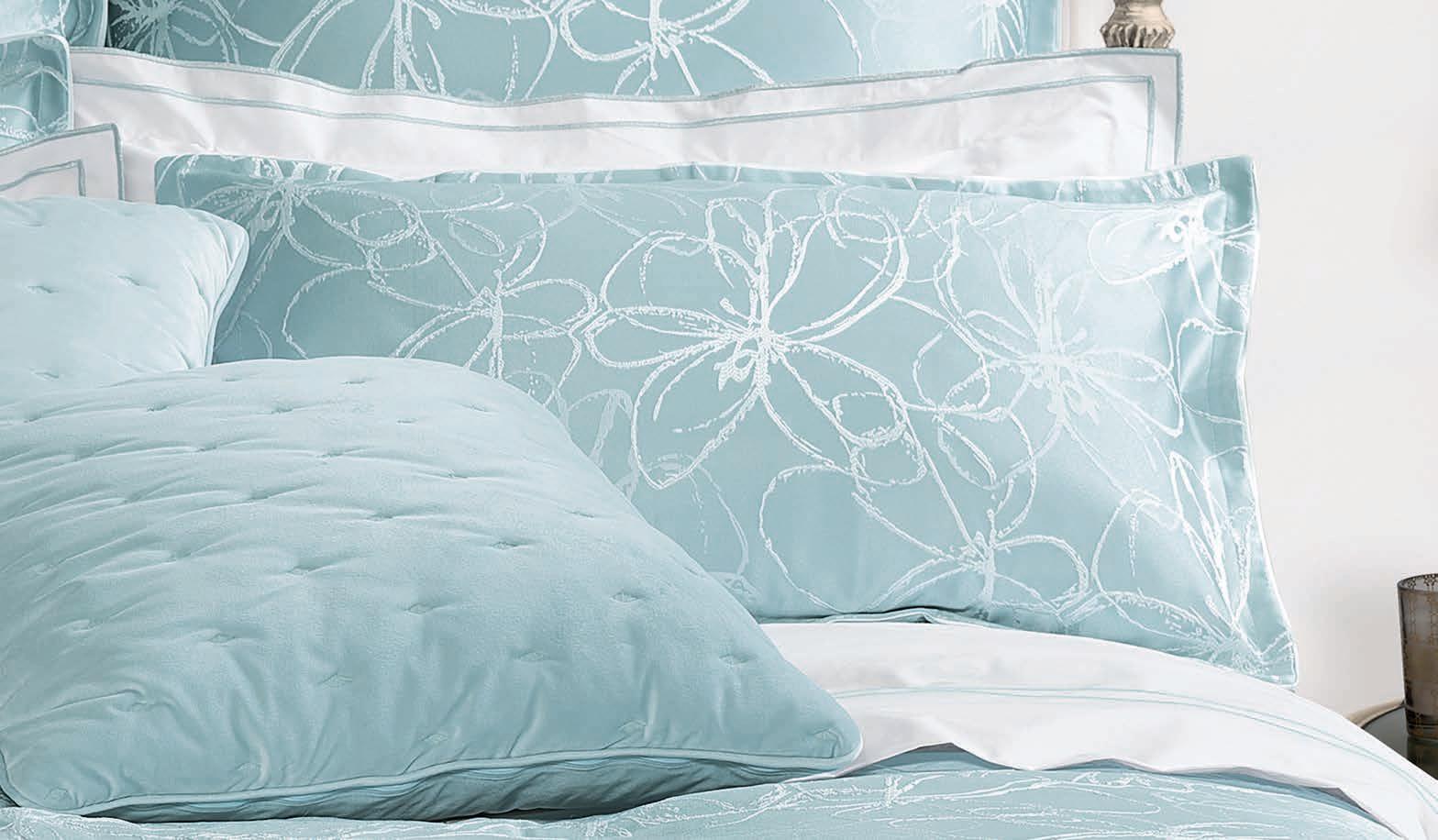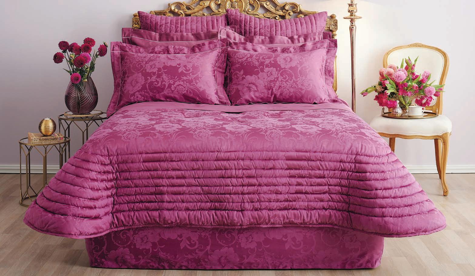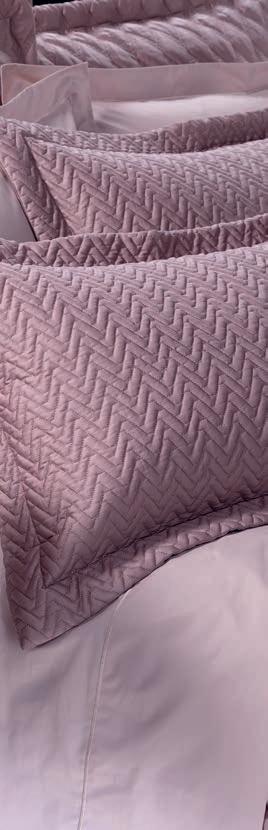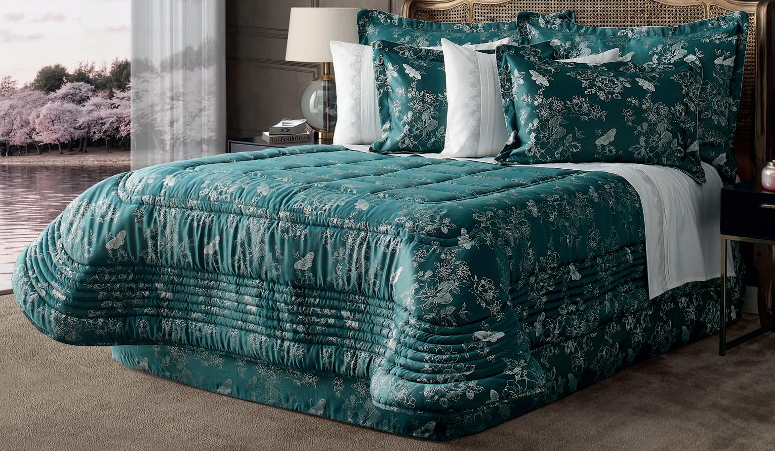 Quilted comforter with binding, oxford-style standard pillowcases trimmed with a lurex piping edge, oxford-style continental/emperor pillowcases trimmed with a lurex piping edge, bed skirt