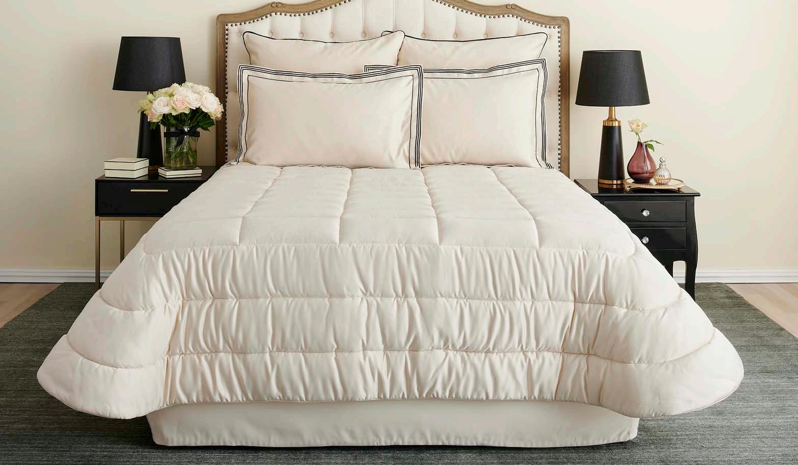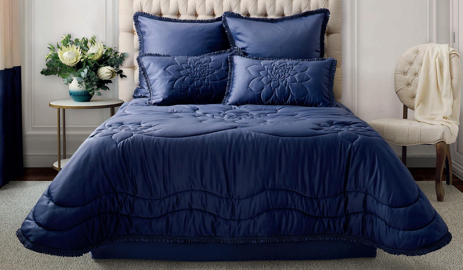 Quilted comforter with binding, oxford-style standard pillowcases trimmed with satin ribbon edge, oxford-style continental/emperor pillowcases trimmed with satin ribbon edge, bed skirt