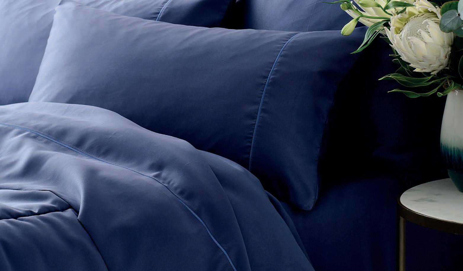 Oxford-style standard pillowcases with double flange and satin stitch detail, top sheet with satin stitch detail, fitted bottom sheet