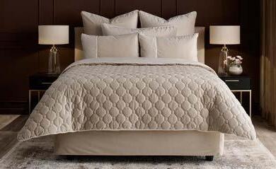 Quilted in Pres Les Tessuto, Cleo creates an inviting ambience with soft, neutral colours and a clean, minimalistic grid design. The intricately embroidered Velvet scatter creates consistency with its matching bed skirt.
