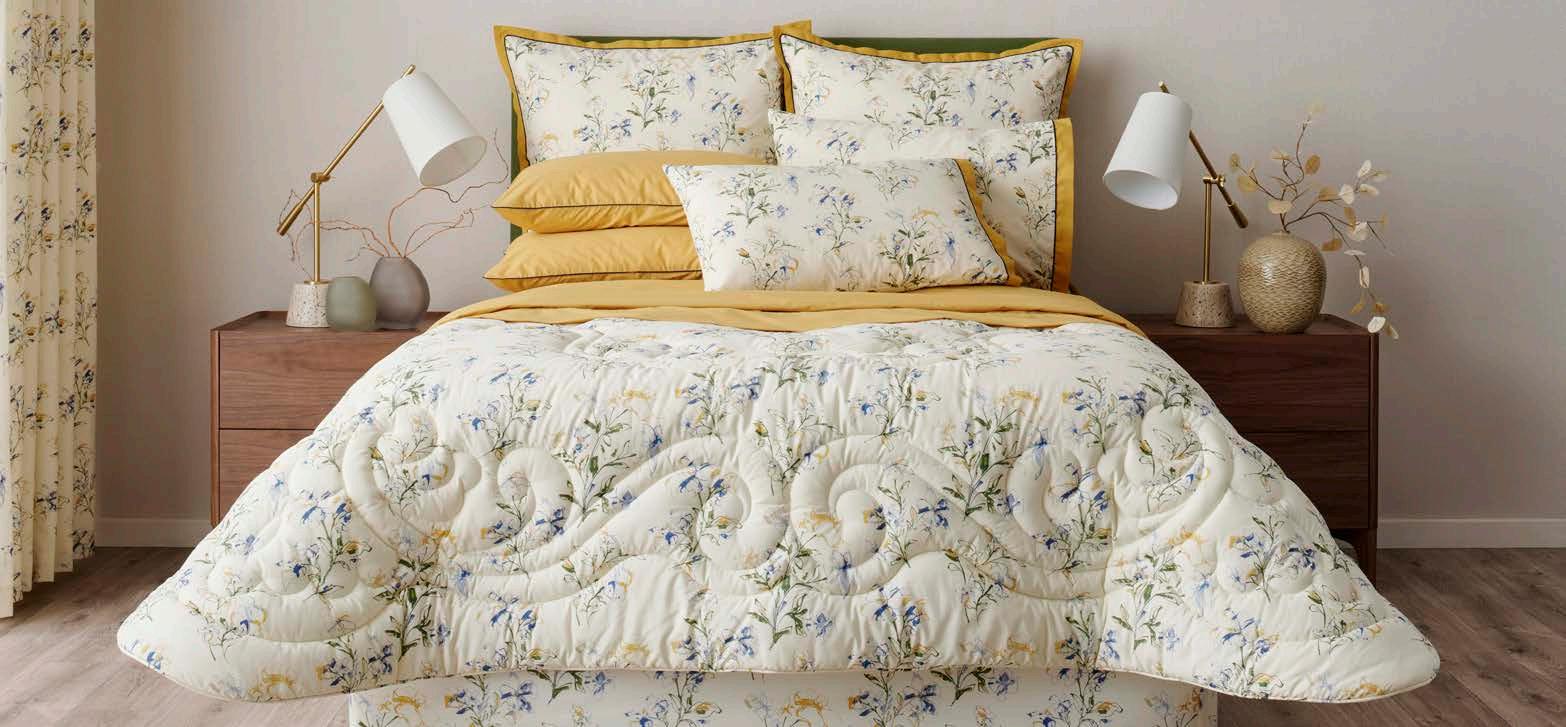 Bring warmth and cheer to your room with Nancy’s charming floral design, in shades of green, yellow and blue. Paired with a honey-coloured sheet set, Nancy is as lovely as a blossoming meadow on a sunny day!