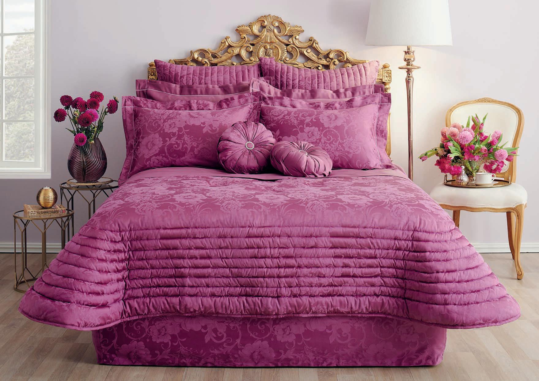 In a fabulous shade of Fuchsia, Lola adds a tailored twist to a traditional diamond quilt design, decorating silky Pres Les Tessuto with embroidered spiral detailing and cord piping.