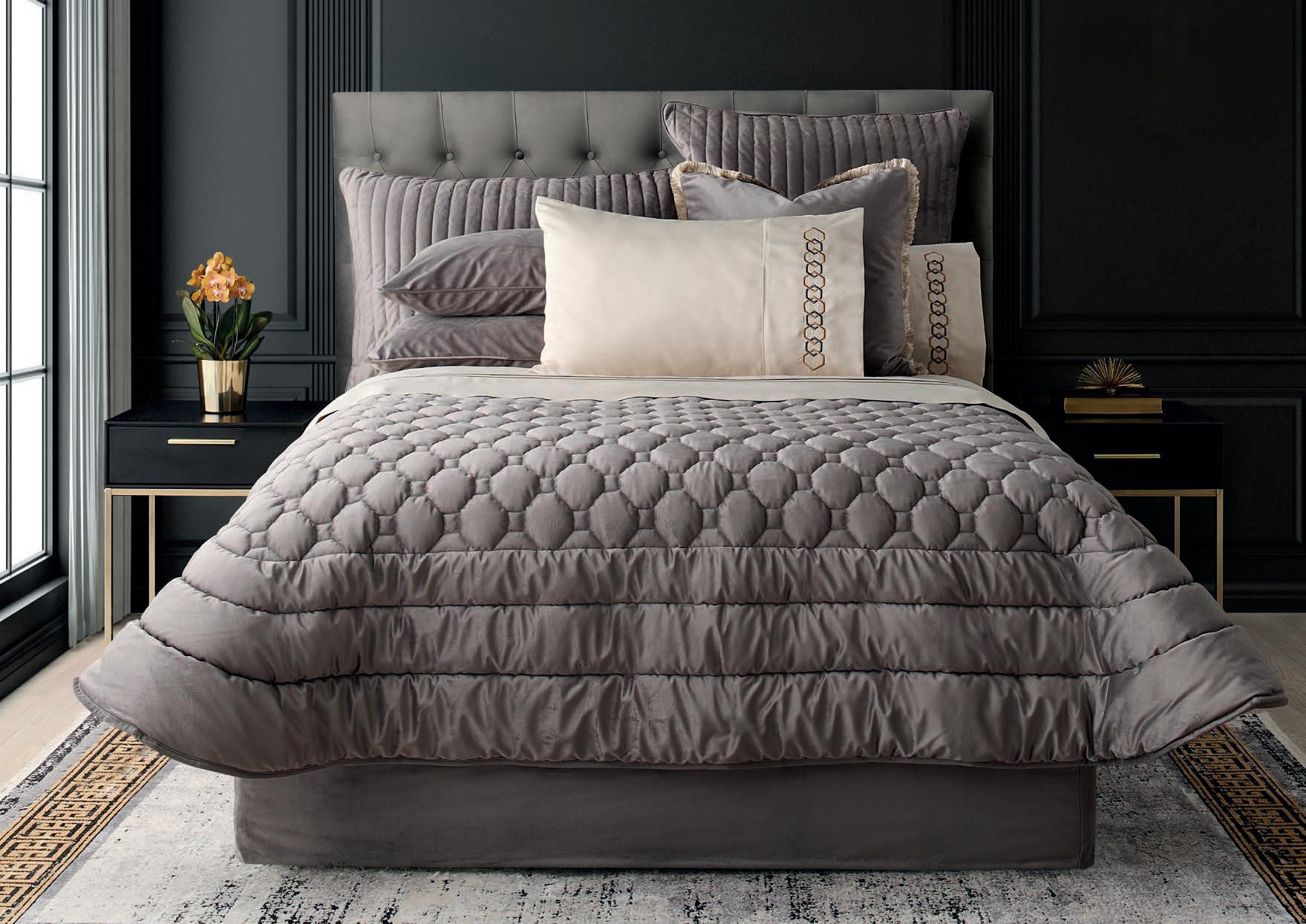 Rich in texture and unmistakably opulent, Royale Grey combines geometric quilting and channel tufting in sumptuous layers of velvet. With a bespoke embroidered sheet set, in lustrous Pres Les Tessuto, Royale is luxuriously lush, dressing the bed in a contemporary neutral palette.