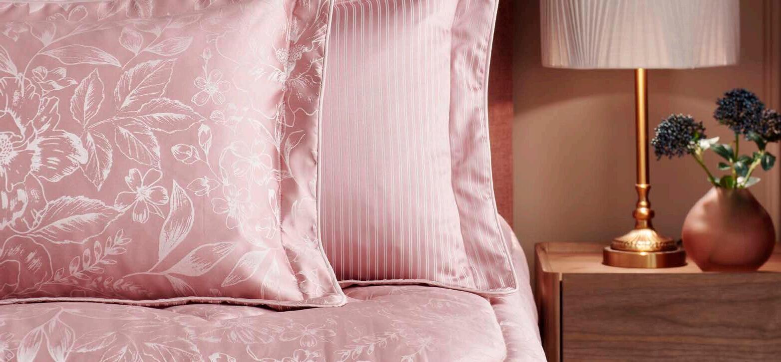 Carnation’s woven floral design is paired with classic pinstripes, in a romantic shade of Rouge Pink. The diamantéstudded logo motif adds sparkle and sophistication to the scatter cushion.