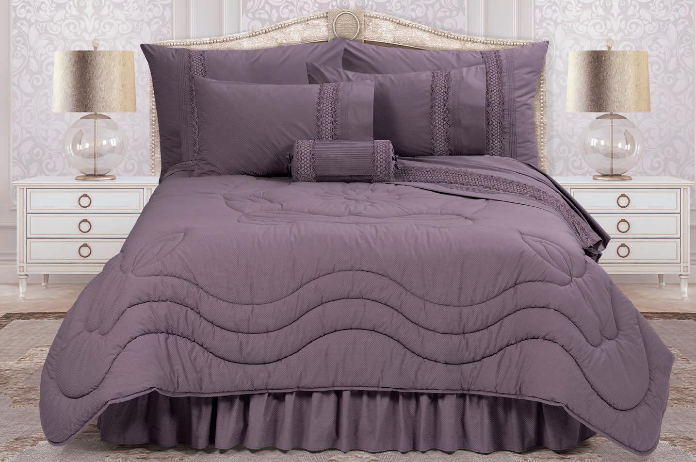 10 Piece Ensemble 6 PIECE COMFORTER ENSEMBLE PLUS 4 PIECE SHEET SET, IN PRINTED PRES LES COTTON PERCALE BLEND Standard pillowcases with pin tucks and guipure lace detail Top sheet with pin tucks and guipure lace detail Fitted bottom sheet BUY ON CREDIT FOR ONLY *Monthly instalments include VAT, delivery and service fees. DOUBLE QUEEN KING 24 Months R 437.00 R 458.00 R 495.00 18 Months R 539.00 R 565.00 R 612.00 6 Months R 1 361.00 R 1 432.00 R 1 557.00 7 years You are saving over R 1 400 in your investment of this product! Price Ex VAT Double - R 6 060.00 Queen - R 6 420.00 King - R 7 040.00 Price Inc VAT Double - R 6 969.00 Queen - R 7 383.00 King - R 8 096.00 Continental Code: EVECEC10 • Emperor Code: EVECEM10 Colour: PLUM