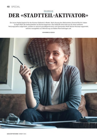 DER «STADTTEIL-AKTIVATOR» Ein neues Kapitel beginnt für das Konnex-Gebäude in Baden. Nach Auszug des Alleinmieters General Electric haben im April 2021 die Umbauarbeiten im Konnex begonnen. Das Gebäude wird nicht nur für einen weiteren Nutzungszyklus aufgerüstet, sondern es wird ein grundlegend neues und spannendes Multi-Nutzer-Konzept angestrebt, welches massgeblich zur Aktivierung von Baden-Nord beitragen soll. VON REBECCA OESCH