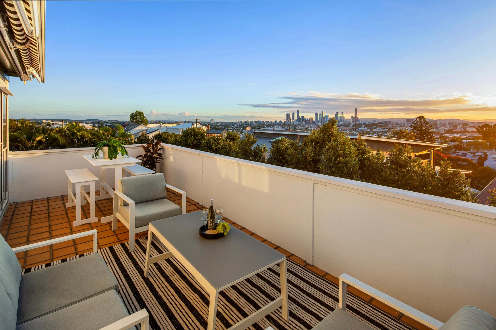 Nestled on an elevated 539sqm block, this doublestorey residence boasts captivating city vistas just 5kms from Brisbane's CBD. Immerse yourself in the laid-back ambience of the lovely front porch, complete with swing, or retreat to one of the four additional decks to soak in the panoramic views