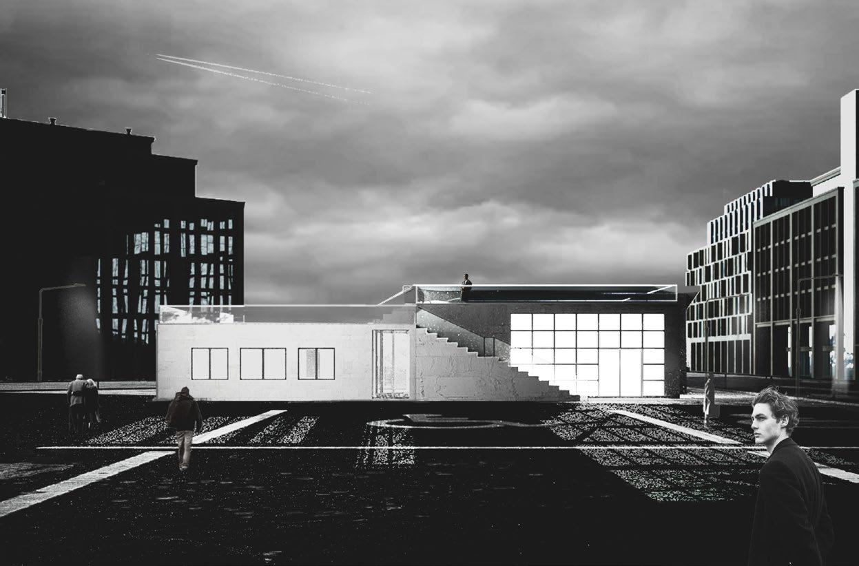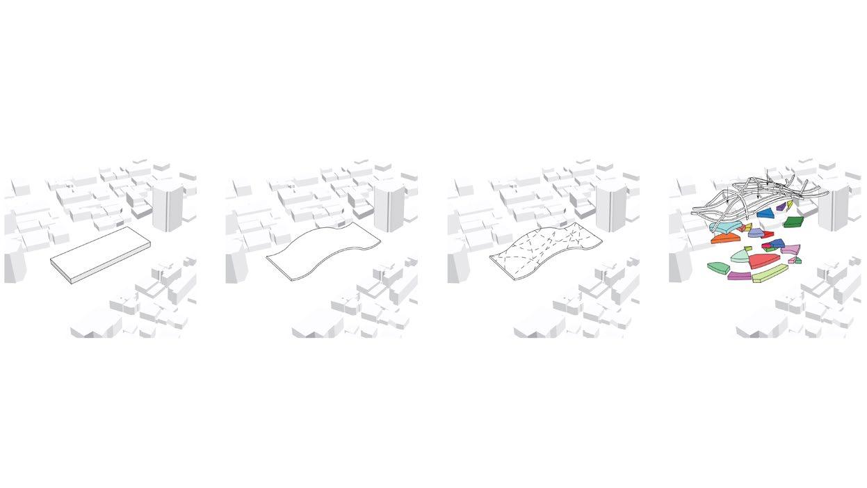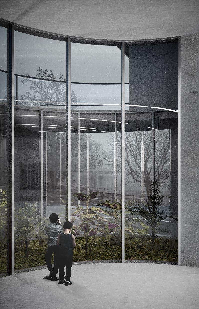 First glass, are allocated base on the path of lighting along Y axis shaping the amuse and hall zone with centre court. Second glass, reducing the area to adjust 300m2 under the competition rules. Third glass, X axis arrow come cross to make another zone office above the hall in plan. Fourth glass, the bevel arrow would cross into the hall. Those crossing arrows would transmissive a point crossing the traid layer glass toward south where outside court space and parking are connecting as outside assembly.