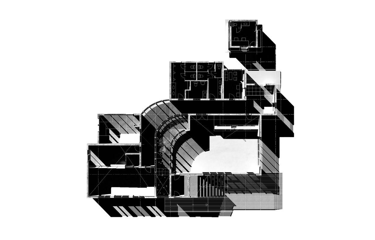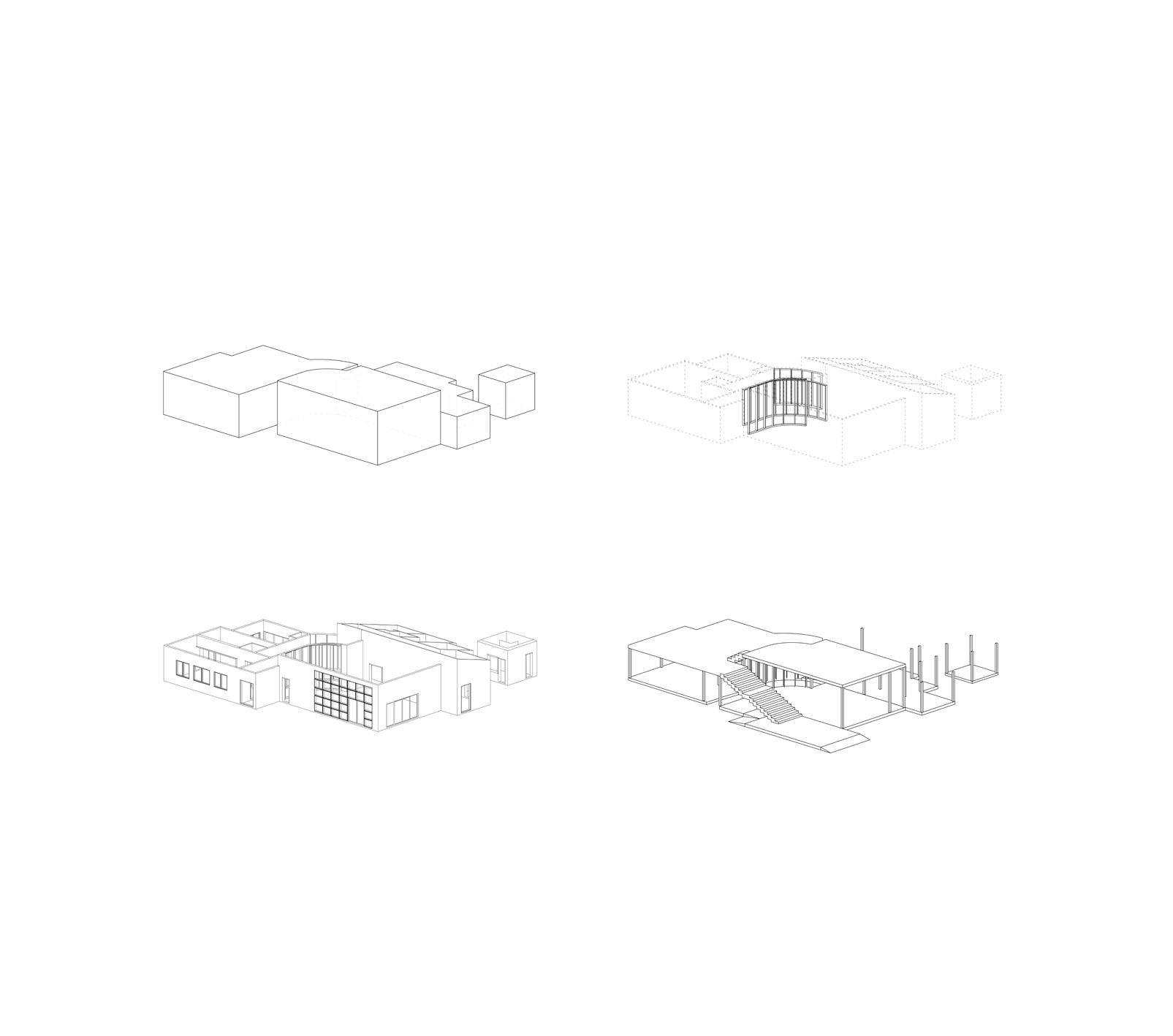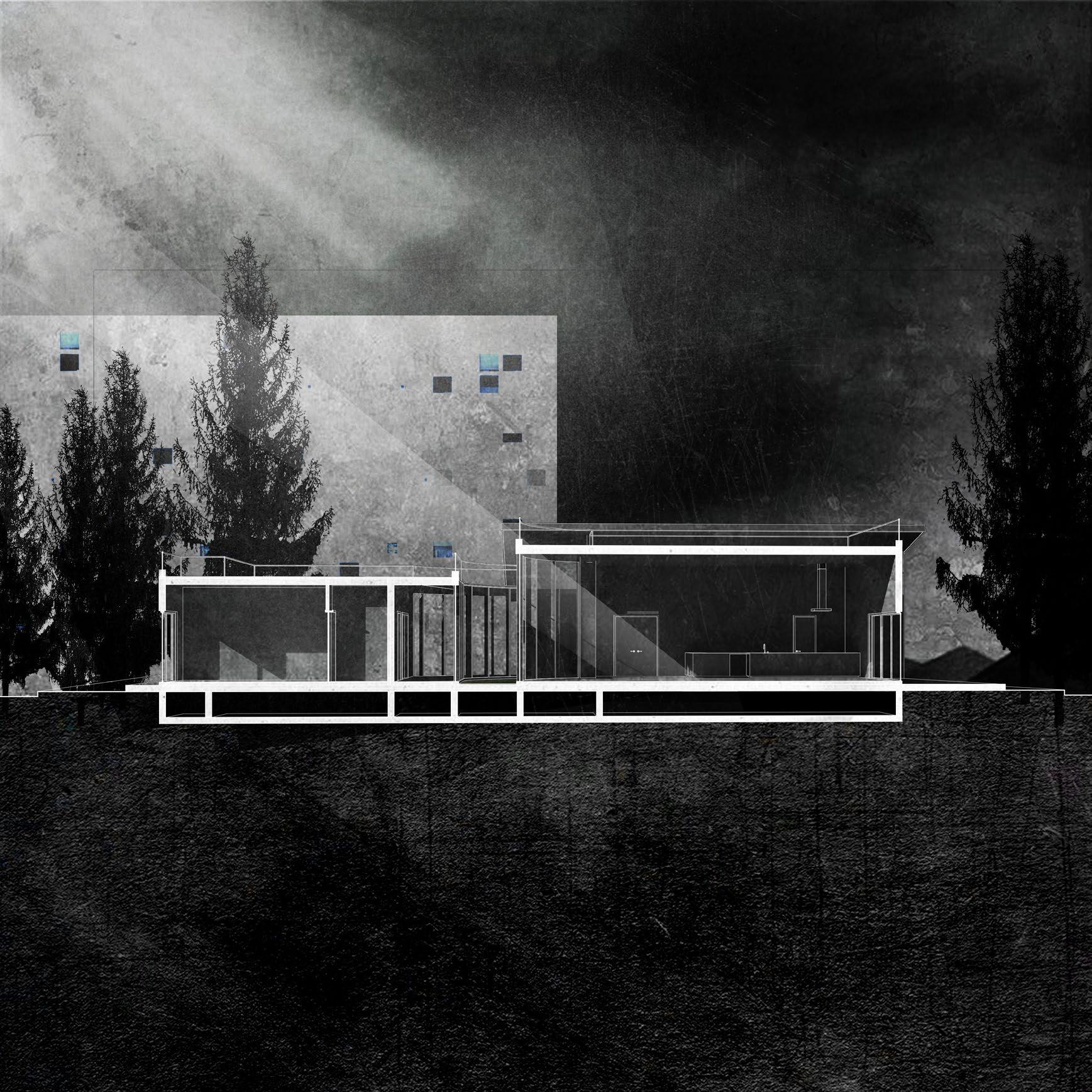 First glass, are allocated base on the path of lighting along Y axis shaping the amuse and hall zone with centre court. Second glass, reducing the area to adjust 300m2 under the competition rules. Third glass, X axis arrow come cross to make another zone office above the hall in plan. Fourth glass, the bevel arrow would cross into the hall. Those crossing arrows would transmissive a point crossing the traid layer glass toward south where outside court space and parking are connecting as outside assembly.