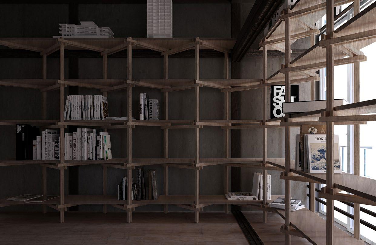 Cellar is usually made for wine to store in dry and dark displaying on grid. Storing books like that would be beyond the logic of bookcase. The book-cellar has ventilation and display abilities. Each spacecouldbesharedasoneofficebeingconsistentinsideenvironmentbetweentwosidewindows.