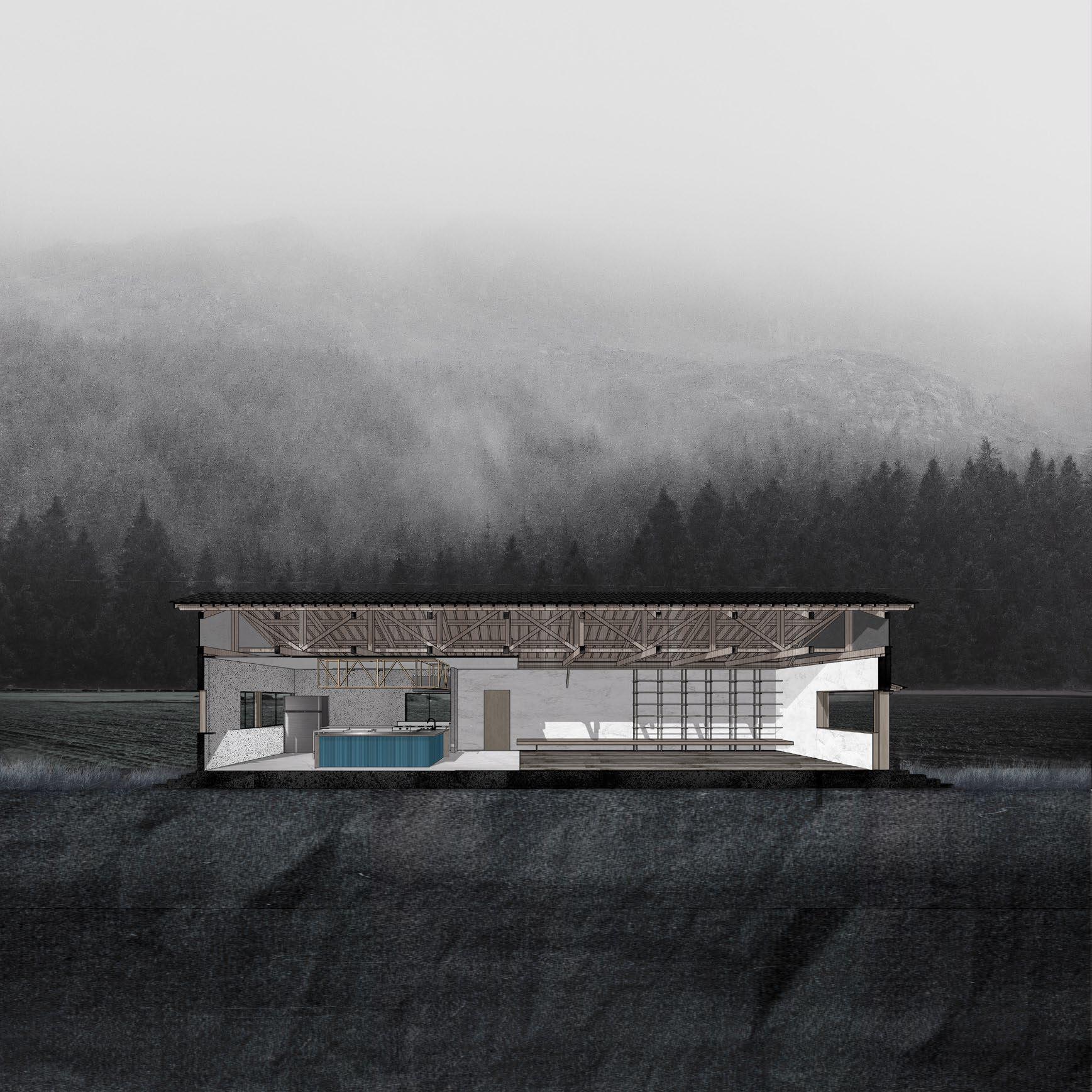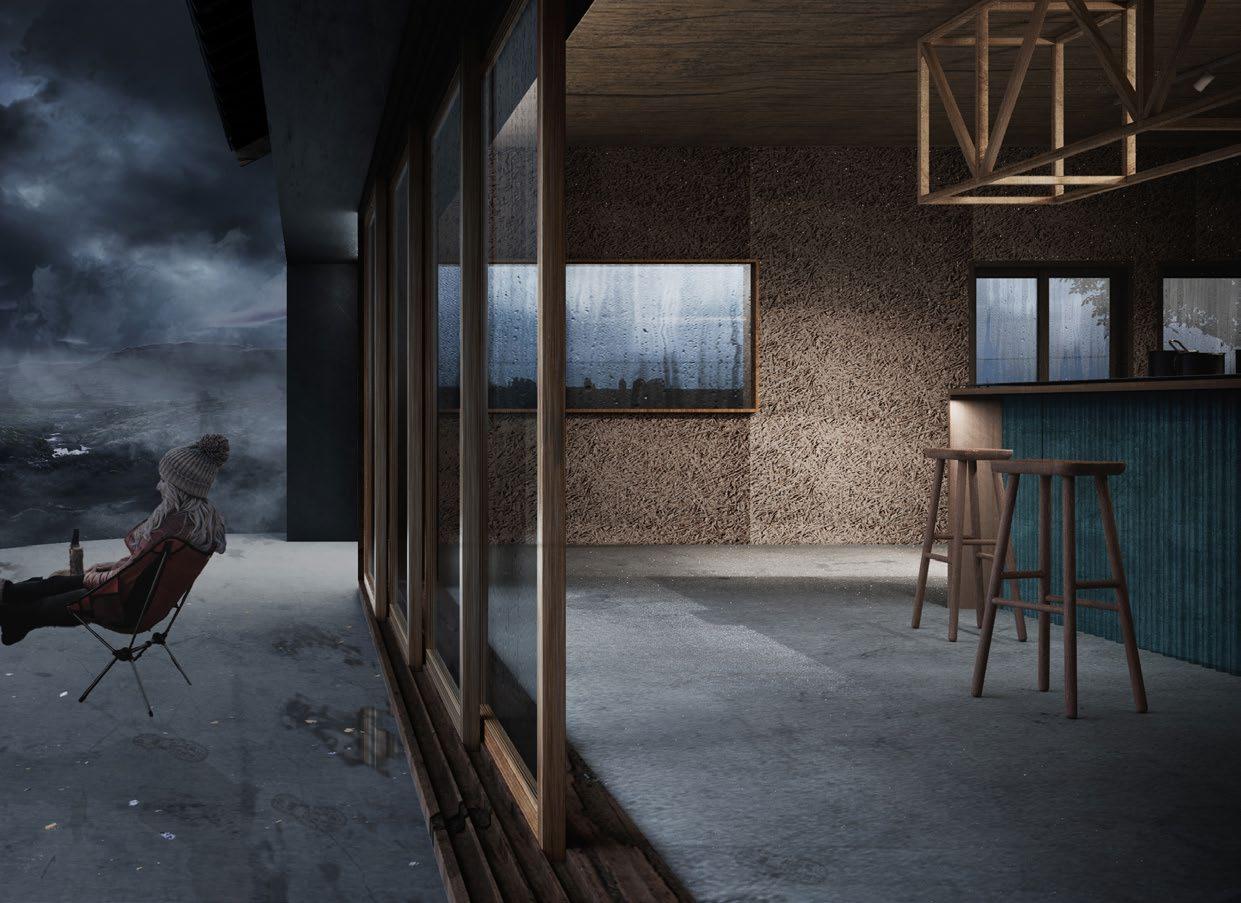 Kitchen counter finished by metal waved with water painting to represent the farm colour, the territory should be extended out by dirt concrete floor toward the farm view. The kitchen room is laying bear as not only a part of the farm communities, but also the city workship like radio or kids experiences for the development of this city.