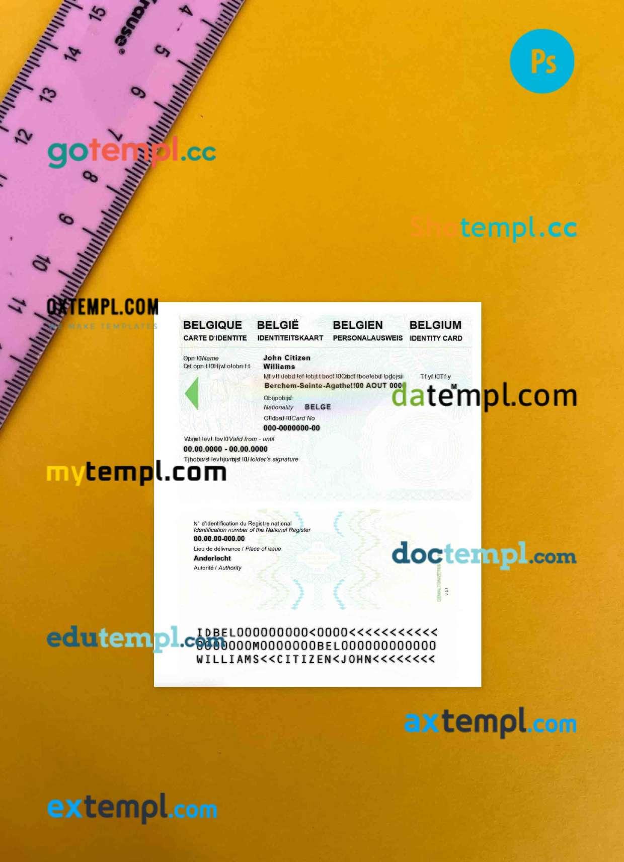 Our Belgian identity card template offers two editable variants in one package: editable PSD files for both photo and scan looks. Compatible with Adobe Photoshop, this template is fully customizable, requiring only basic editing knowledge to personalize.